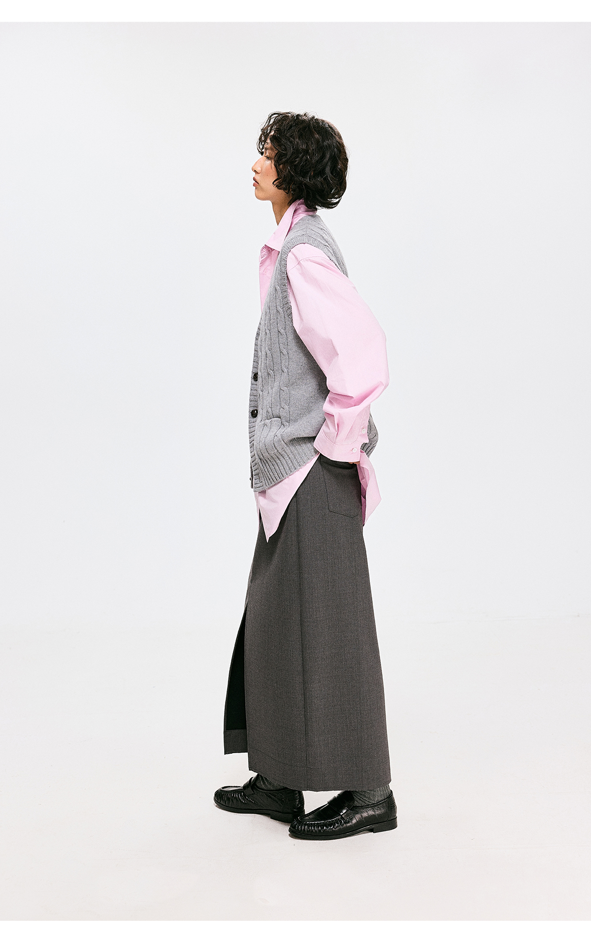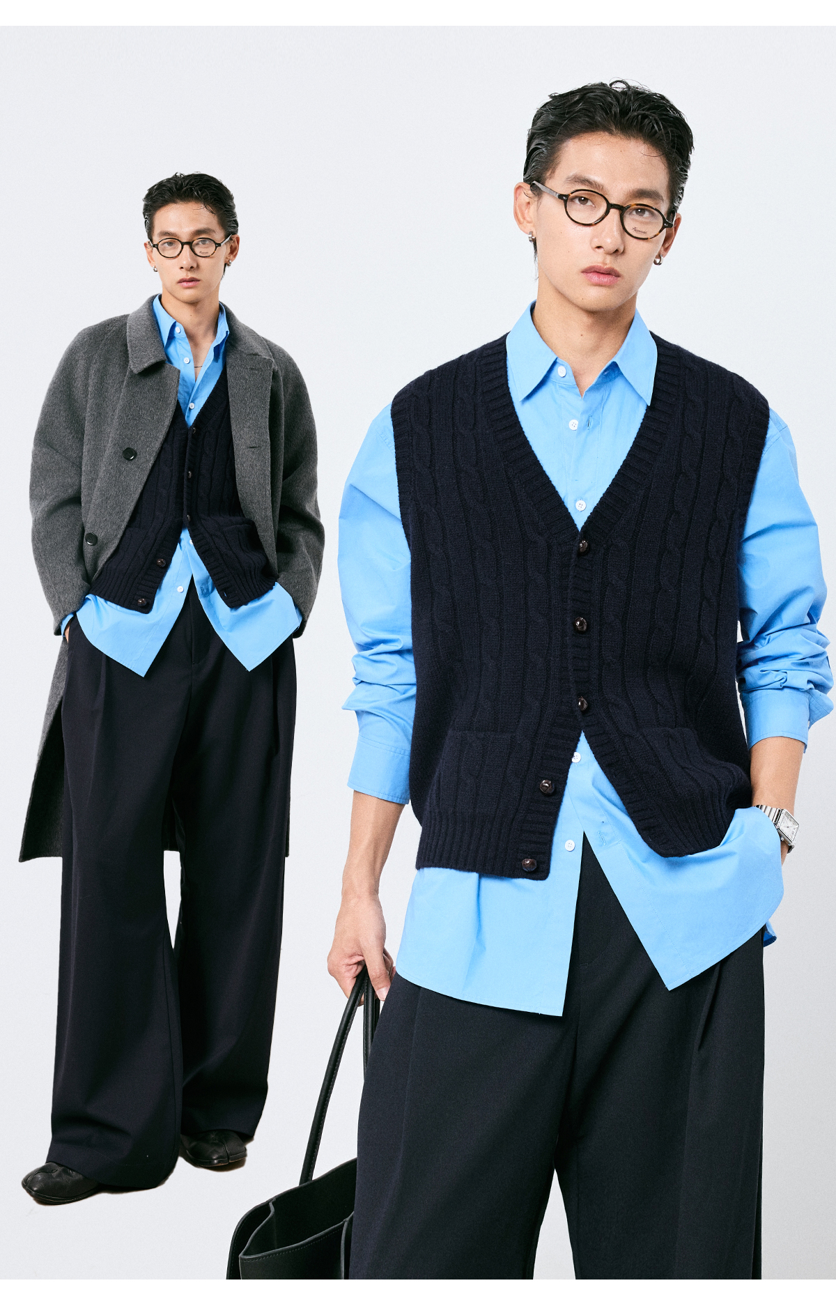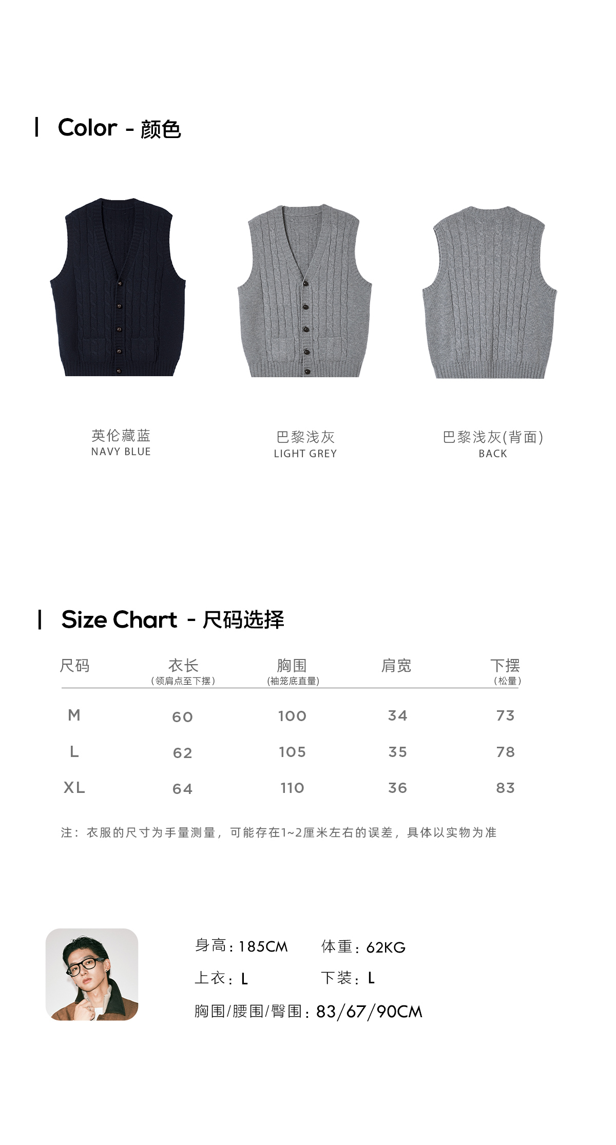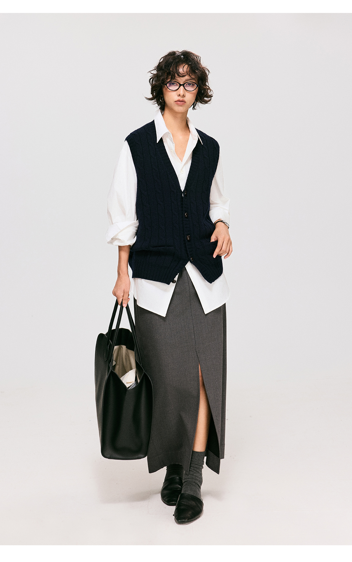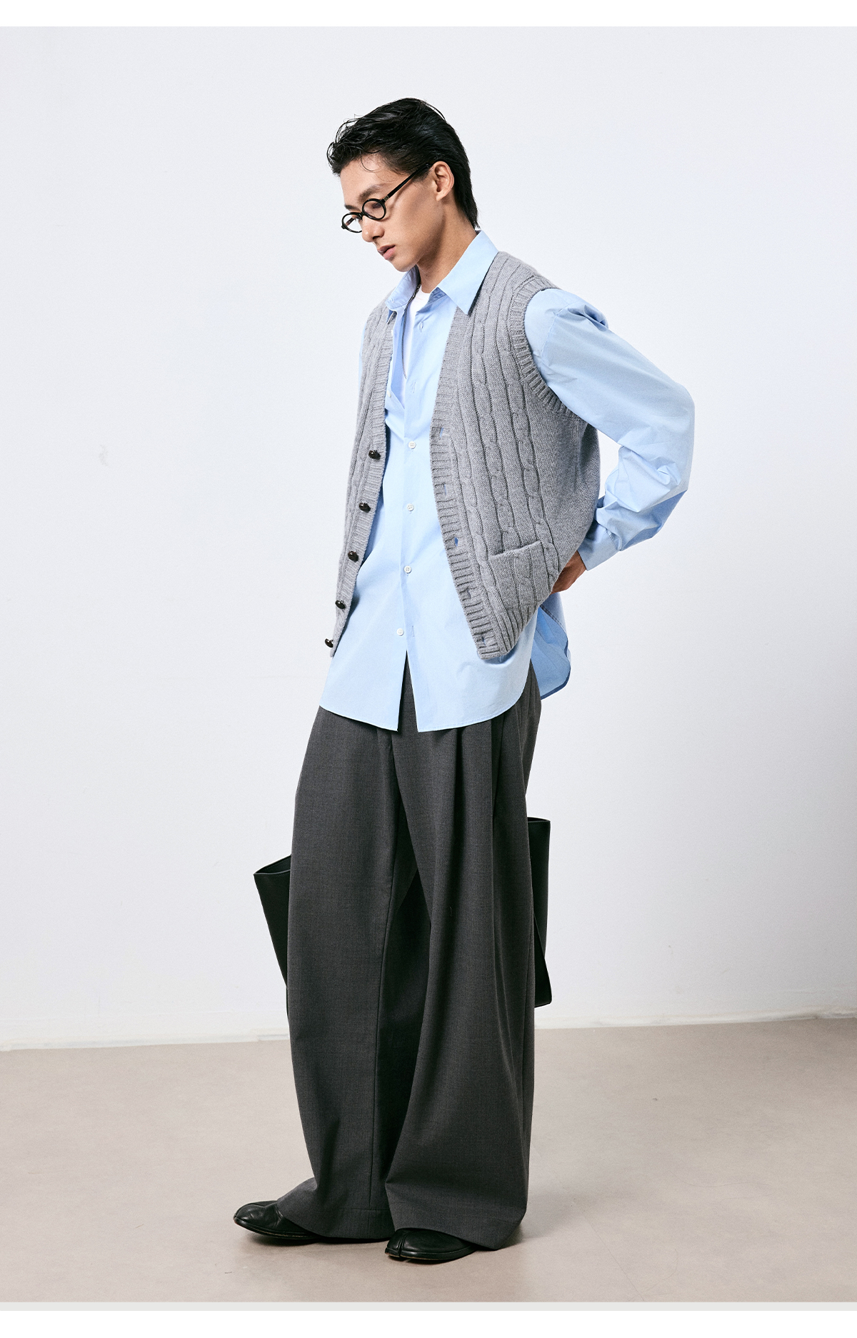 棉仓3661026002-【层序之间】灰色v领针织马甲全羊毛绞花叠穿背心开衫