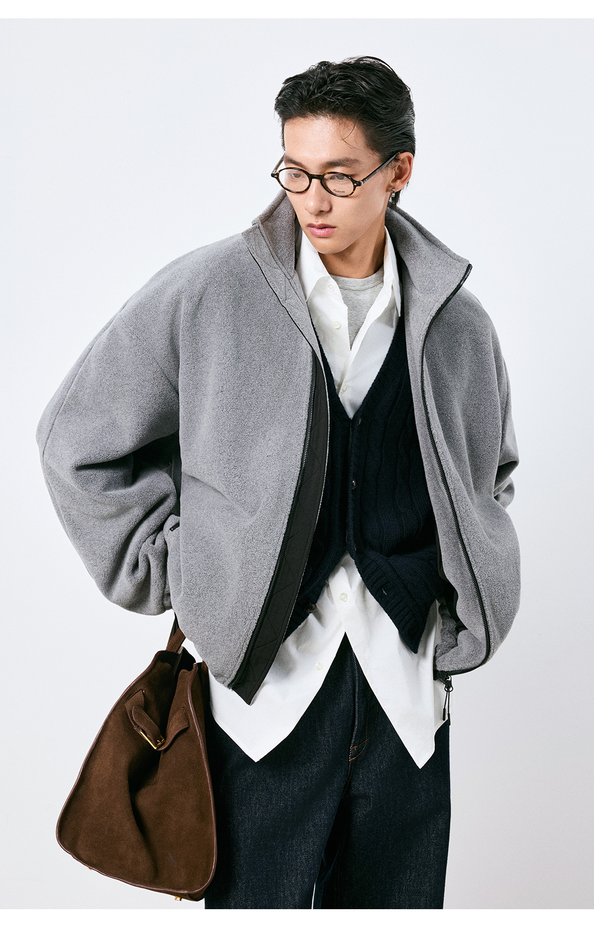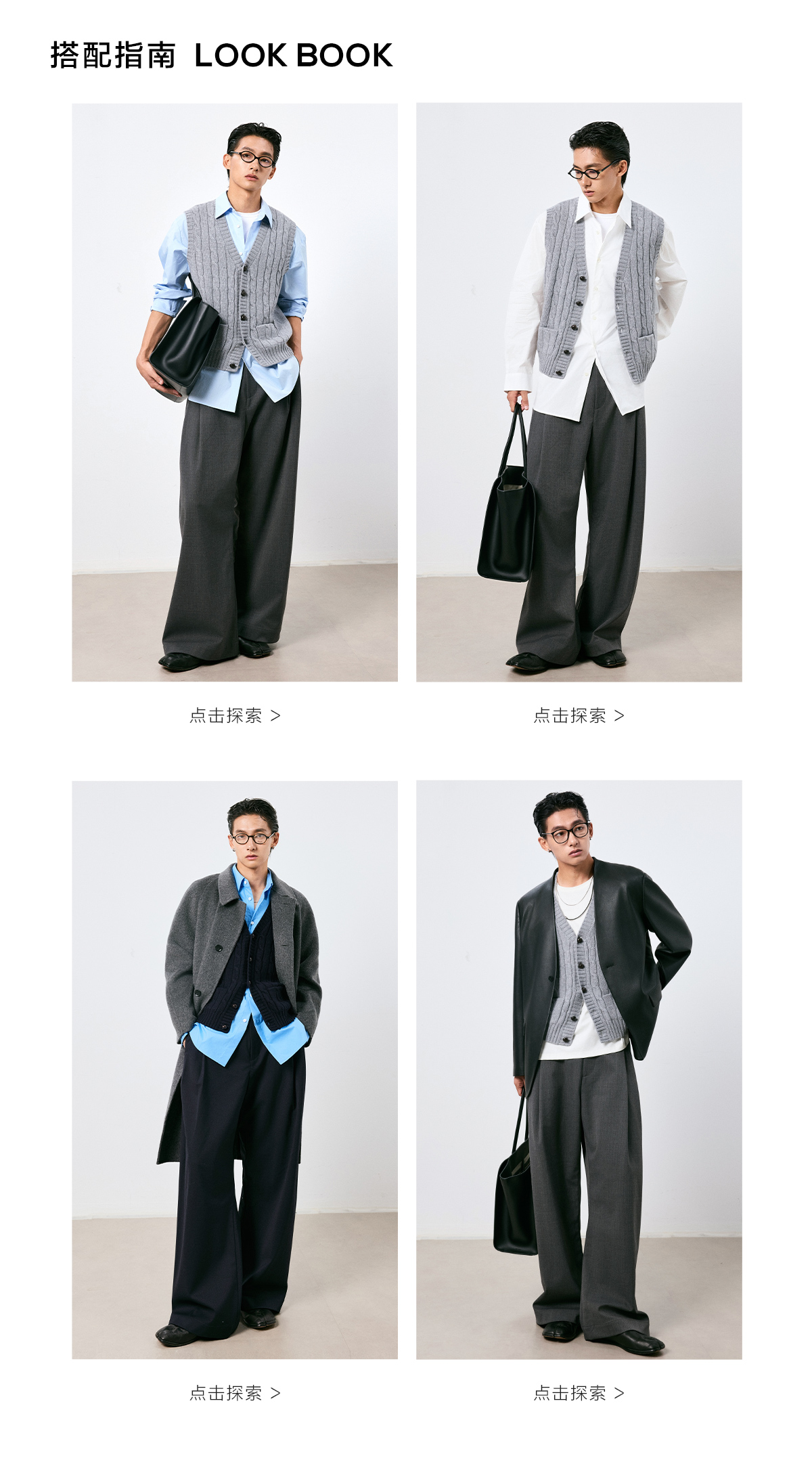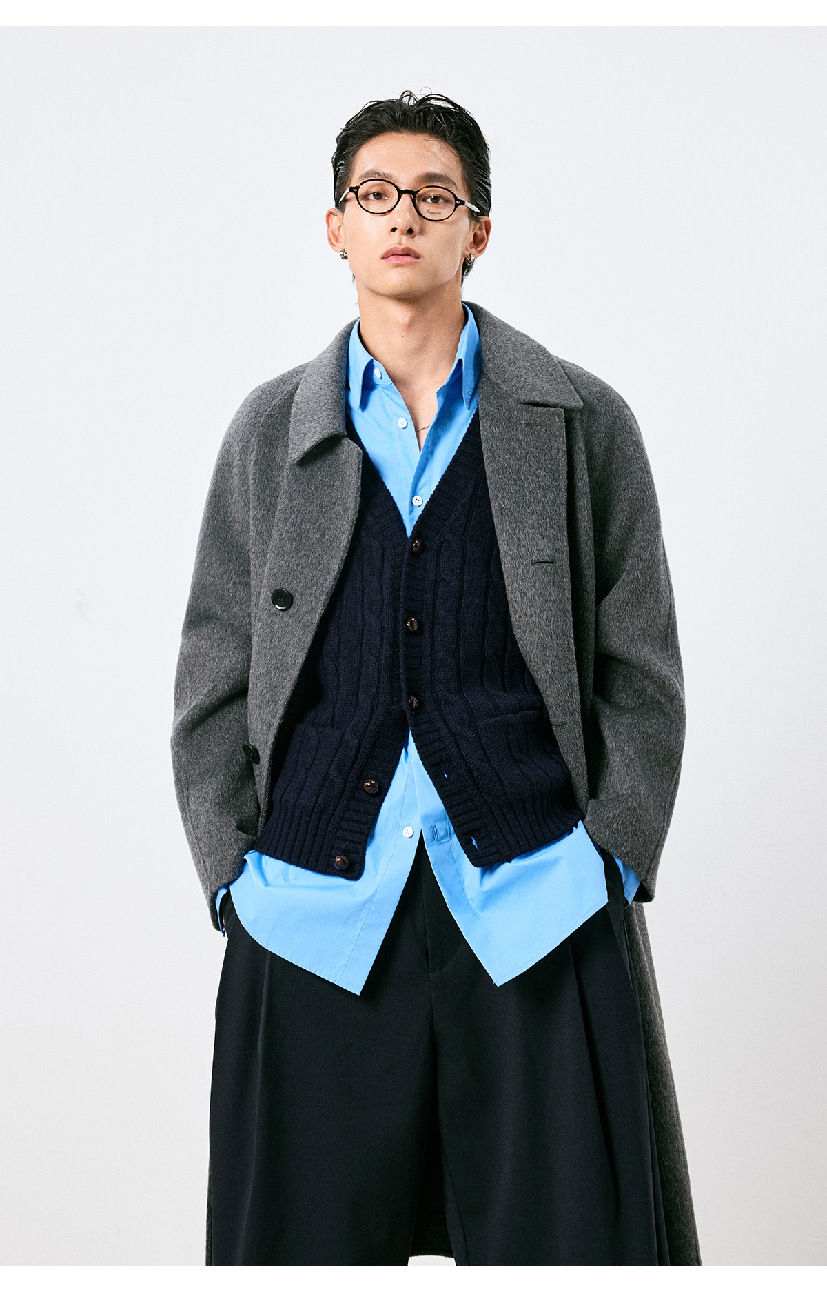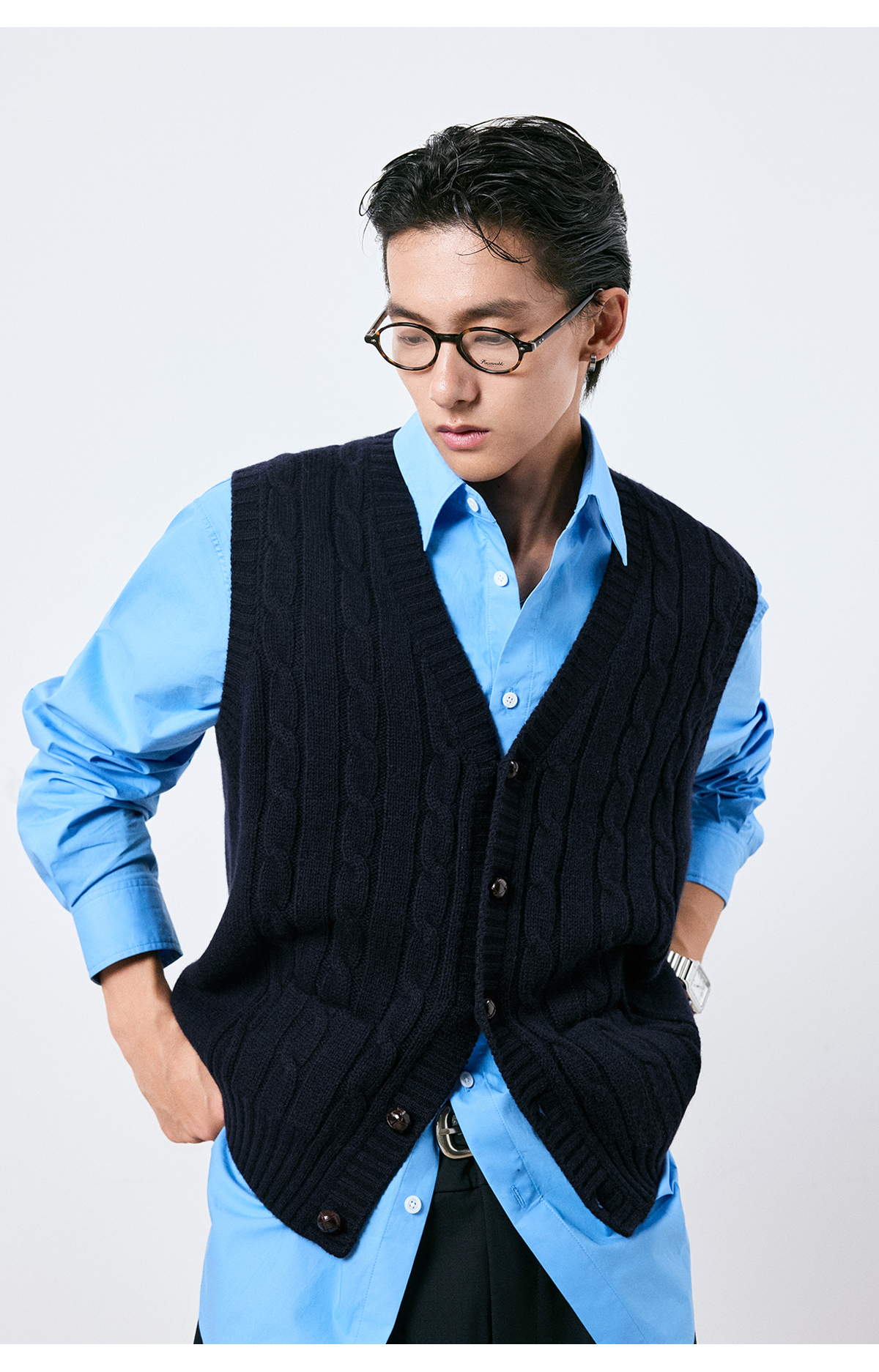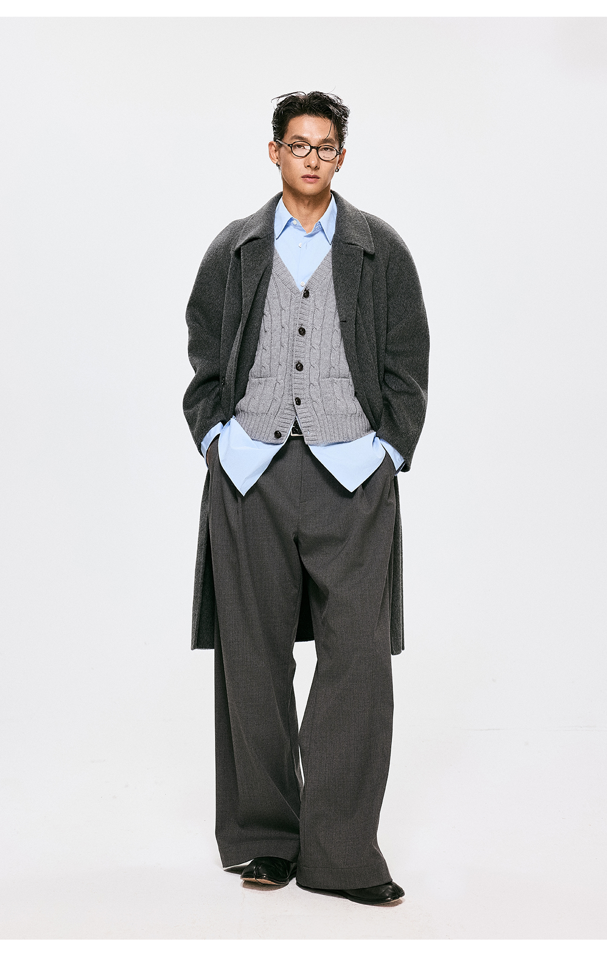 棉仓3661026002-【层序之间】灰色v领针织马甲全羊毛绞花叠穿背心开衫