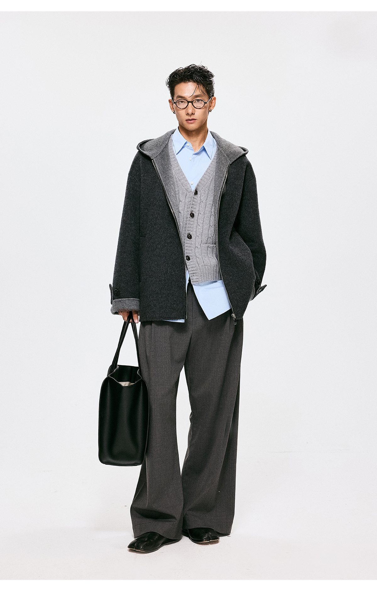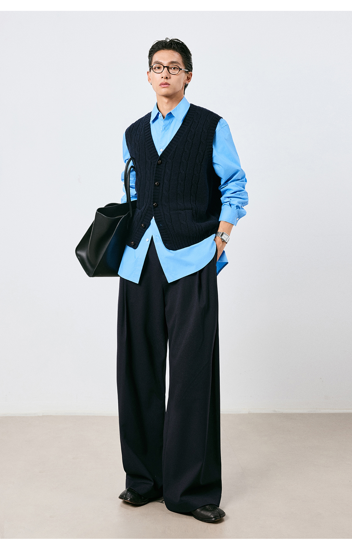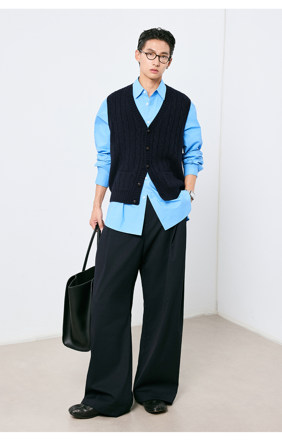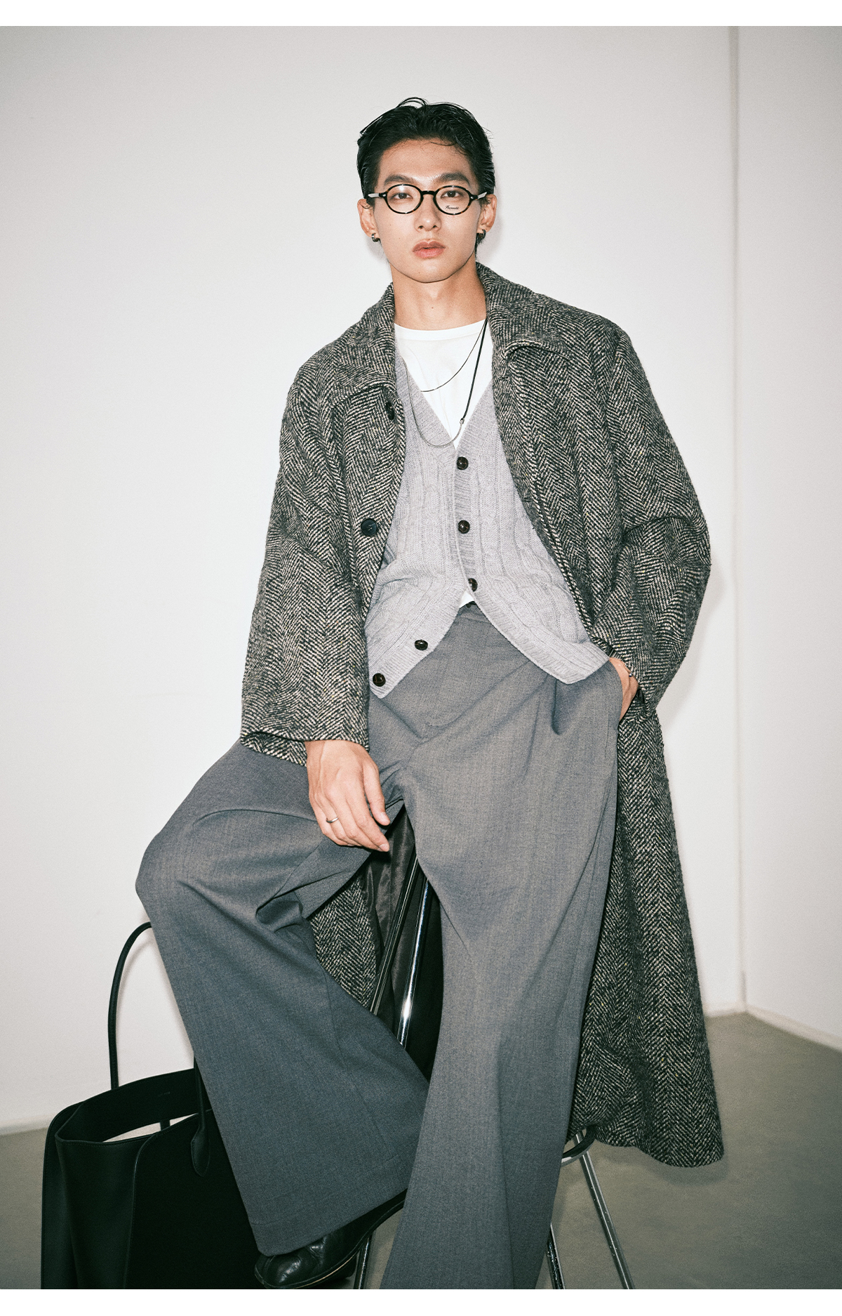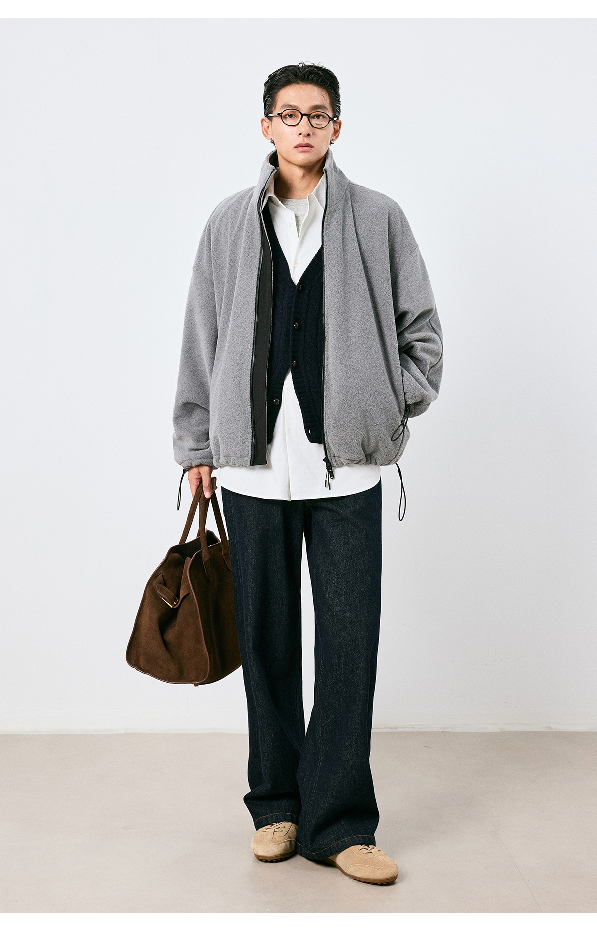 棉仓3661026002-【层序之间】灰色v领针织马甲全羊毛绞花叠穿背心开衫
