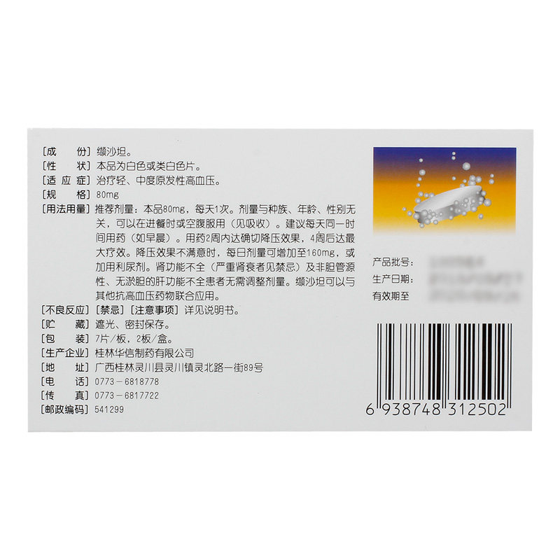 缬欣*80mg*14片/盒中度原发性高血压降血压高冠心病高血圧心绞痛头痛头晕血压病轻中度高血压病