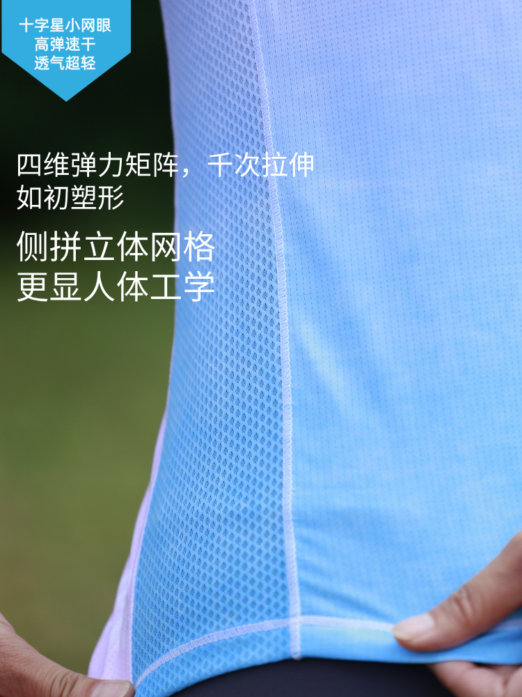 使用意大利MITI公司进口优质十字星轻量透气网眼布,使得跑服轻薄、速干、透气、服帖、高弹。
