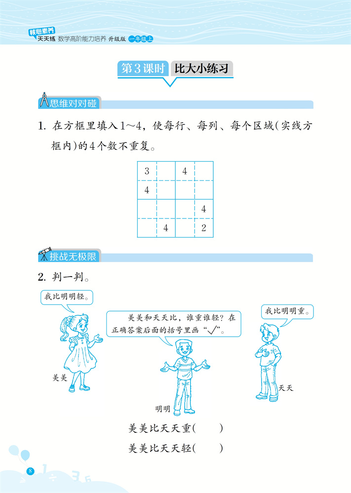 本书根据义务教育数学课程标准及相应的教材编写,是在教材及配套作业本内容基础上的提升。全书以教材中的关键问题为主线,把一些比较零碎的知识点串成线,编排相应的练习,发展学生的知识、技能、情感、态度与价值观。本书的一大特色是重视学生问题意识的培养,希望学生能养成独立思考、独立判断,思维缜密,并能多角度、辩证地分析问题,以及做出选择和决定的良好习惯。全书按课时编写,配以单元练习和期末综合练习,每个练习分层设置不同难度的两个栏目;思维对对碰;挑战无极限,突出对数学核心素养的培养。对书中比较灵活的数学问题,配了提示、思路及详细解答,以帮助学生去思考、解答。本书配人教版教材,供一年级学生第一学期使用。
