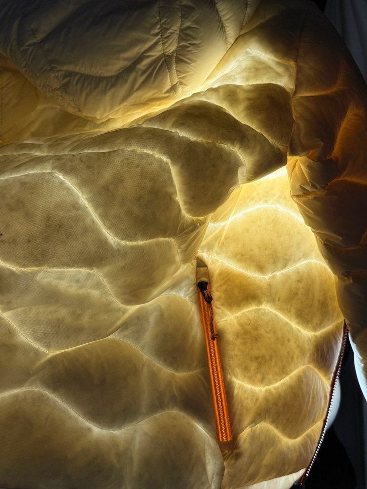 相比于传统缝线,它的波浪绗缝线可以把填充的羽绒控制在更加合理的区域。