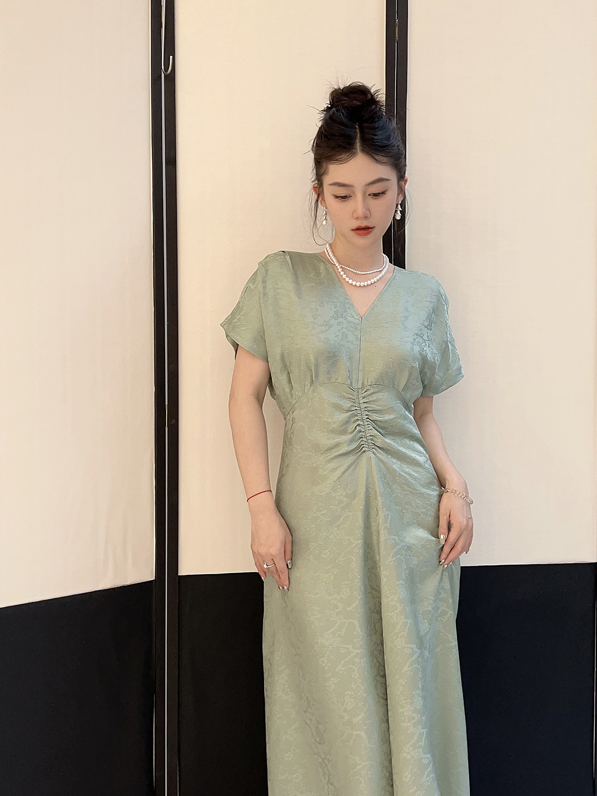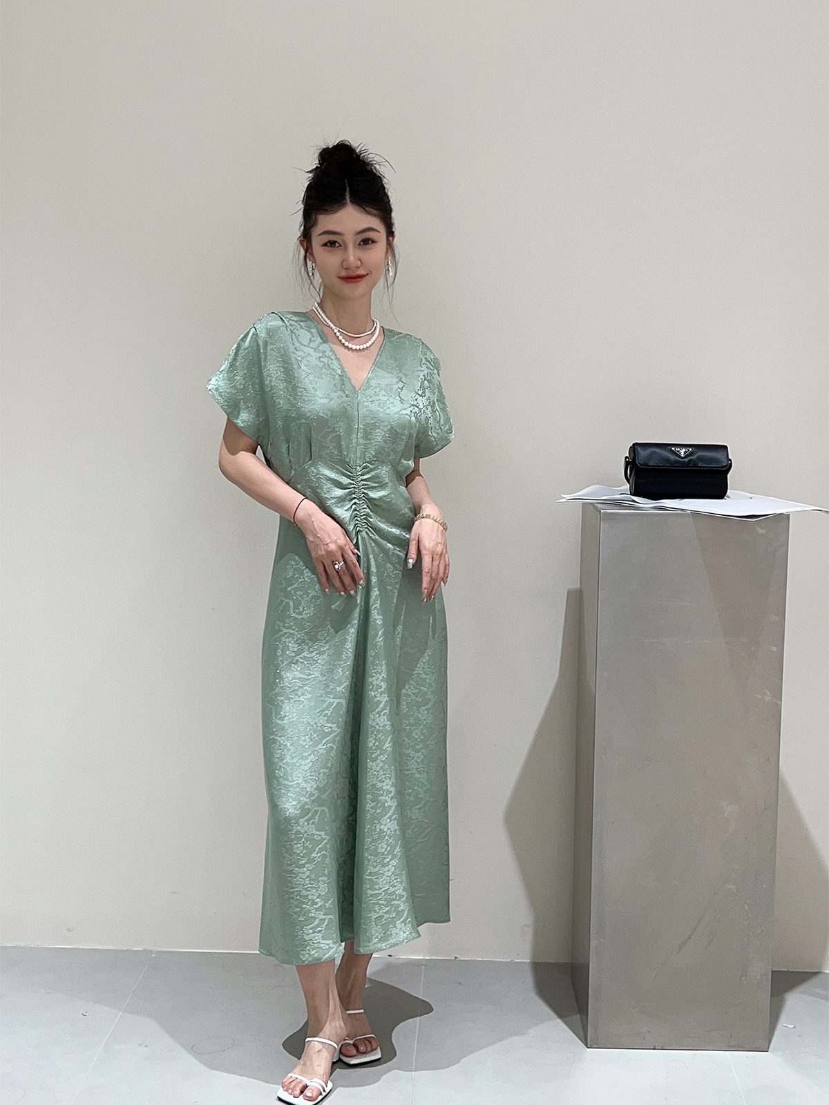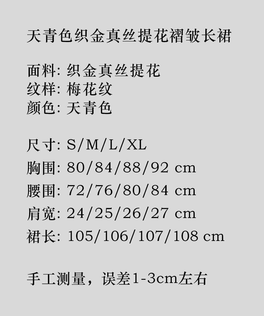 盛唐牡丹 |天青色织金真丝提花褶皱长裙