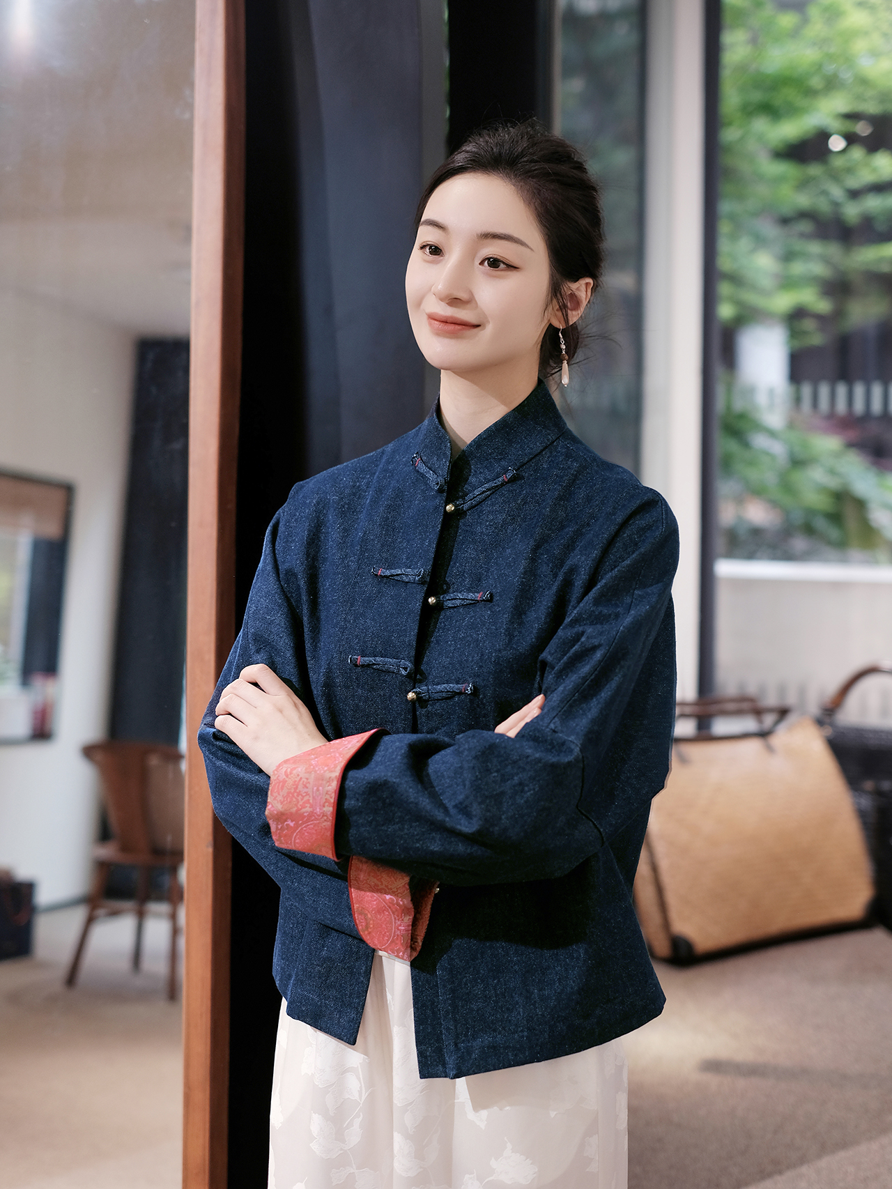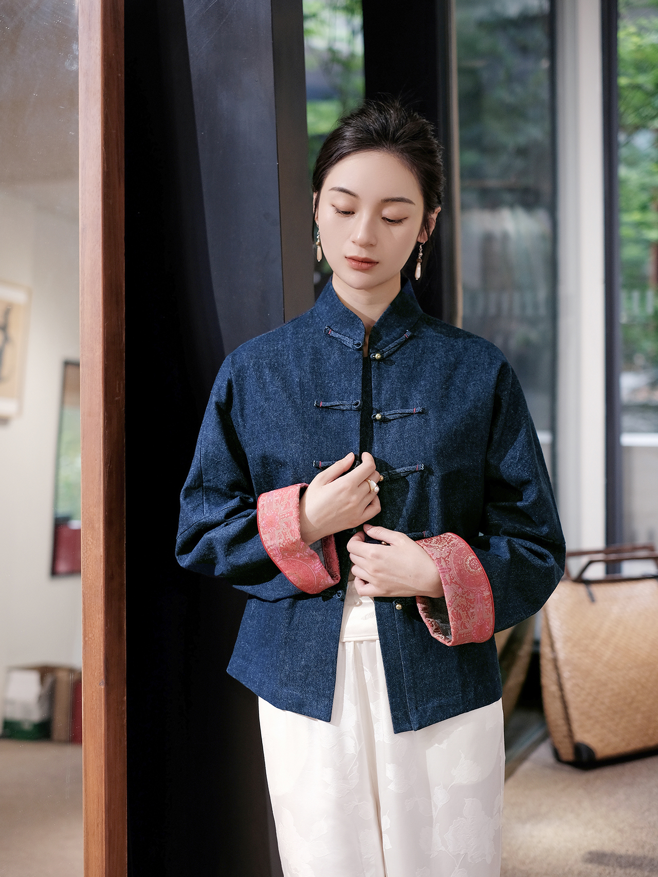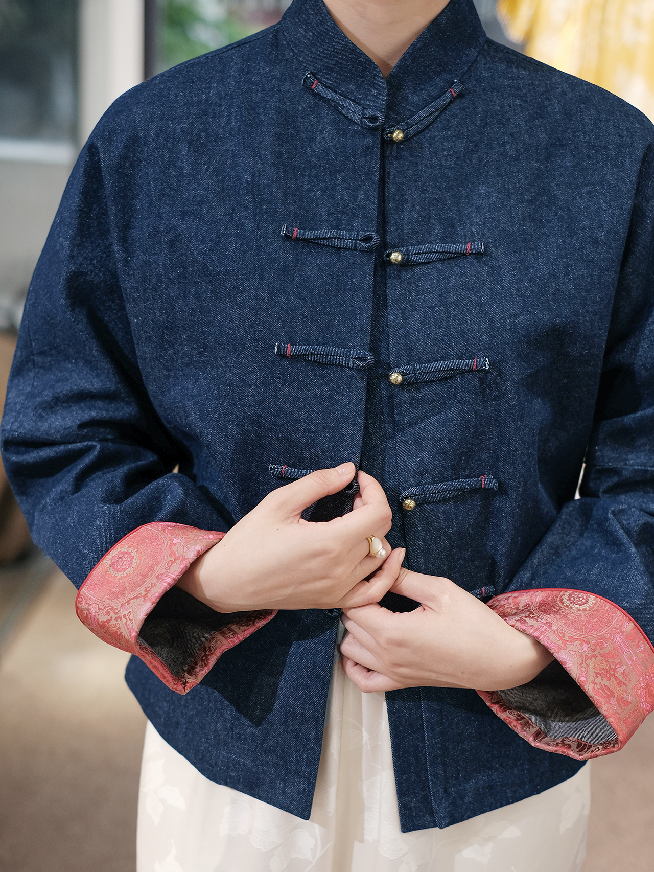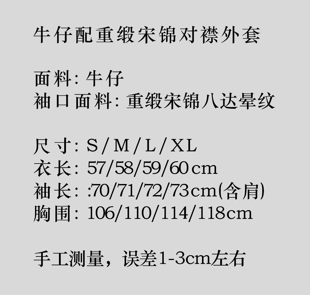 盛唐牡丹 |牛仔配重缎宋锦对襟外套-红色/黄色袖口可选(浅色牛仔)