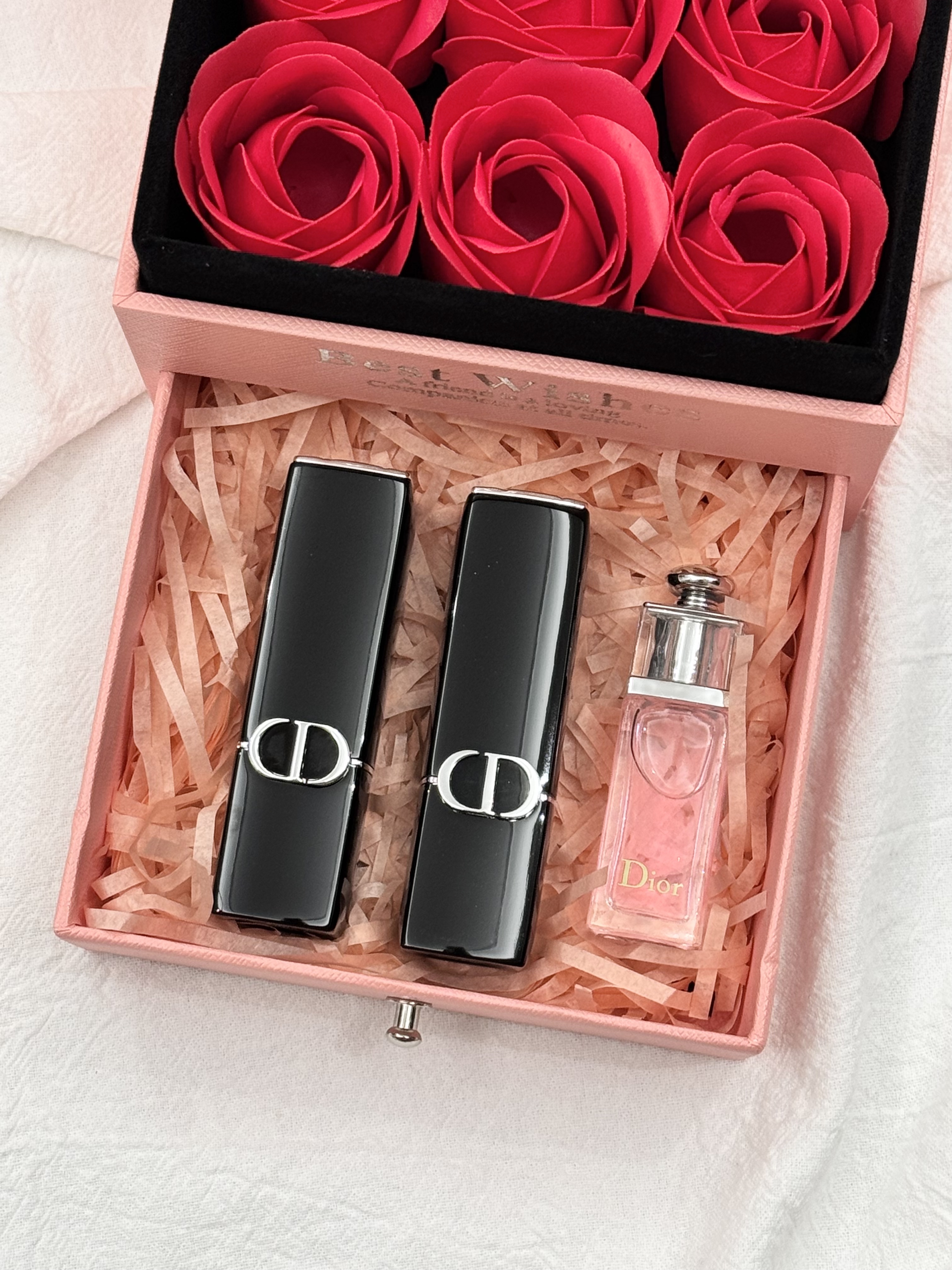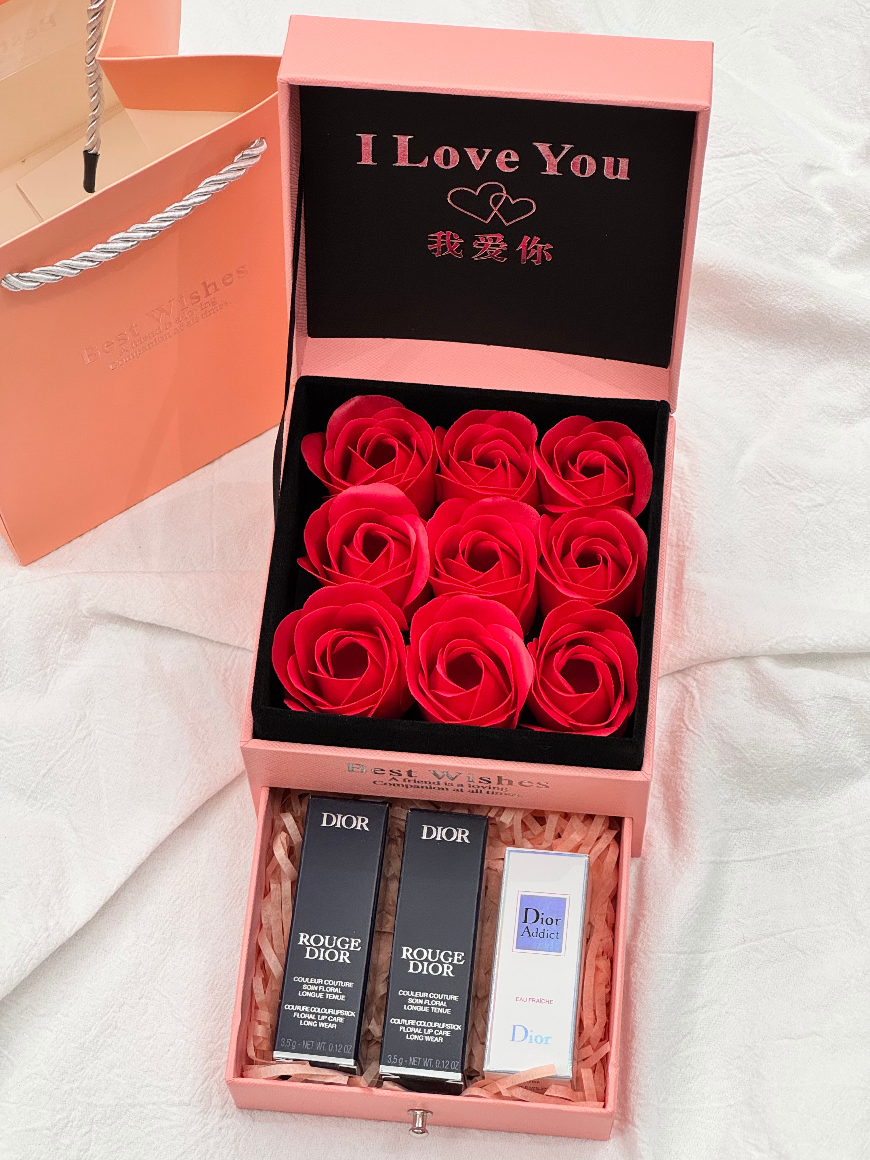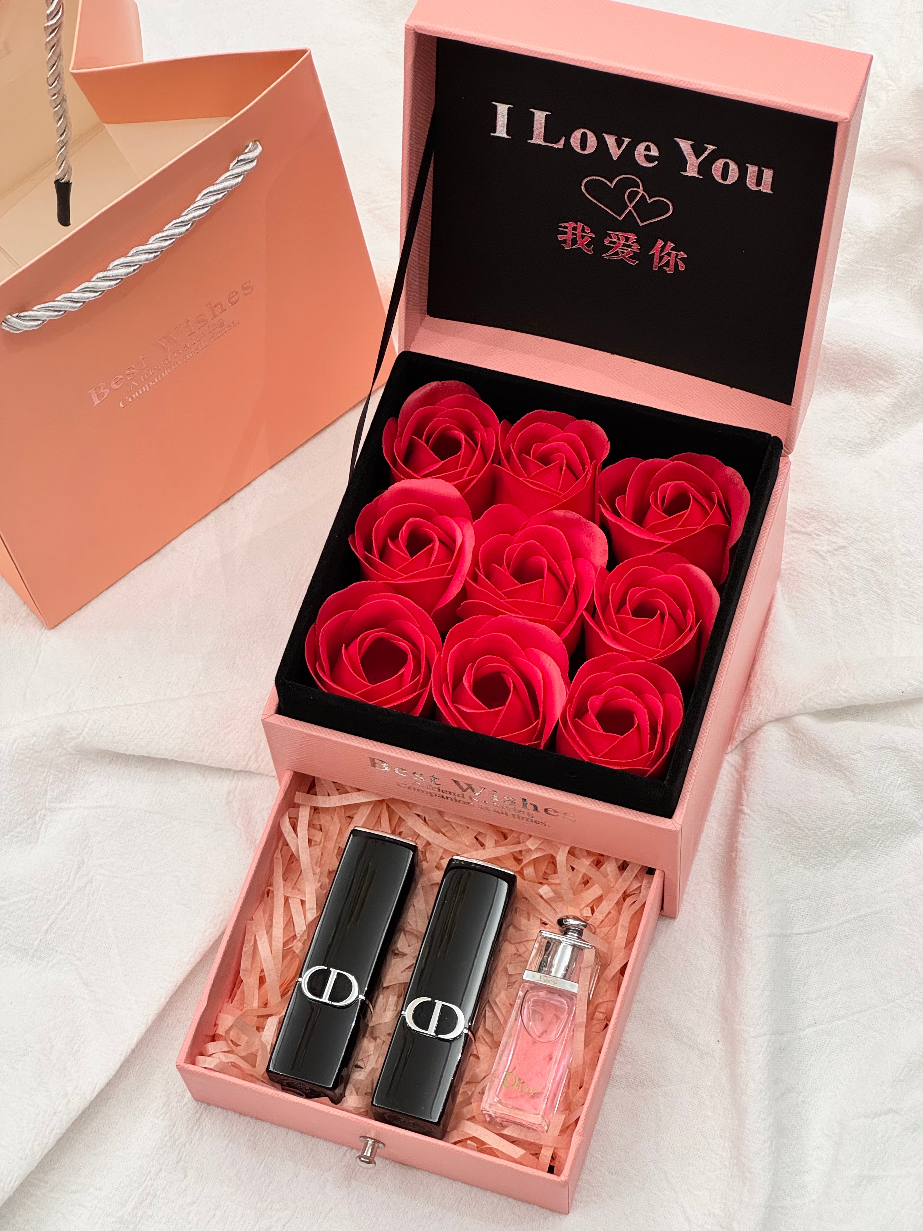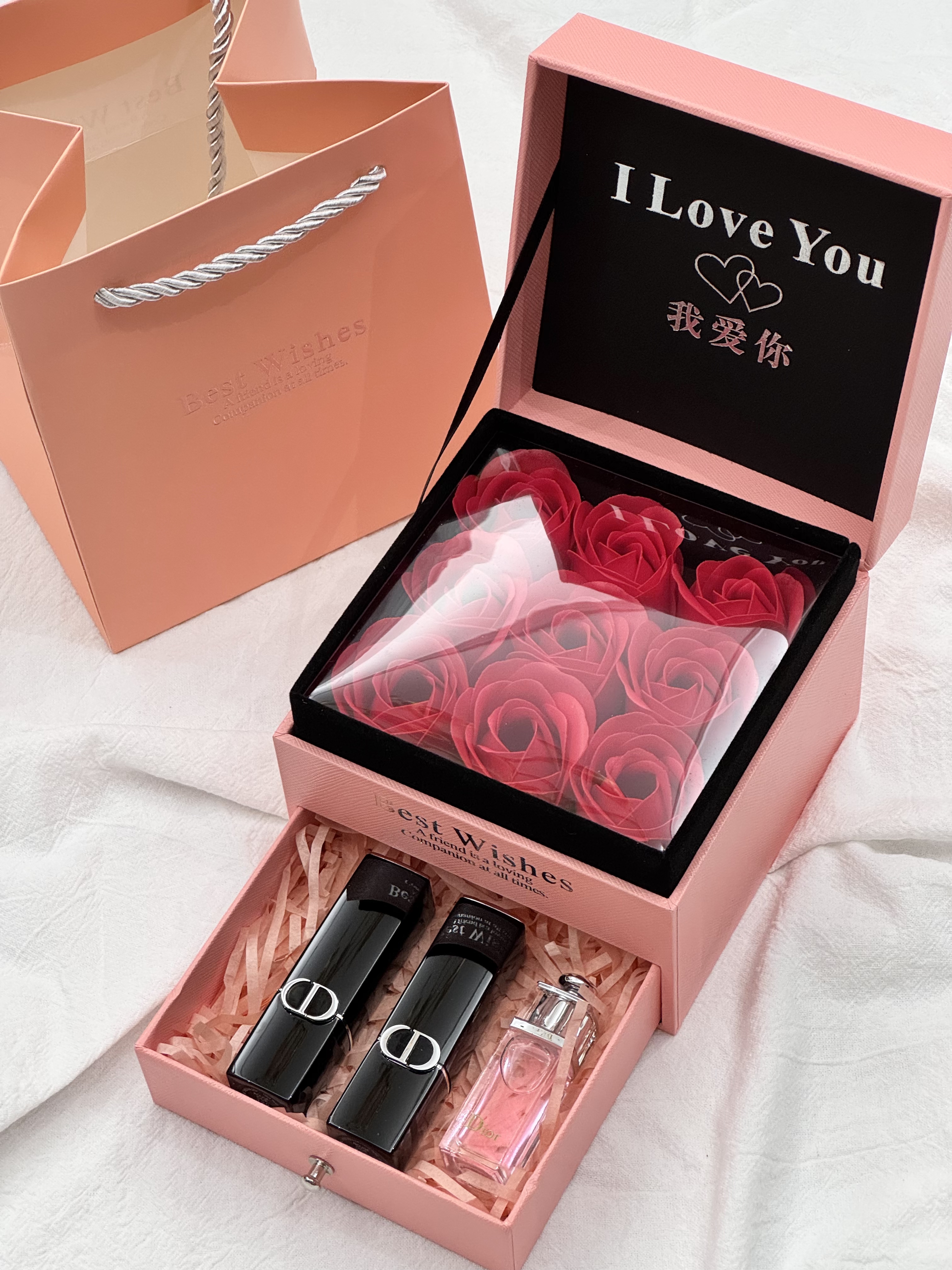 #关于礼物,我选了很久,但‘你喜欢’这件事,??我从没犹豫过,玫瑰的仪式感真的能让女士们一眼上头!生活中总有不期而至的美好,为你的爱情助力,表白神器!不凋谢的永生花,就像不落幕的爱,感情升温神器无疑了~甜蜜指数将爆表#【磁吸魅惑玫瑰花抽屉礼盒】兄弟姐妹萌冲!开盖即是惊喜,推开便是我们的甜蜜瞬间,爱是双向奔赴,就像这扇门,轻轻一开,你和我,刚刚好!1磁吸丝绒口红720#色号+磁吸丝绒口红772#色号+粉魅惑香水5ml+拉菲草+贺卡这个搭配礼盒是醉不会踩雷的套盒了,自用或送人闭眼抢!炒鸡惊 艳!气质和美貌拿捏到位!送礼牌面!错过真的肠子悔青!细节贼到位!讲真每次掌柜种草节日期间的彩妆礼盒,真的是种一次爆一次,每一次必爆单,口碑敲棒!