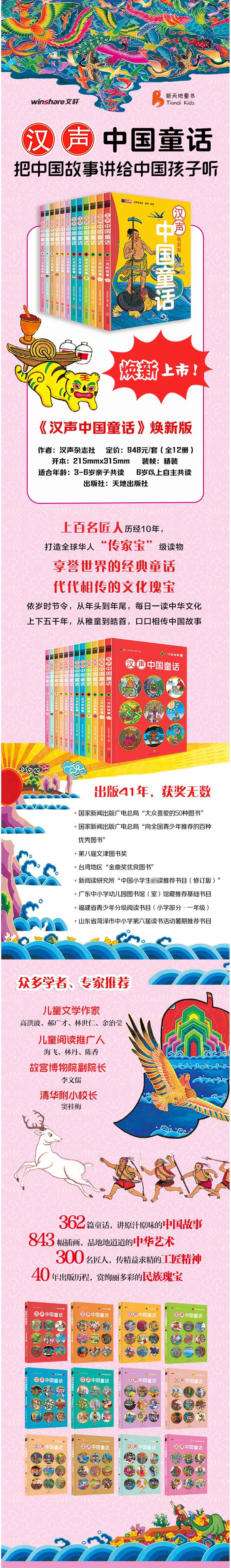 《汉声中国童话》按照传统农历岁时,每月一本,每天一则故事,全套12本,共362个故事,涵盖节日传说、民间故事、神话故事、历史故事、事物起源故事、科学故事等。 汉声杂志社深入民间,从浩如烟海的中国民间文化中,以童趣为标准,发掘、精选出这些故事,再以简单、浅显、亲切的文字,融入丰富的想象力编写而成。本丛书不仅以故事吸引孩子,每一幅插图也饱浸传统文化的精髓。汉声从传统年画、皮影、刺绣、壁画、雕塑石刻中汲取技法,以毛笔、宣纸细细描绘,将故事中*精彩的部分化为一幅幅鲜活灵动,具有传统风味的图画,让孩子能在阅读精彩故事之际,了解中华民间美术的精髓。 本丛书向上承接祖辈的精神,经过仔细咀嚼后再往下,诚信地交到新一代儿童手里。每天读一则老祖宗流传下来的“中国童话”,可以让中华文化在中国儿童心中扎根。