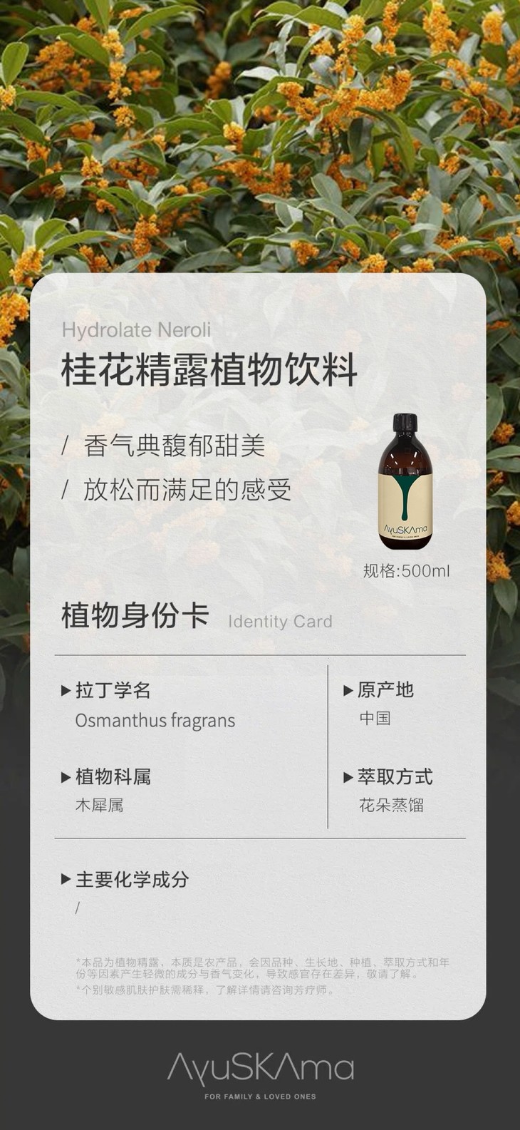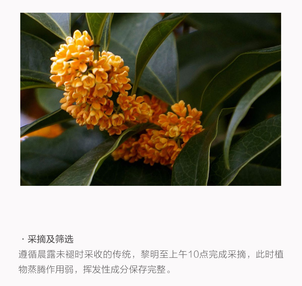 作为中国十大名花之一,桂花承载着2000多年的栽培历史,从宋代谢懋笔下绿云剪叶,低护黄金屑的雅致,到元代顾瑛金粟霏霏下如雨的灵动,它早已将清雅高洁的气质刻进国人的生活里。Ayu的桂花精露,是以核心产区的优质桂花为原料,历经传统花朵蒸馏工艺萃取而成,最大程度保留了桂花的天然香气与营养成分。