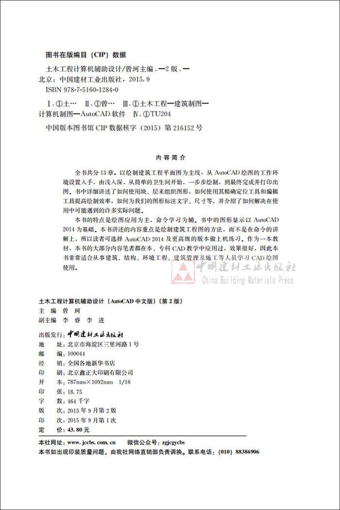 《土木工程计算机辅助设计·AutoCAD中文版·第2版》本书的特点是绘图应用为主,命令学习为辅。书中的图形显示以AutoCAD 2014为基础。本书讲述的内容重点是绘制建筑工程图的方法,而不是在命令的讲解上,所以读者可选择AutoCAD 2014及更高级的版本做上机练习。作为一本教材,本书的大部分内容笔者都在本、专科CAD教学中应用过,效果很好,因此本书非常适合从事建筑、结构、环境工程、建筑管理及施工等人员学习CAD绘图使用。