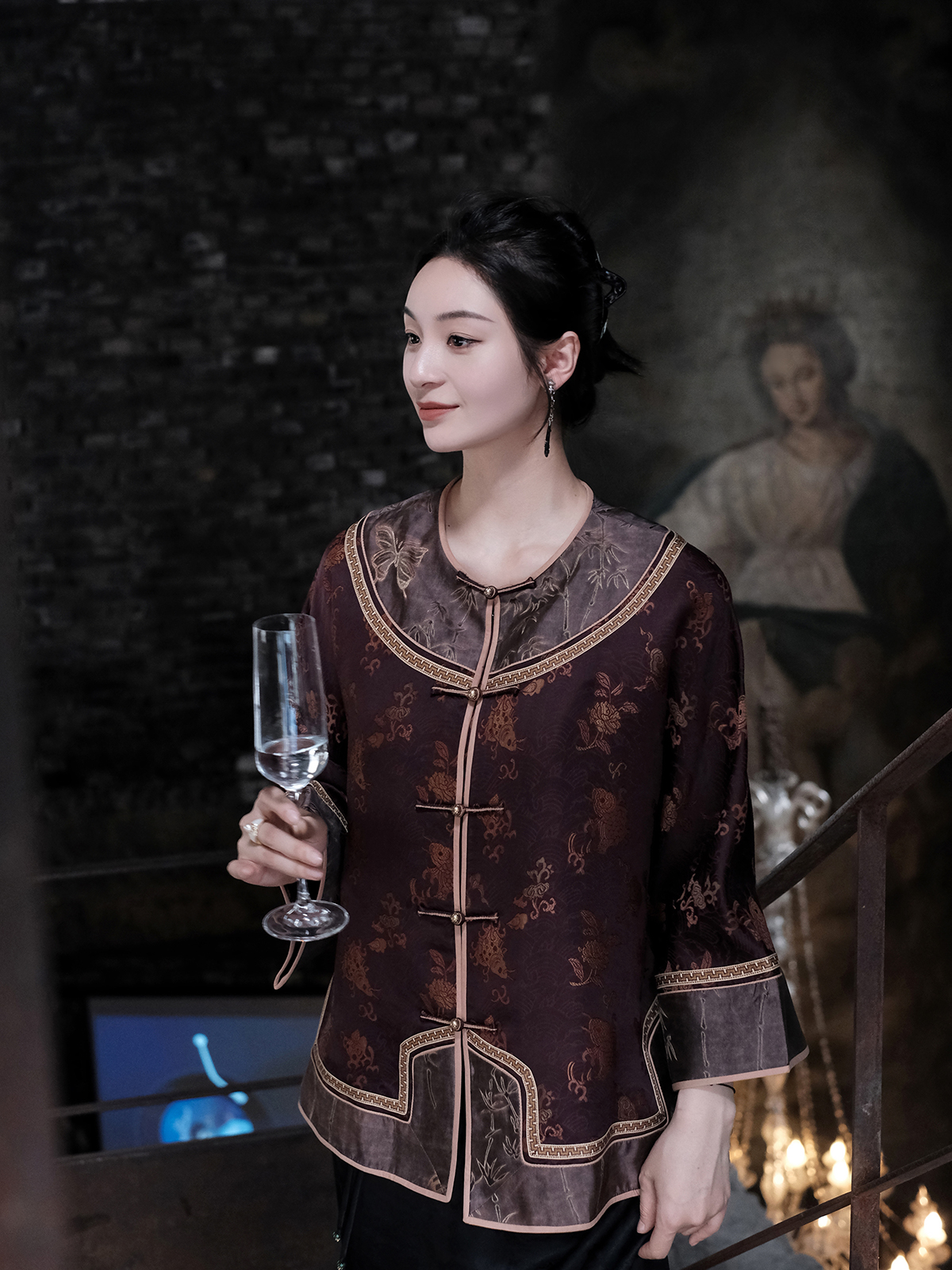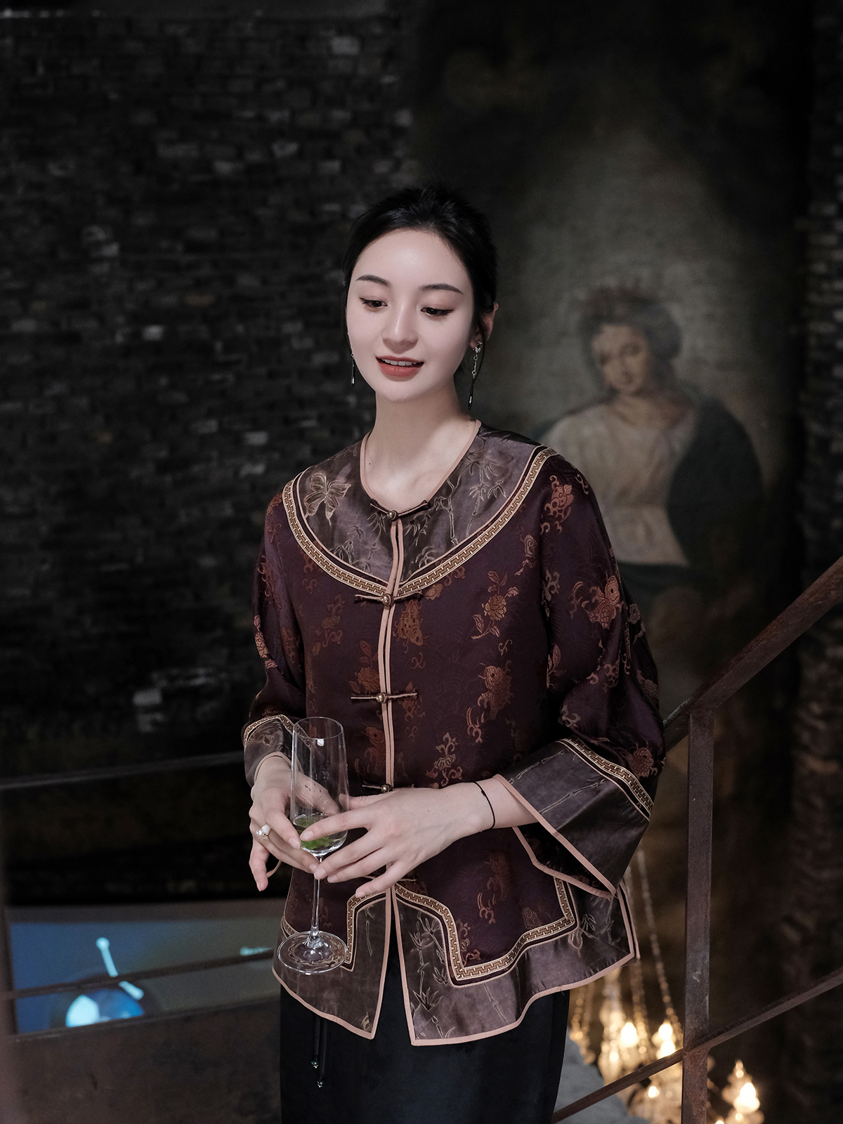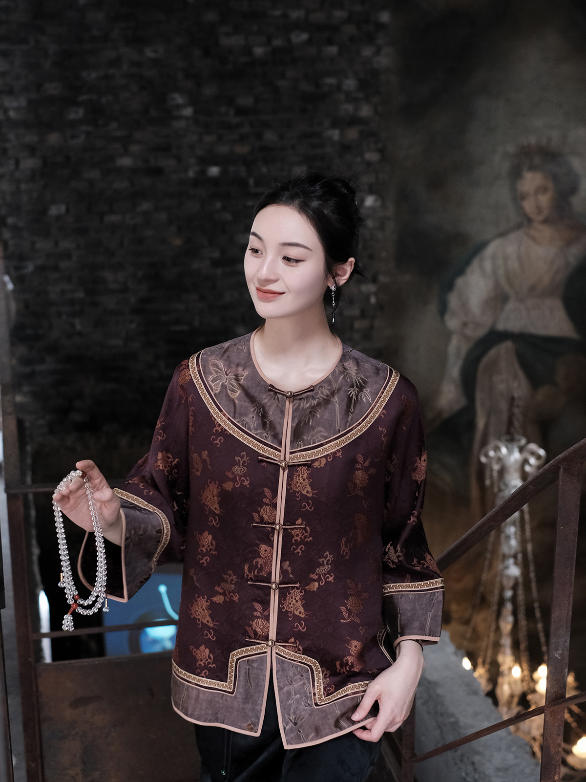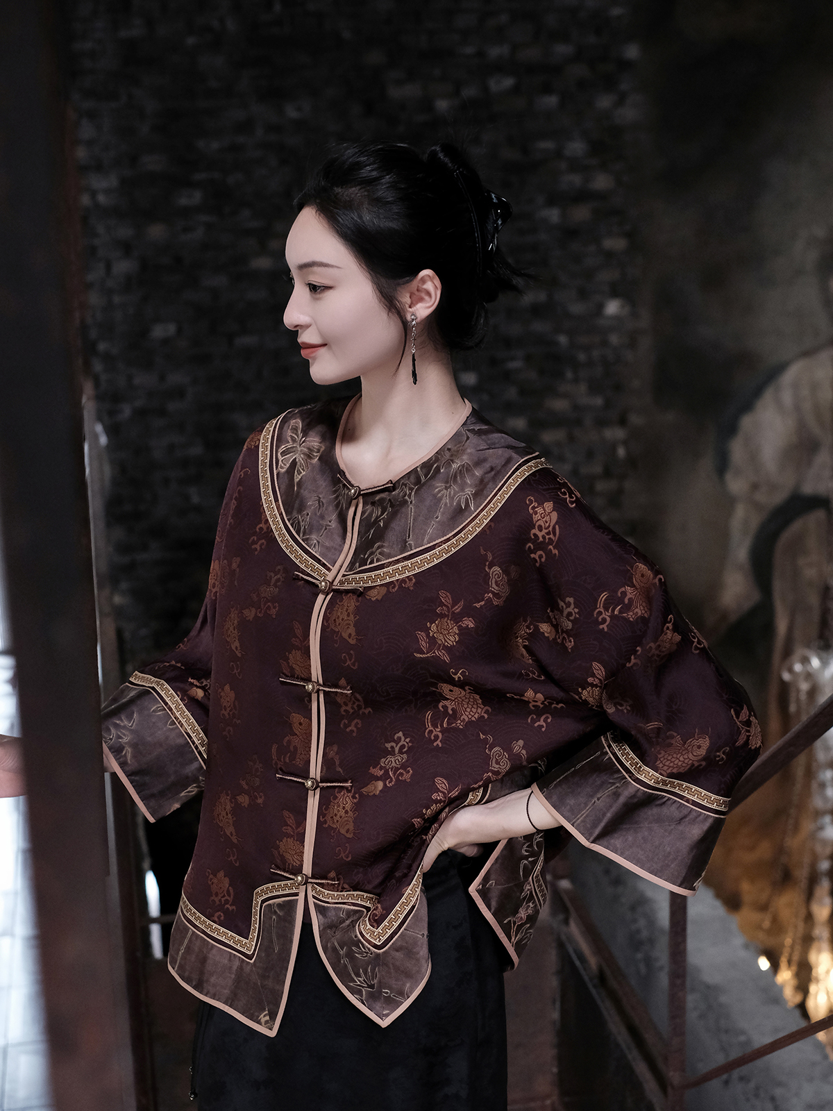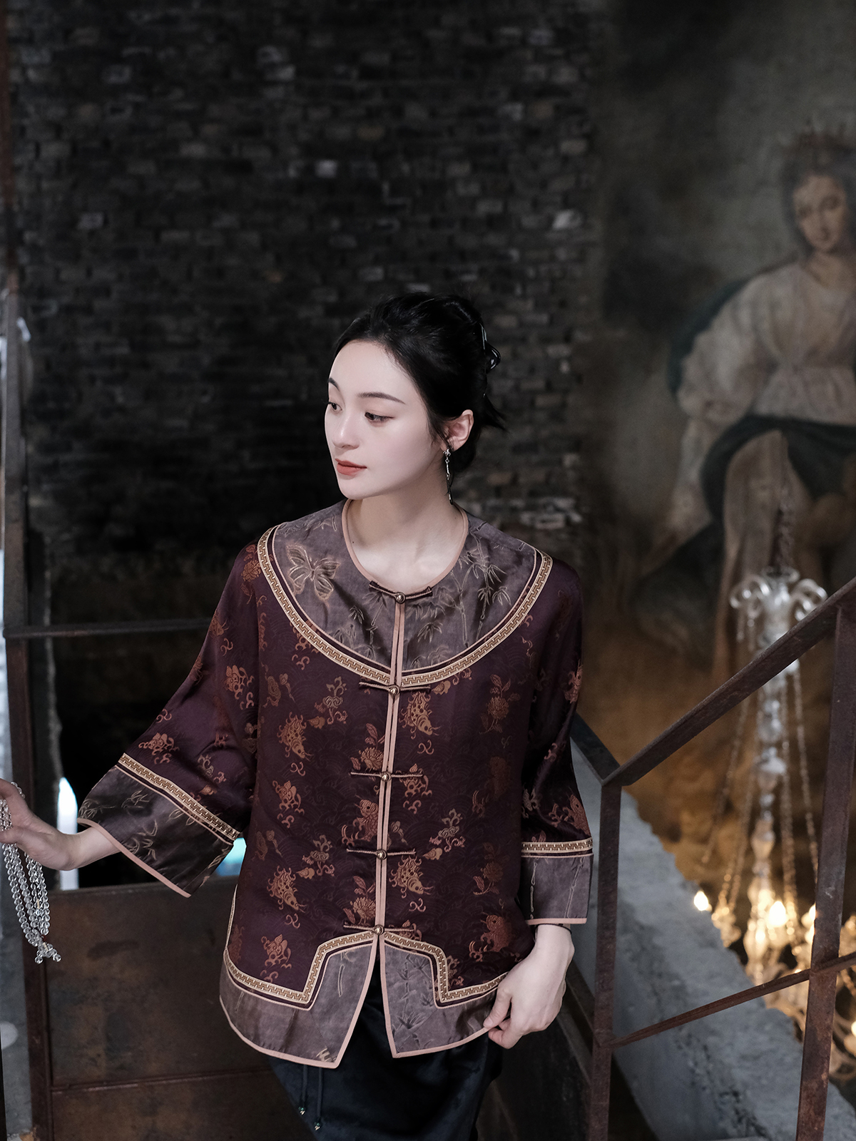盛唐牡丹 |真丝提花梅兰竹菊偏襟上衣