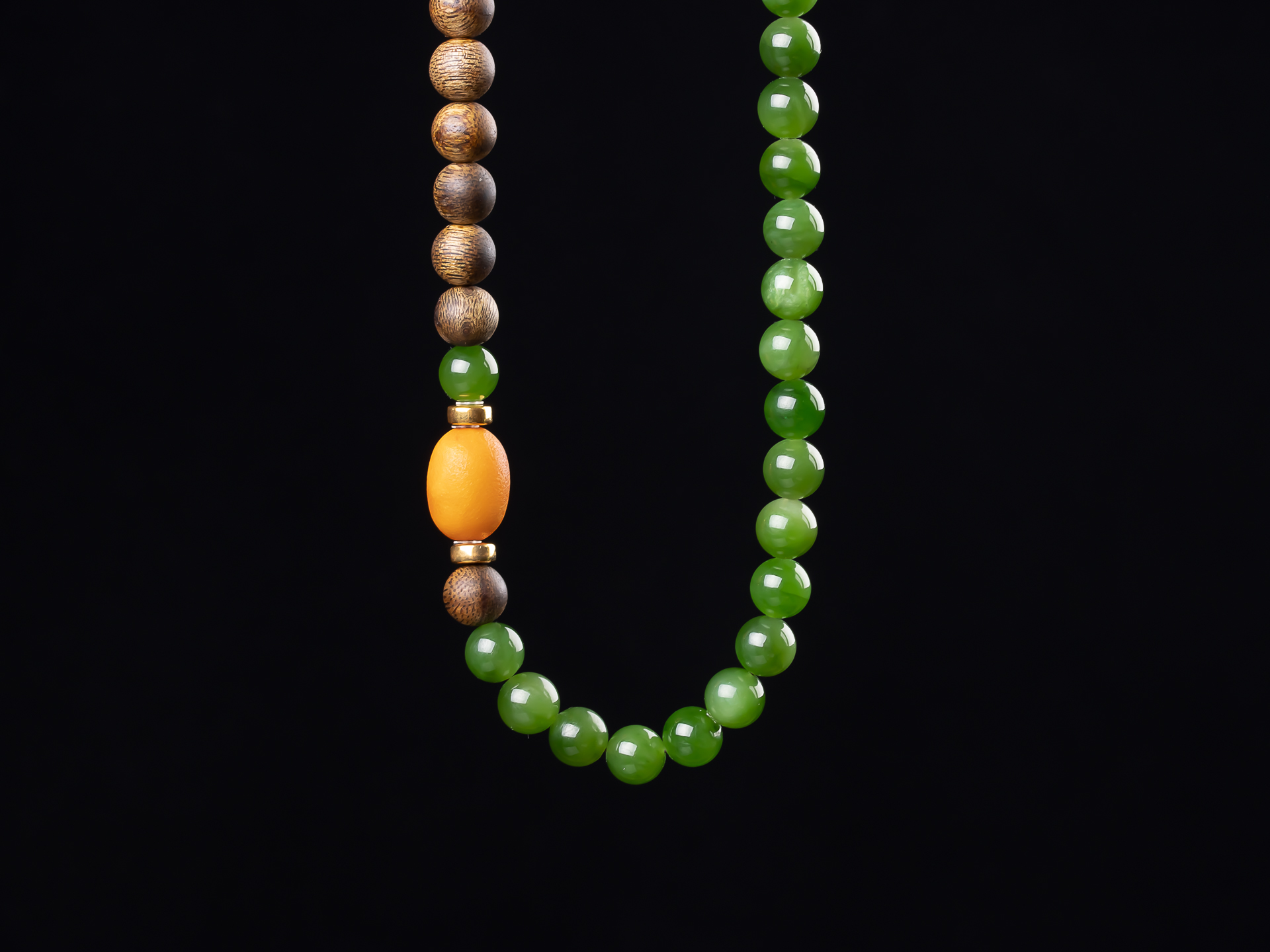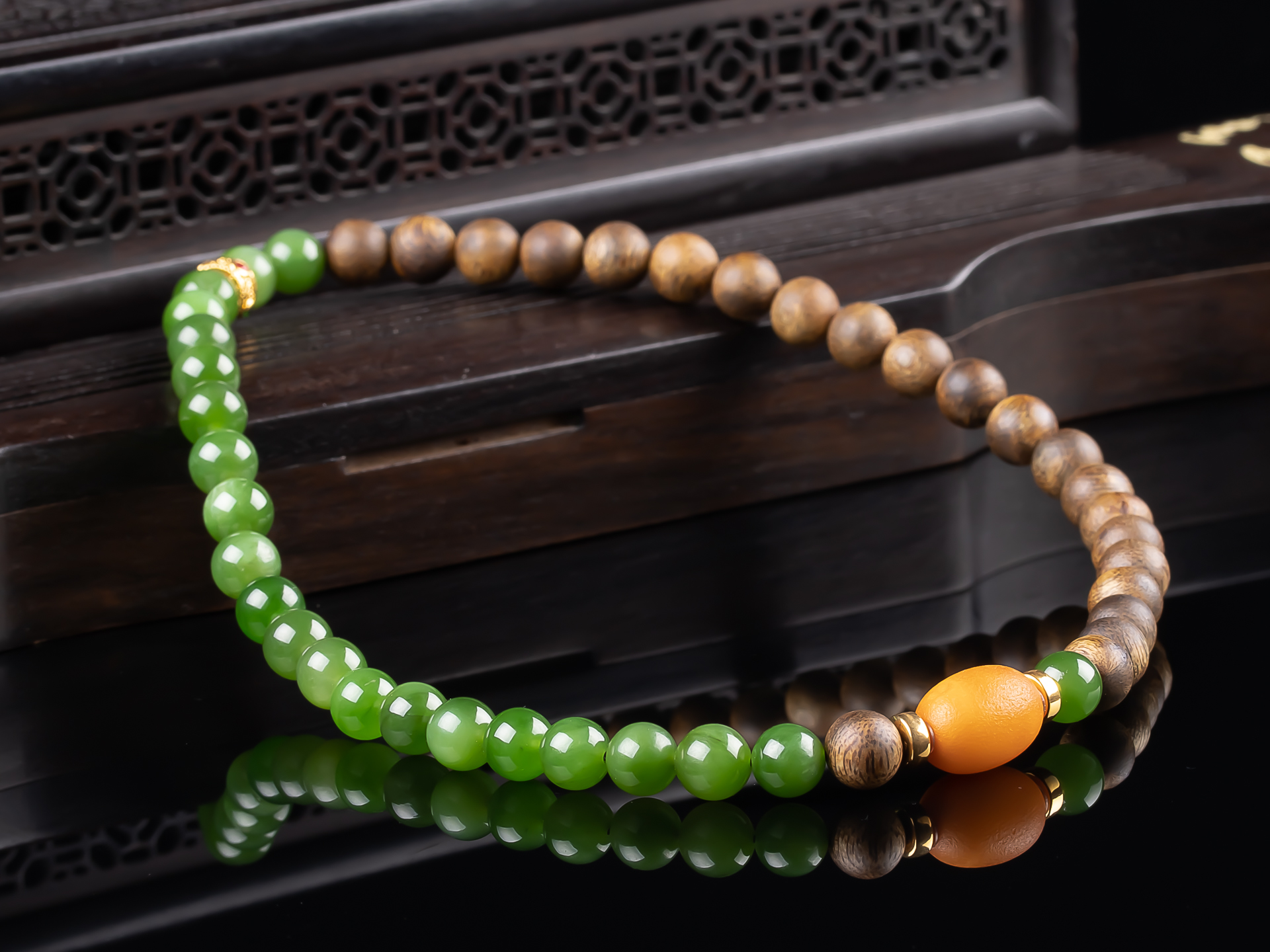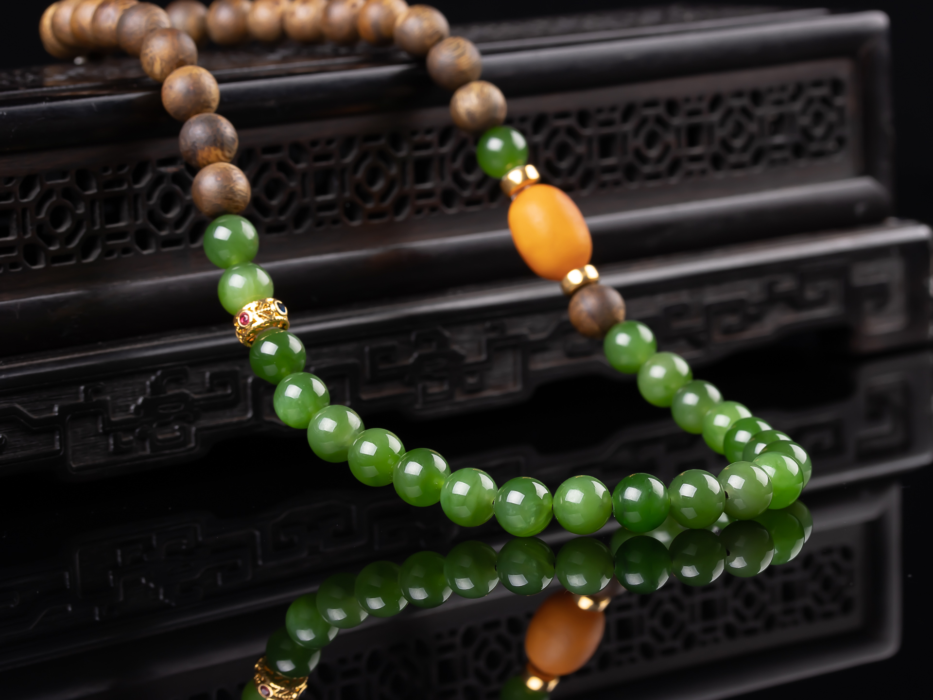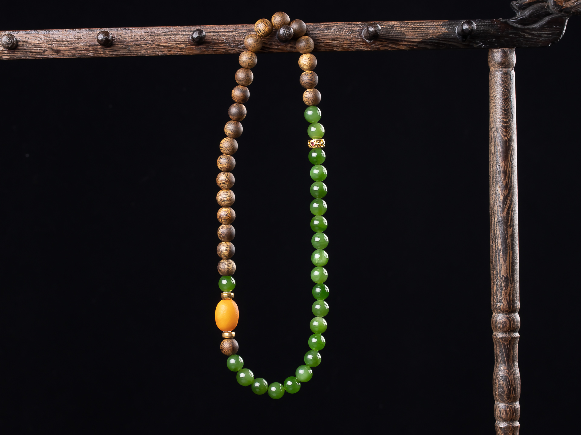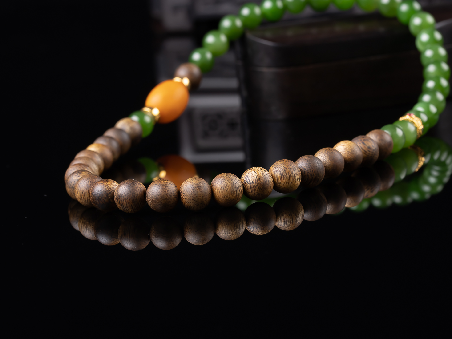 新款沉香diy碧玉蜜蜡圆珠双圈手串18K金,天然沉香圆珠约8.3mm,原色原味,碧玉圆珠约8mm,总长17cm,配珠:蜜蜡、18K金。半玉半香,加老蜜蜡与K金相配,款式新颖有个性。超值1680元