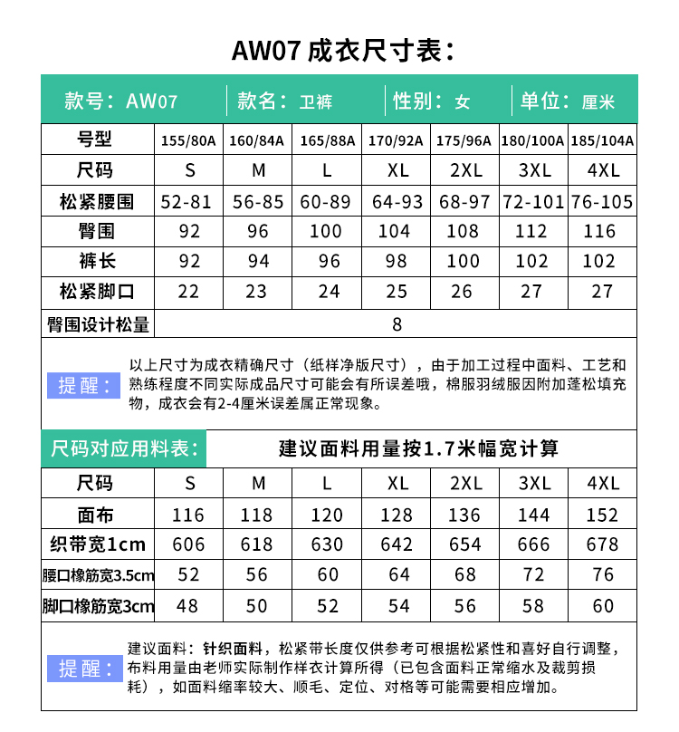 裁缝学苑 AW07女士休闲运动裤子1:1实物服装纸样剪裁图纸牛皮纸样