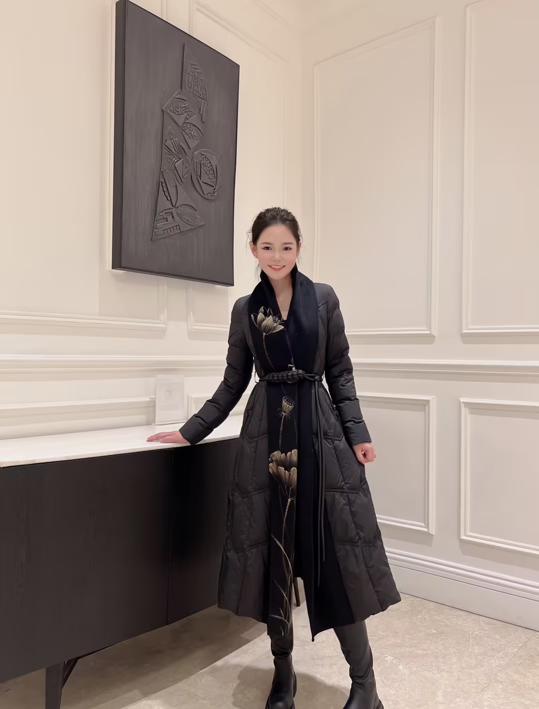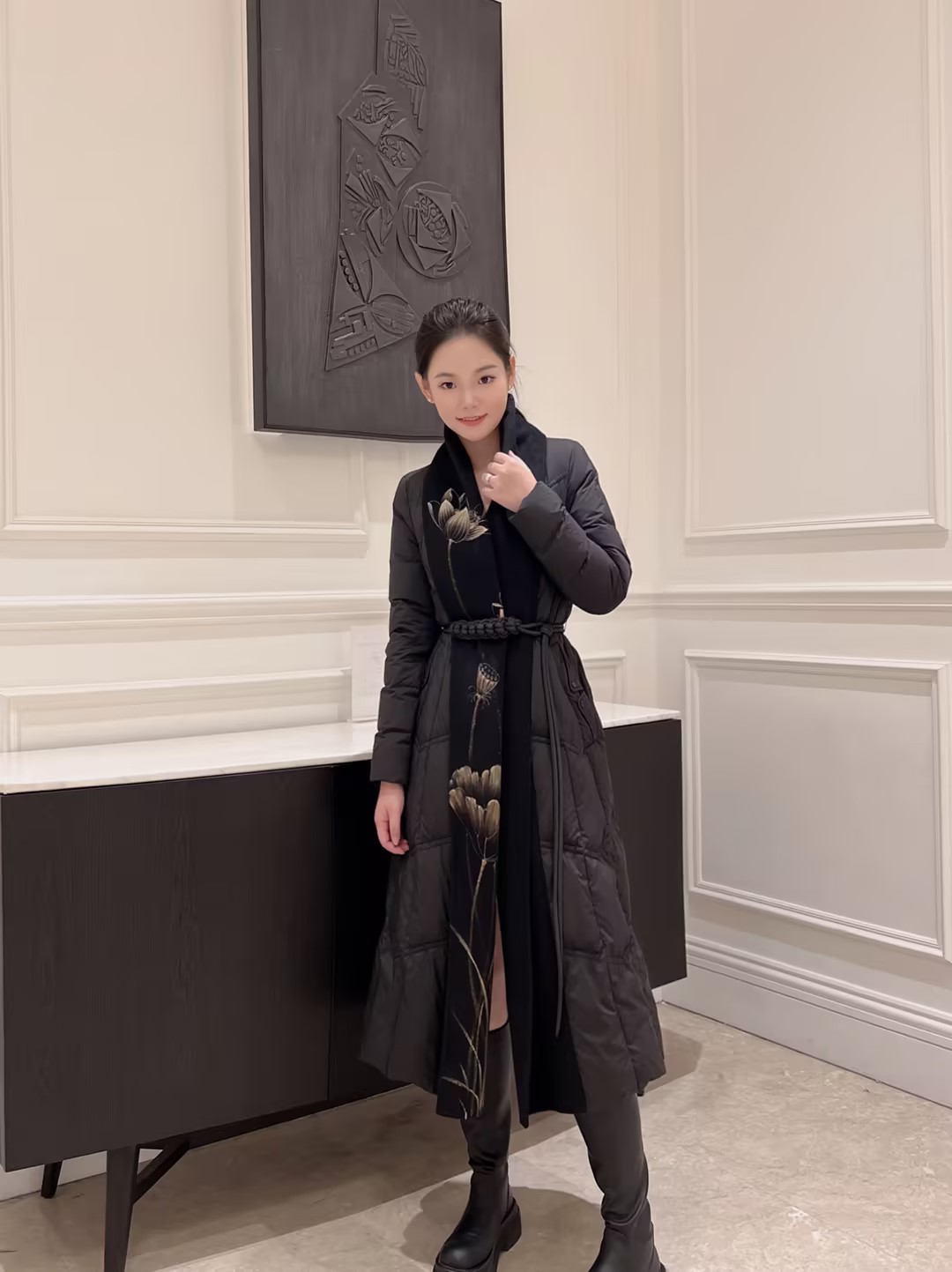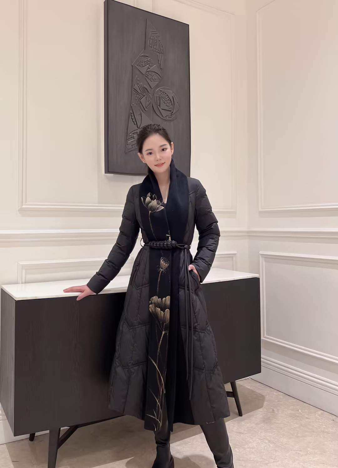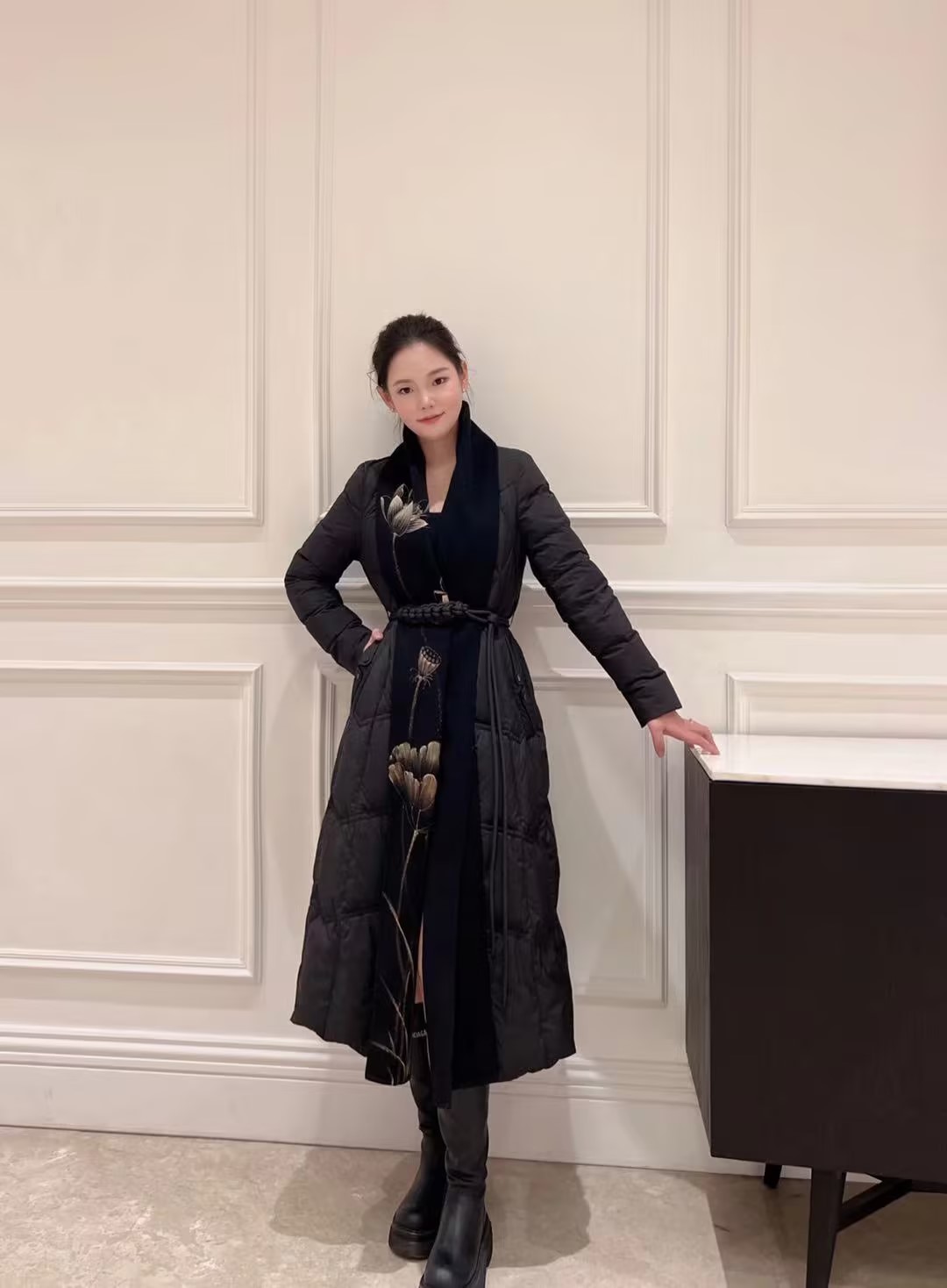 SZ1R52_漆黑色_羽绒服_冬季_V领菱格绗缝编织腰带收腰长款过膝_高级女装_BERNIEELEN 伯妮斯茵
