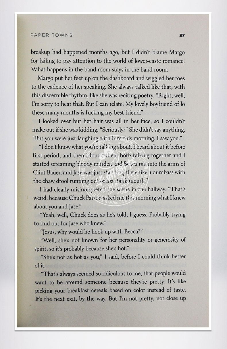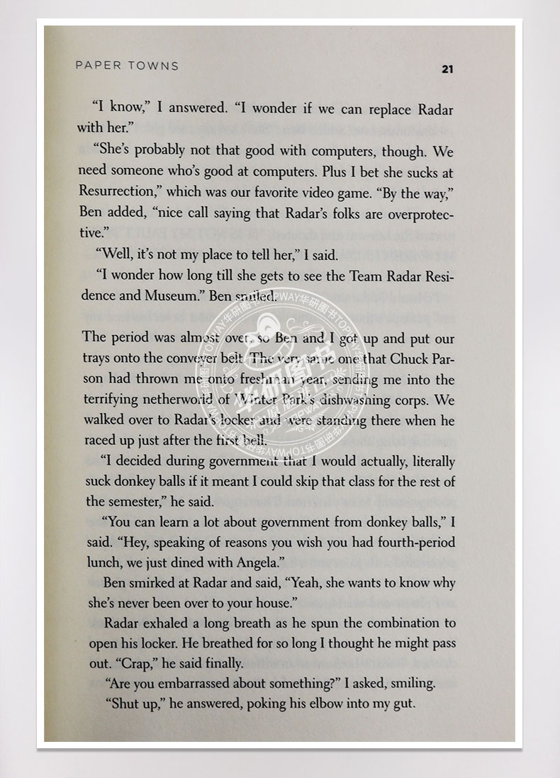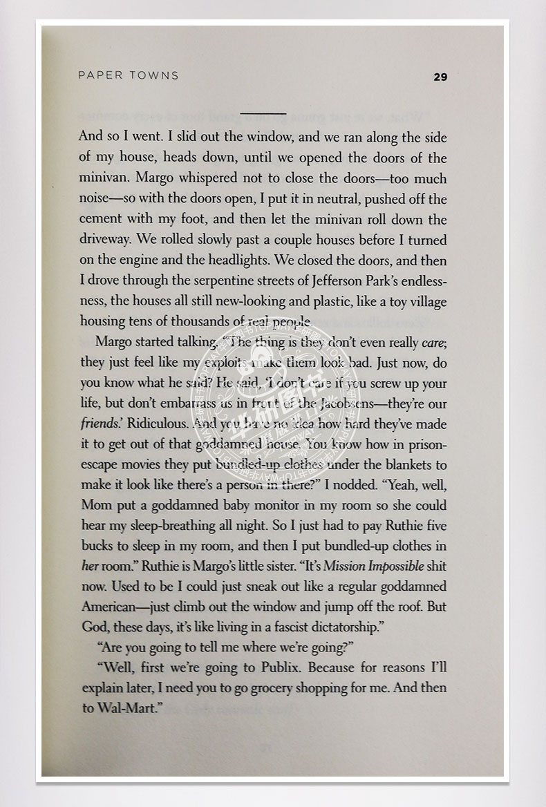 Paper Towns《纸镇》的作者约翰·格林常年占据《纽约时报》畅销青年小说家榜首位置。该小说获得了2009年的爱伦坡奖,并在亚马逊十大青年畅销书榜单中常年名列前茅,深受全世界青少年的青睐。既是一本青春爱情小说,又是一本悬疑推理故事。冒险情节环环相扣,人物塑造丰满细腻。适合喜欢小说又想要提高英语水平的学生和成人阅读。推荐理由:1.把青少年爱情和冒险故事相结合,题材新颖,牵动人心; 2.语言简洁,难度不大,读者可在休闲阅读的同时积累英语的地道用法; 3.小说附Discussion Questions“讨论问题”4页,启发读者阅读后反思,有助于充分理解; 4.大开本,版面舒适,印刷精美,字体较大,阅读感舒适; 5.轻型纸印刷,便于随身携带,随时随地阅读。 Paper Towns debuted at #5 on the New York Times bestseller list and won the 2009 Edgar Award for Best Young Adult Mystery. It is taught in many high school and college curricular, often in conjunction with Whitman’s Leaves of Grass, which is an important text within the novel. The movie adaptation of Paper Towns was released in Summer 2015 starring Nat Wolff and Cara Delevingne, and directed by Jake Schreier. “Paper Towns has convinced me that jaded adult readers need to start raiding the Teen’s section at the bookstore. Green, who grew up in Orlando and uses the city as a backdrop for the story, taps into the cadence of teenage life with sharp and funny writing, but transcends age with deeper insights. ” — Rebecca Swain ofOrlando Sentinel“Green’s prose is astounding — from hilarious, hyperintellectual trash talk and shtick, to complex philosophizing, to devastating observation and truths. He nails it–exactly how a thing feels, looks, affects–page after page.” — Johanna Lewis,School Library Journal, starred review “A powerfully great read.” — VOYA