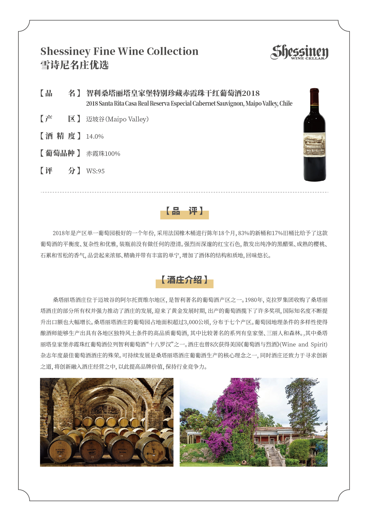 智利桑塔丽塔皇家堡特别珍藏赤霞珠干红葡萄酒2018/2019