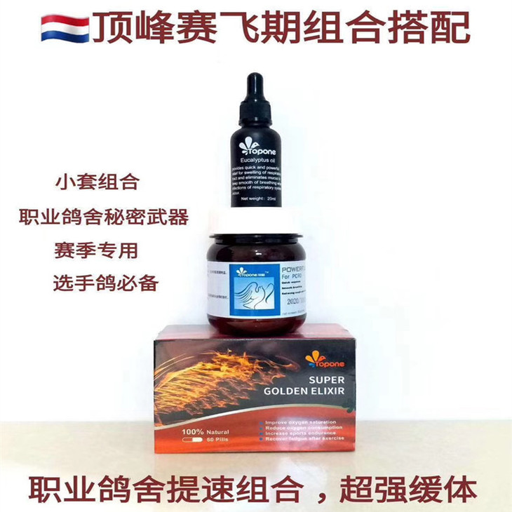 顶峰鸽药【职业鸽舍提速组合】三件套(包括: 畅翔2号小黑瓶 1支; 畅翔呼吸道粉80克 1瓶; 超级金丹60粒 1盒。)
