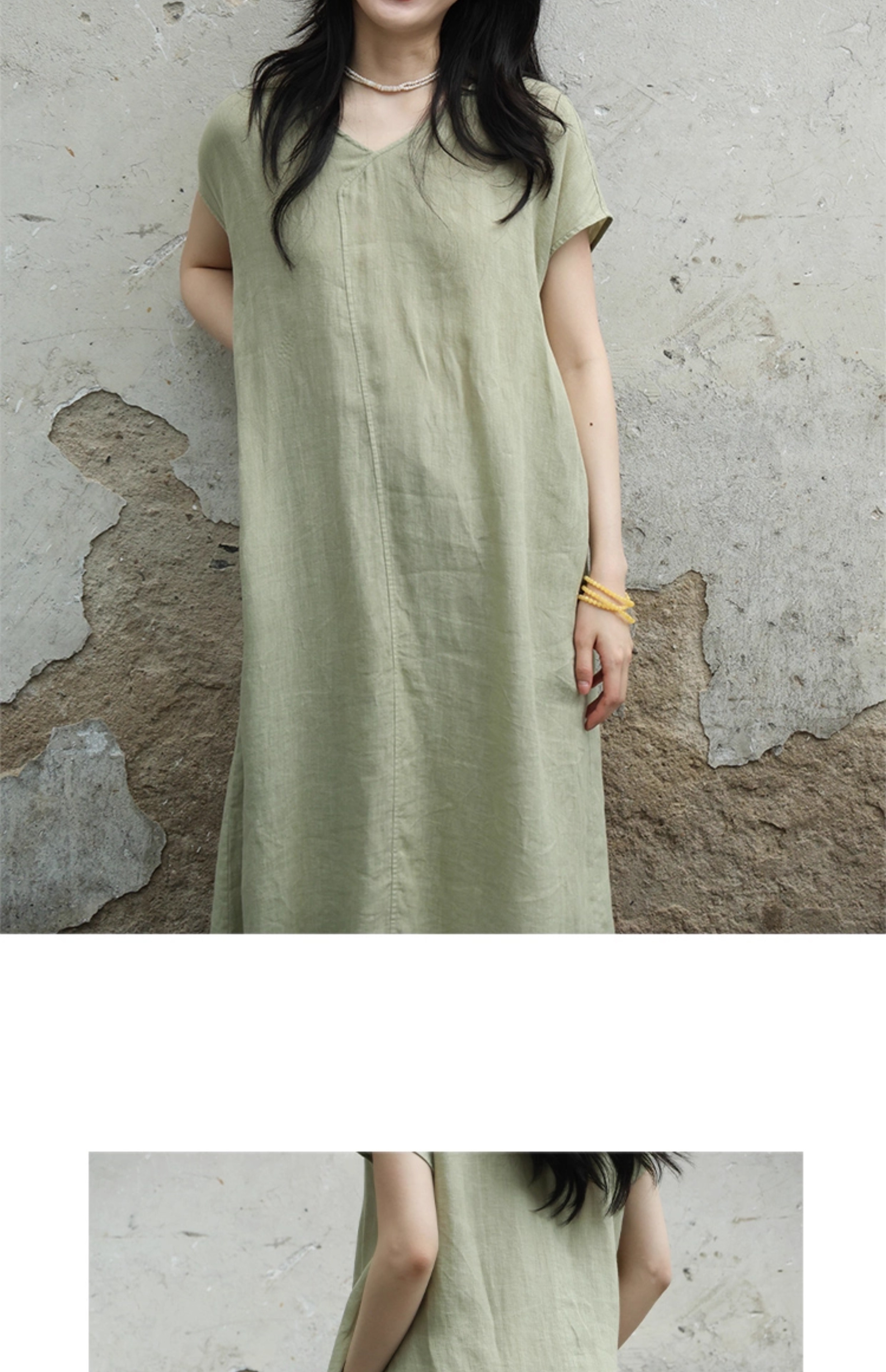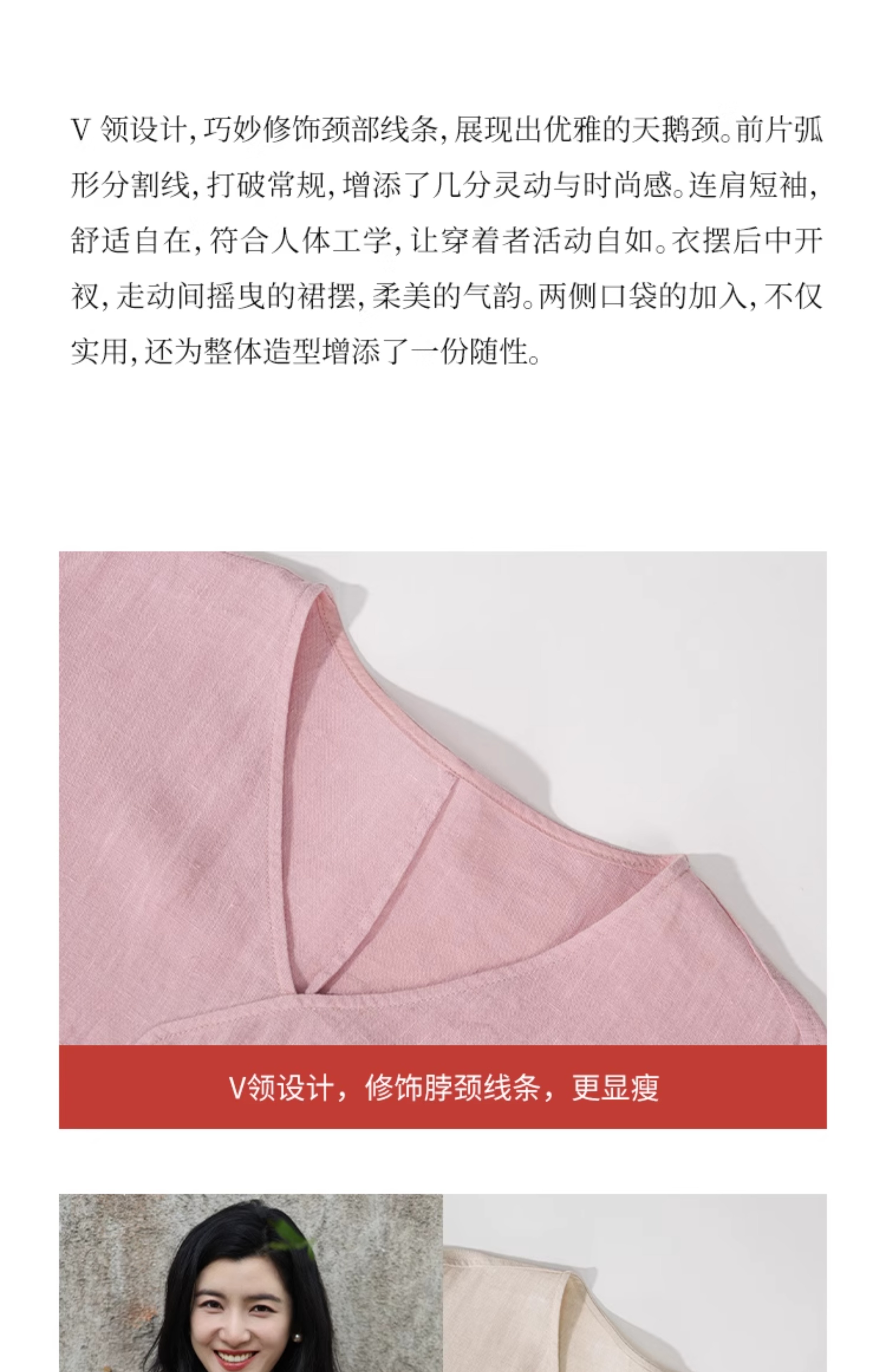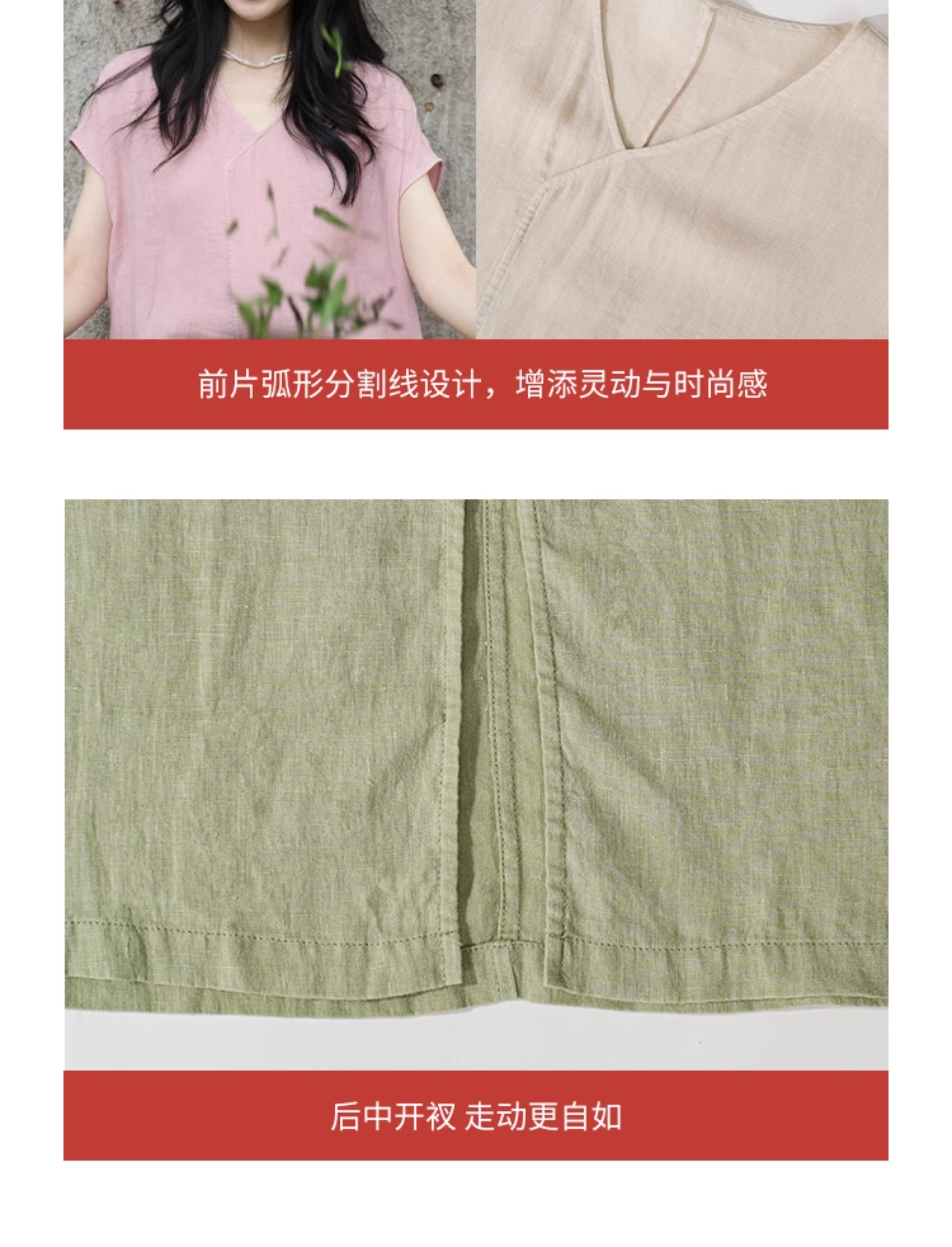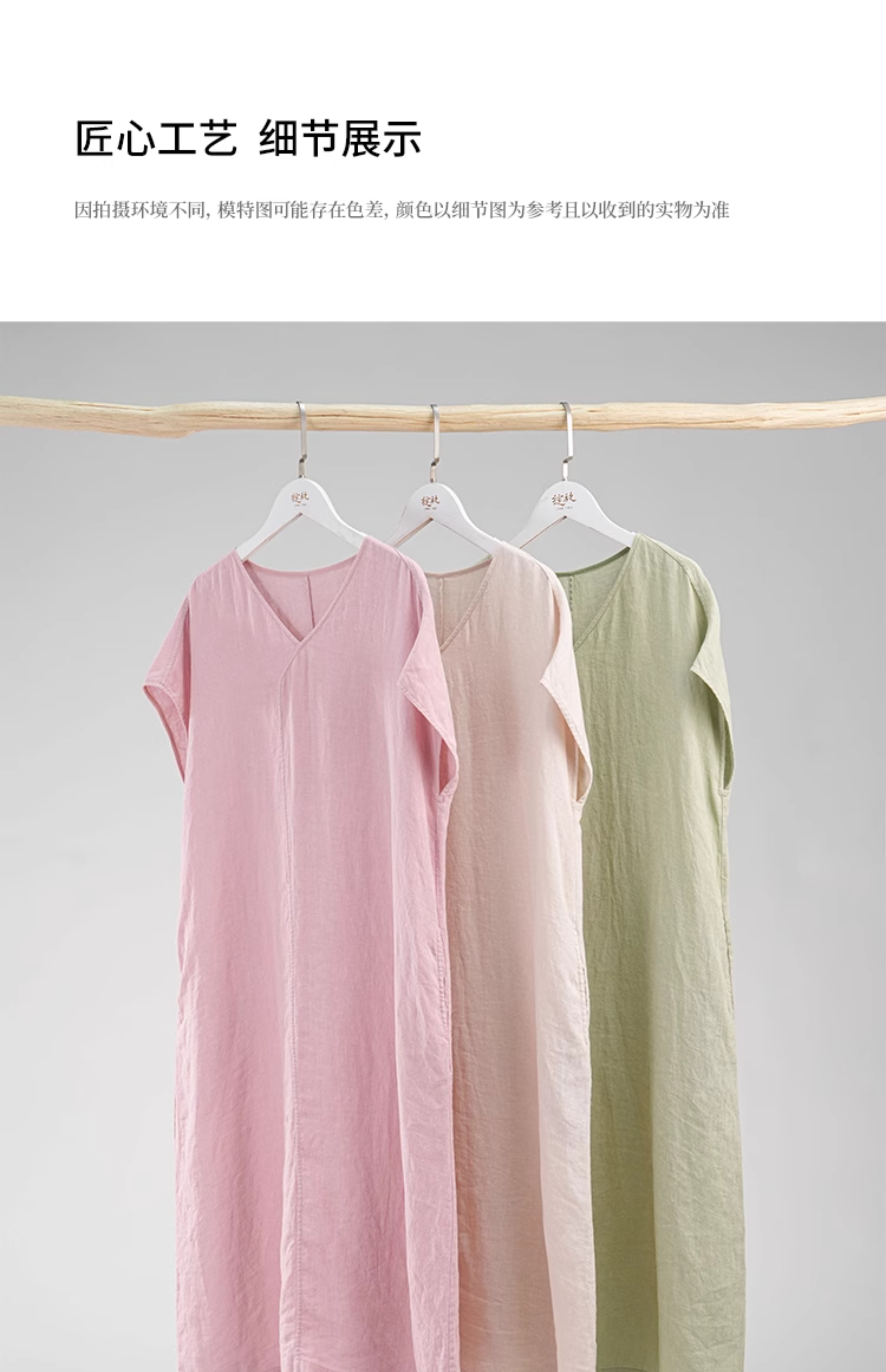 绽放旅行女装336朵/【甜茶系列】砂洗亚麻V领连肩短袖连衣裙女夏