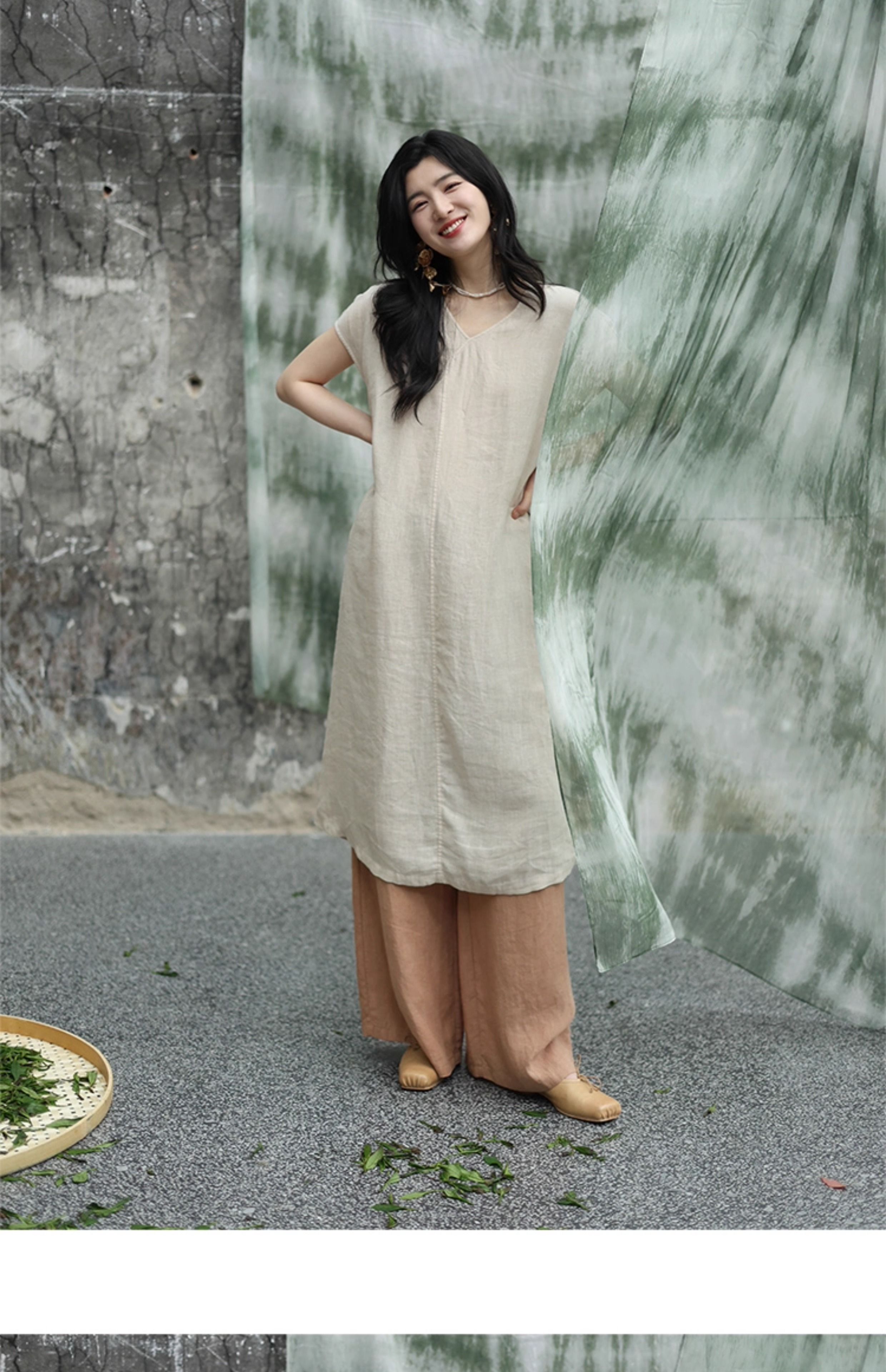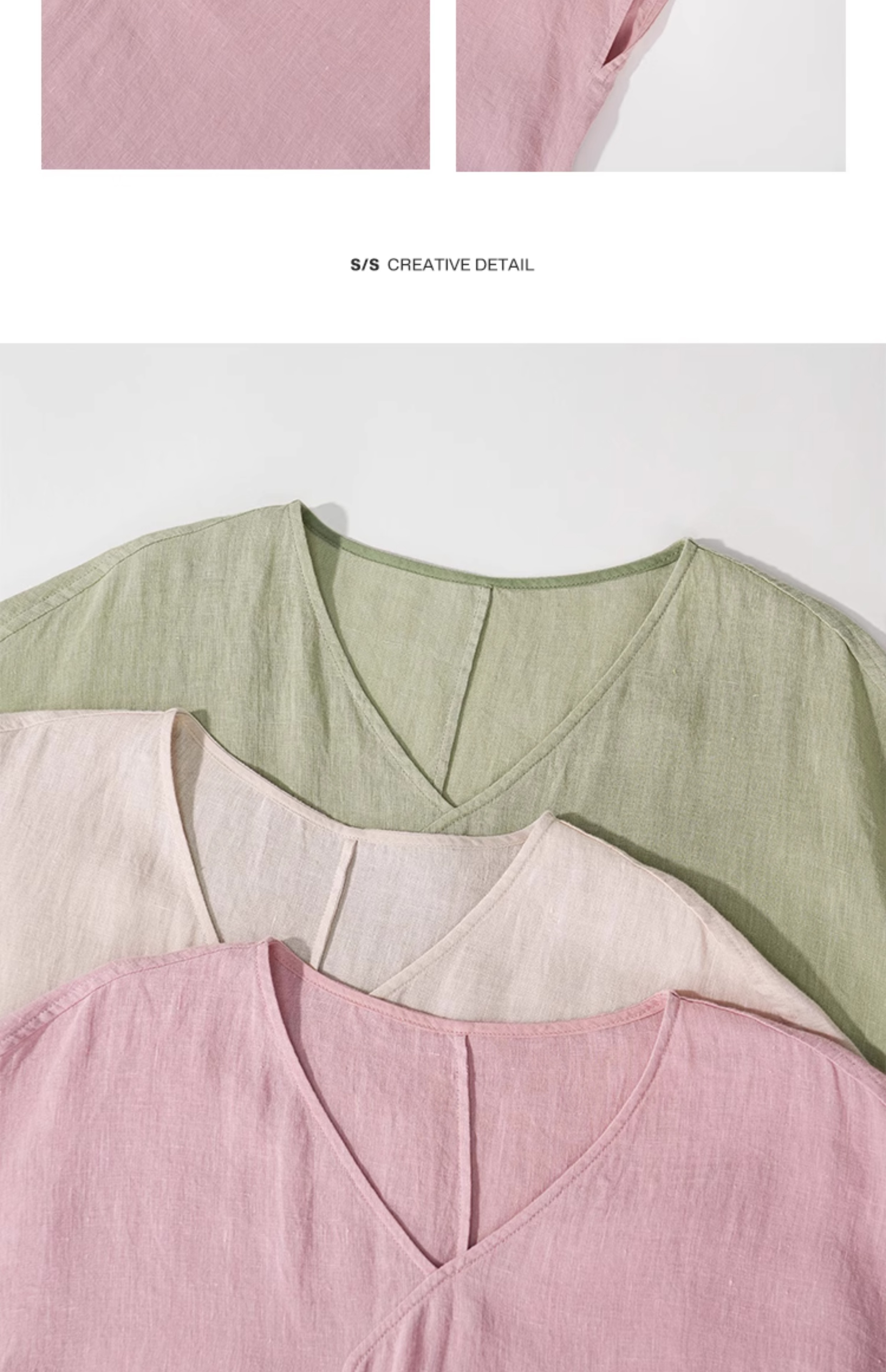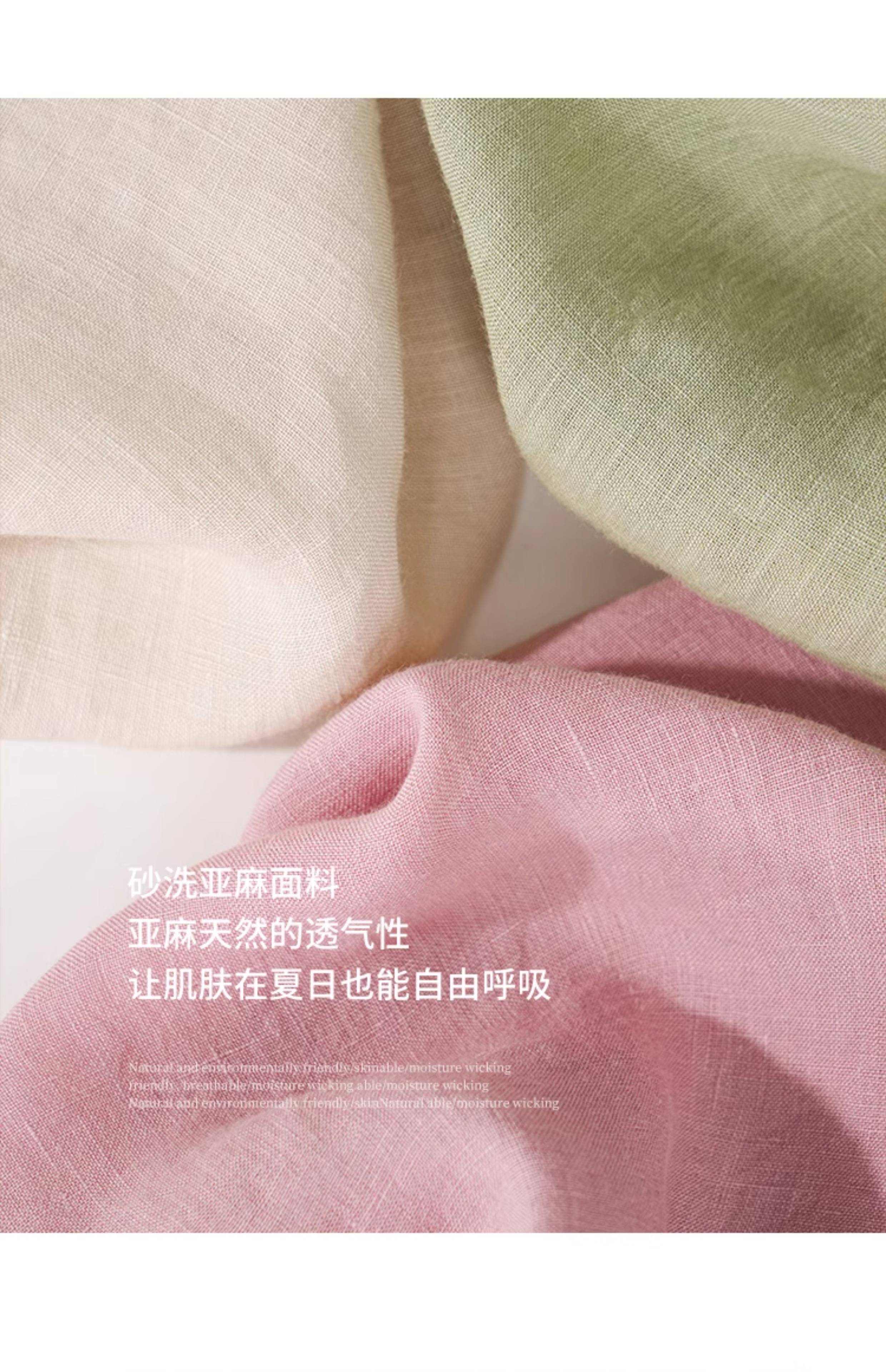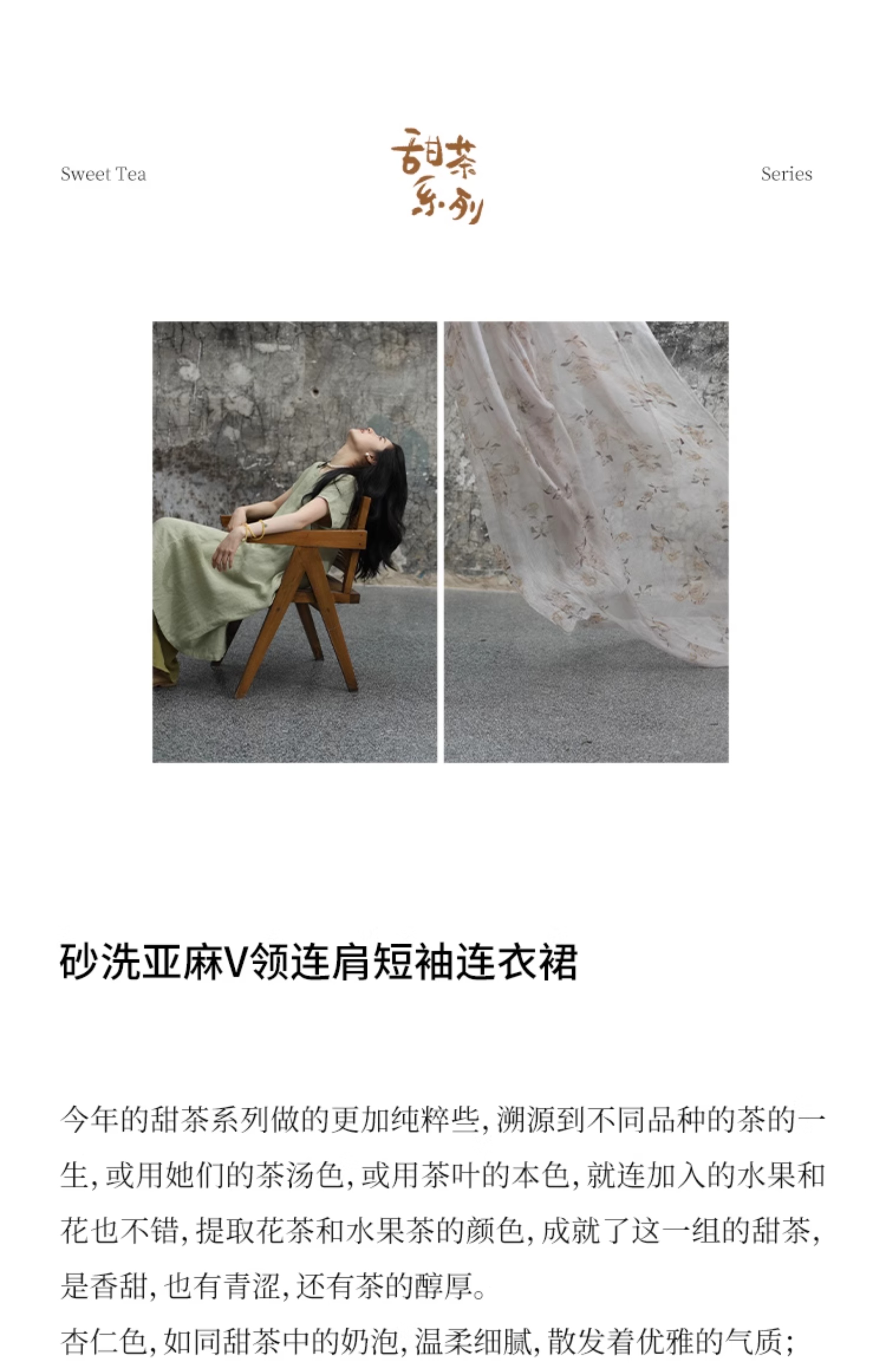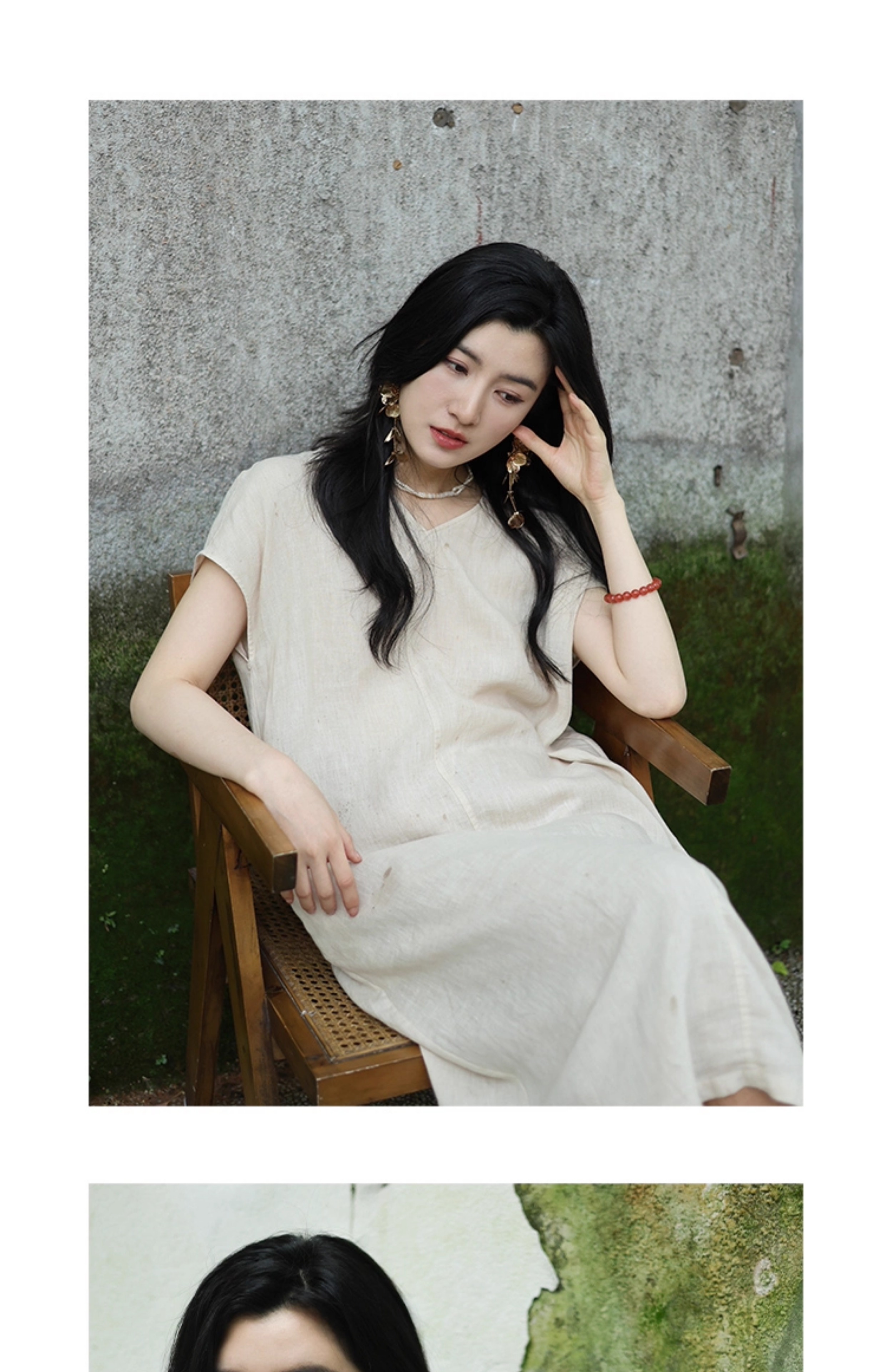绽放旅行女装336朵/【甜茶系列】砂洗亚麻V领连肩短袖连衣裙女夏