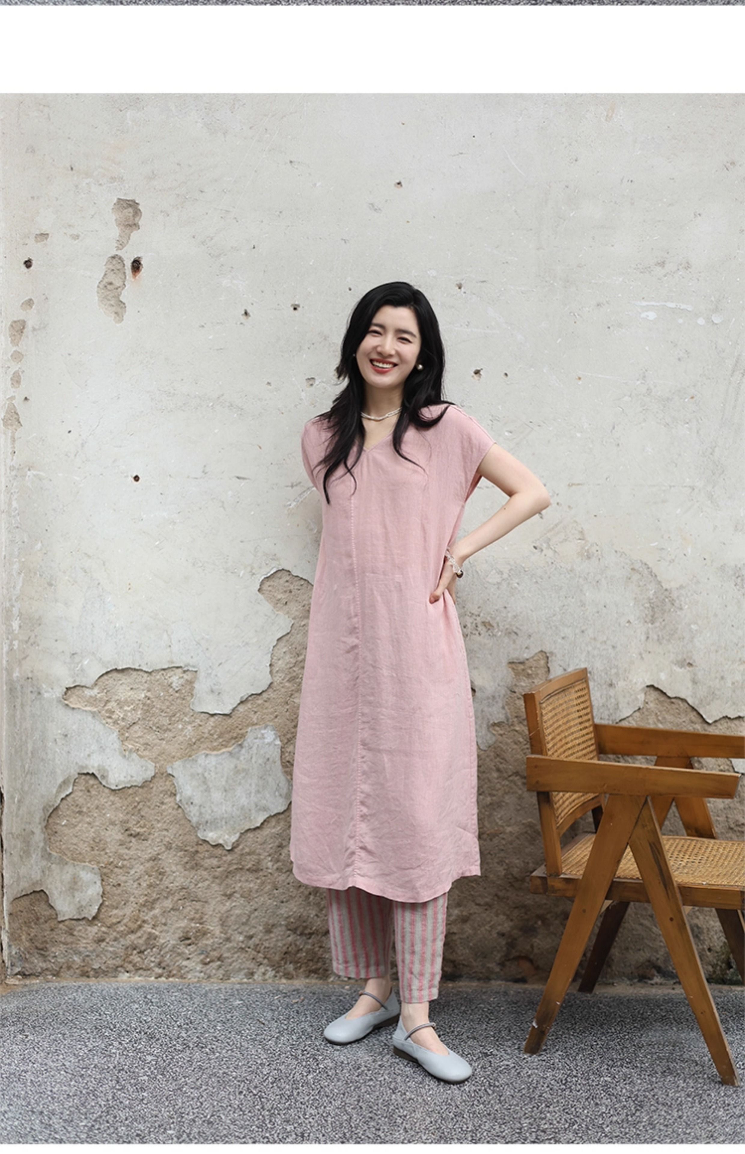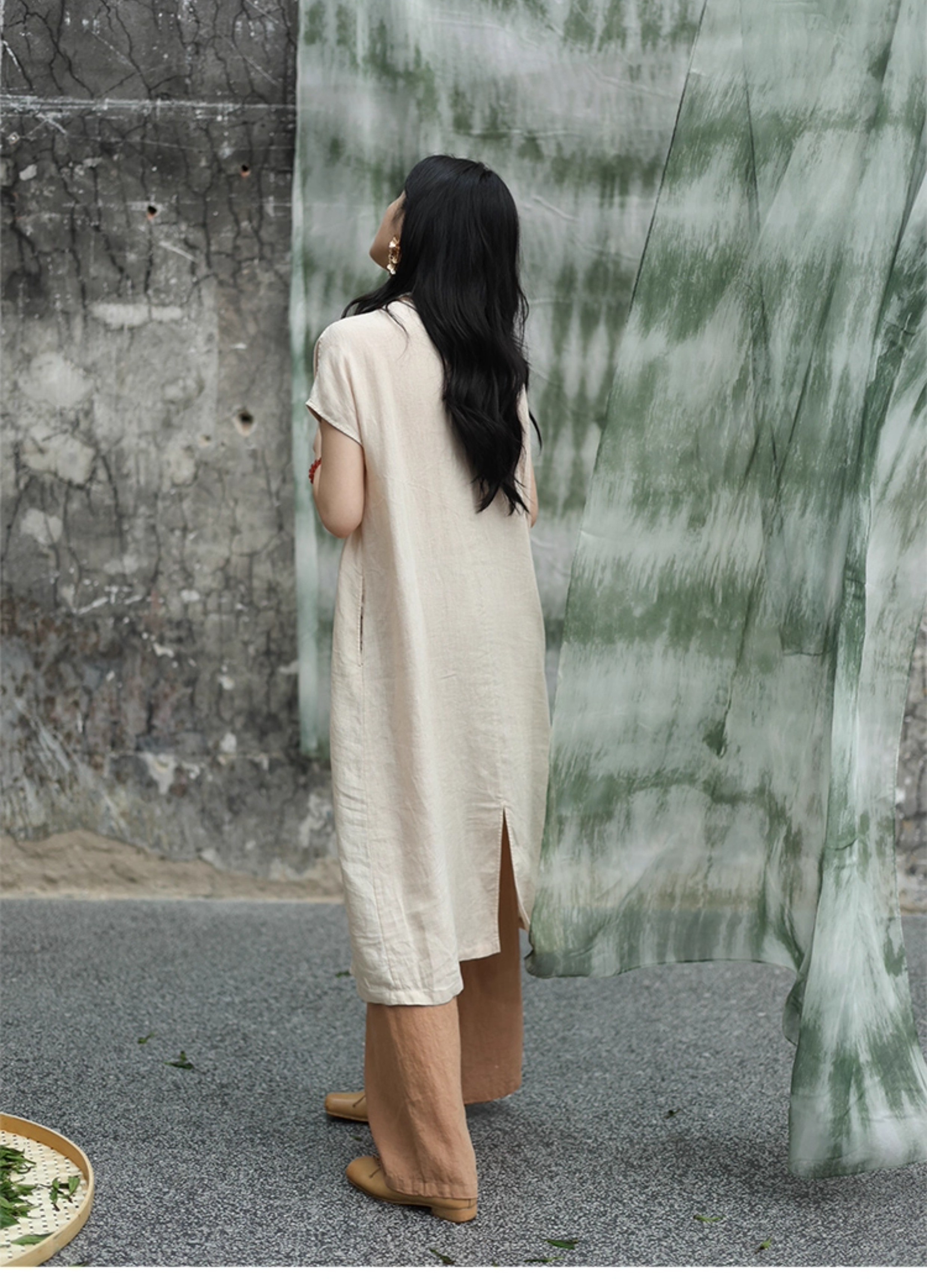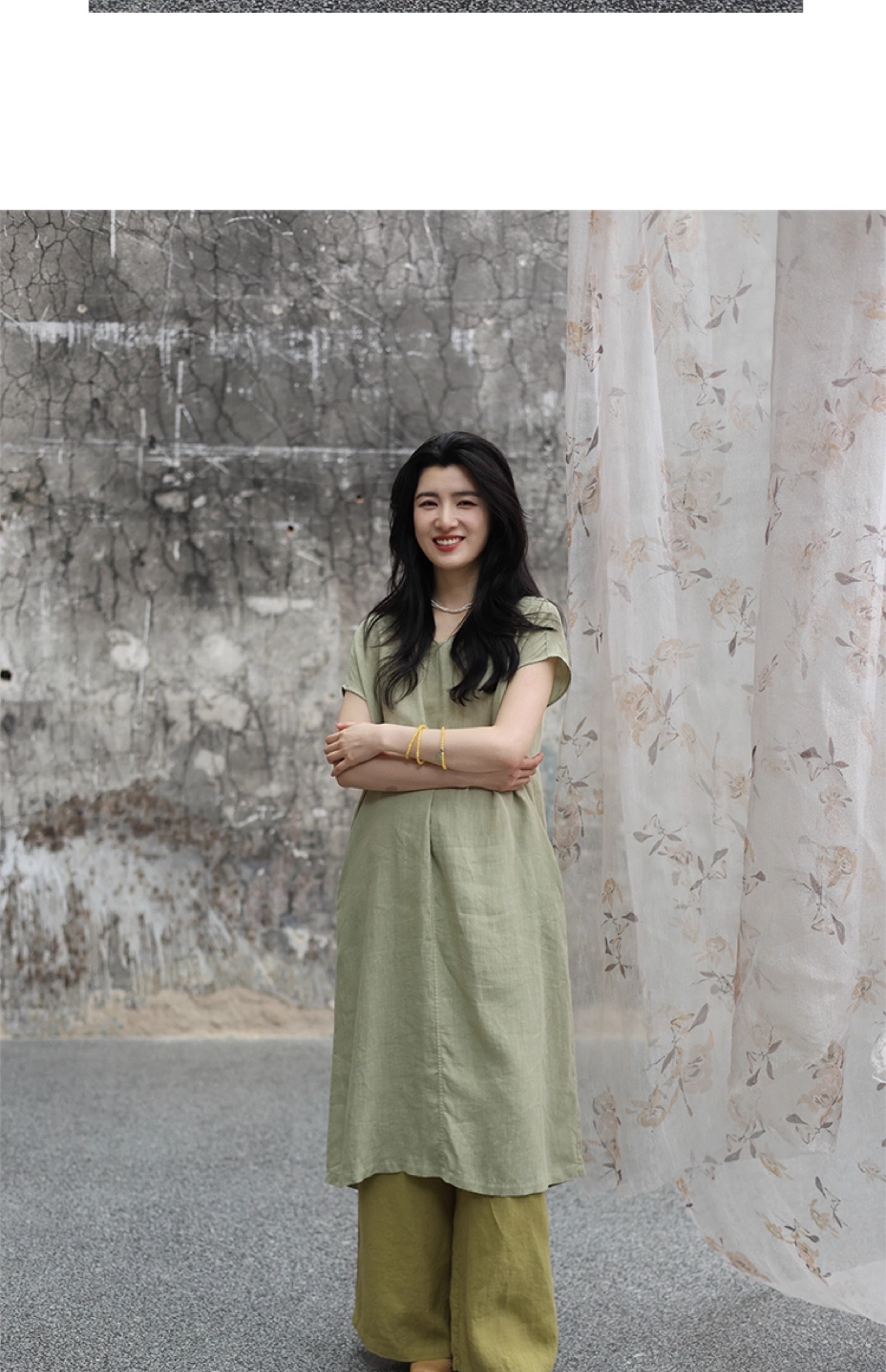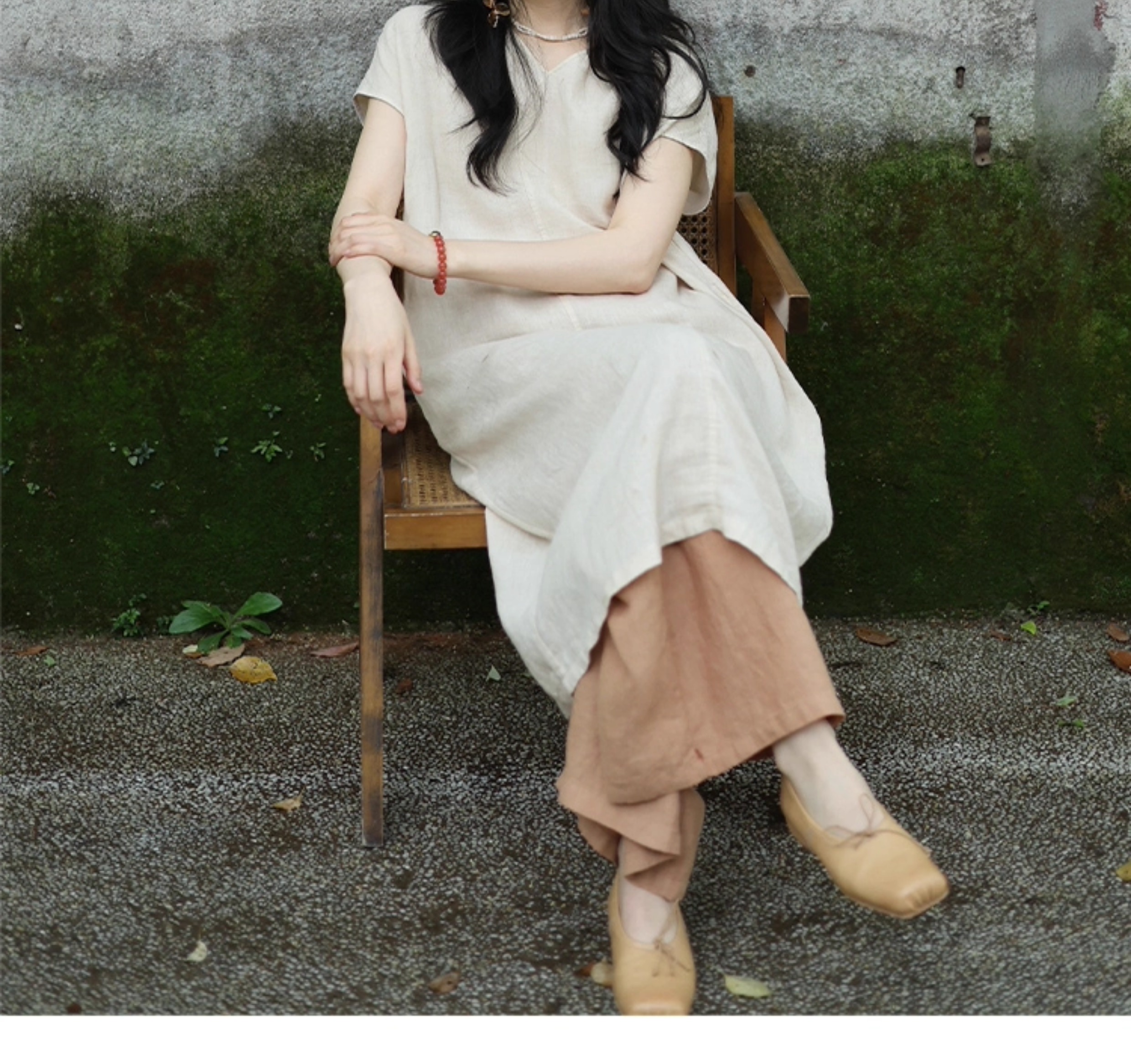 绽放旅行女装336朵/【甜茶系列】砂洗亚麻V领连肩短袖连衣裙女夏