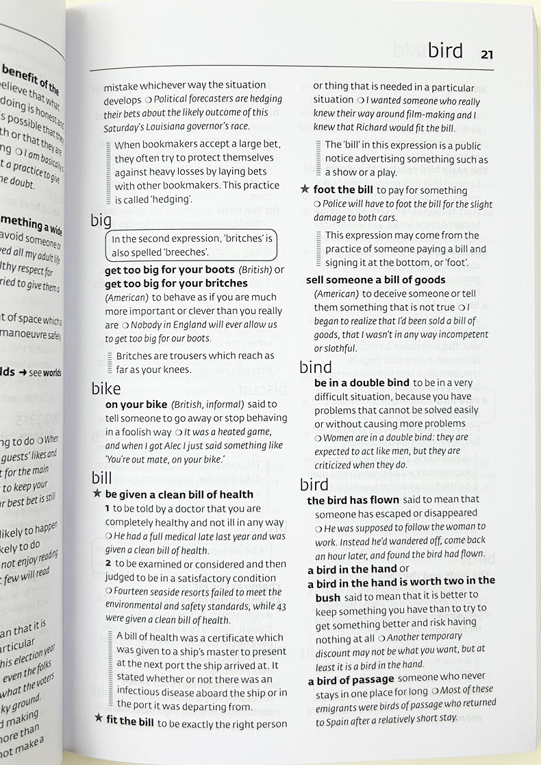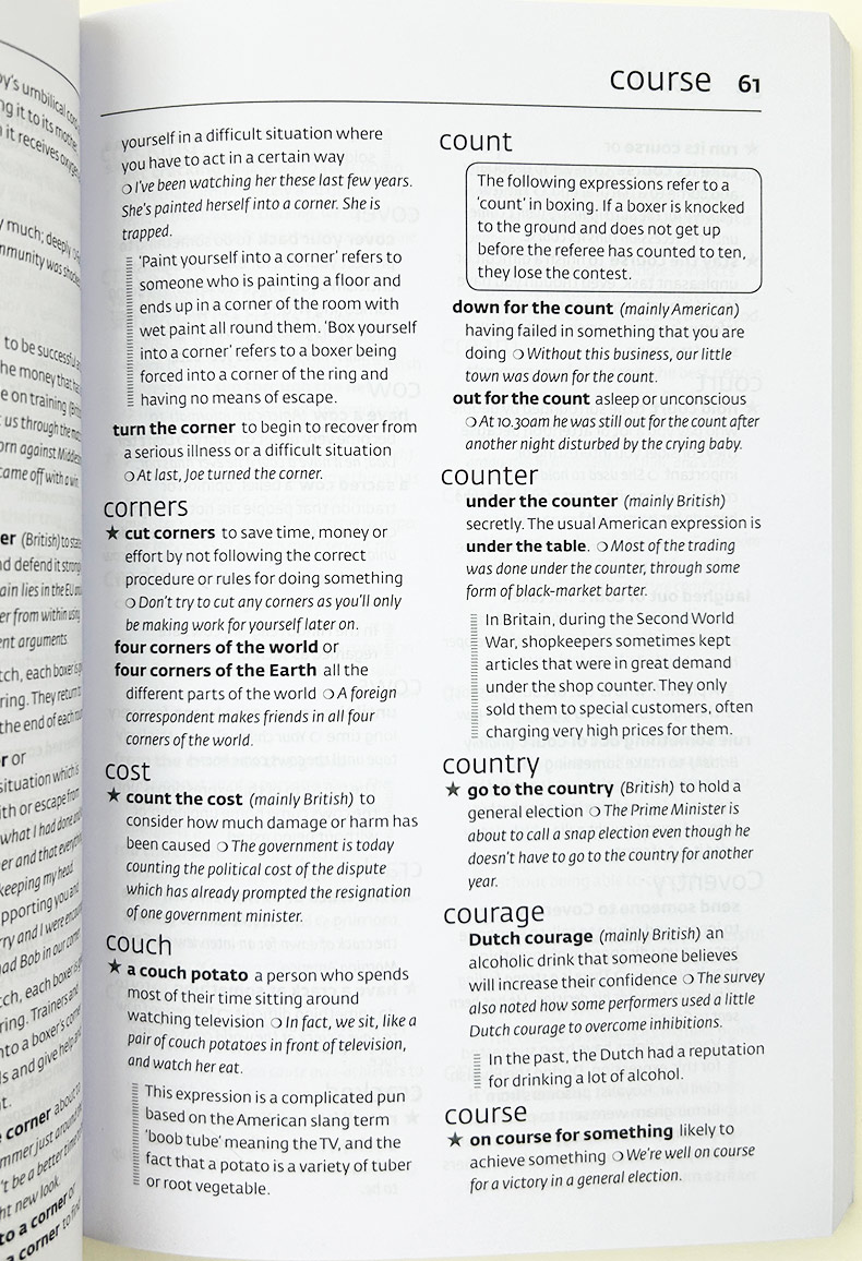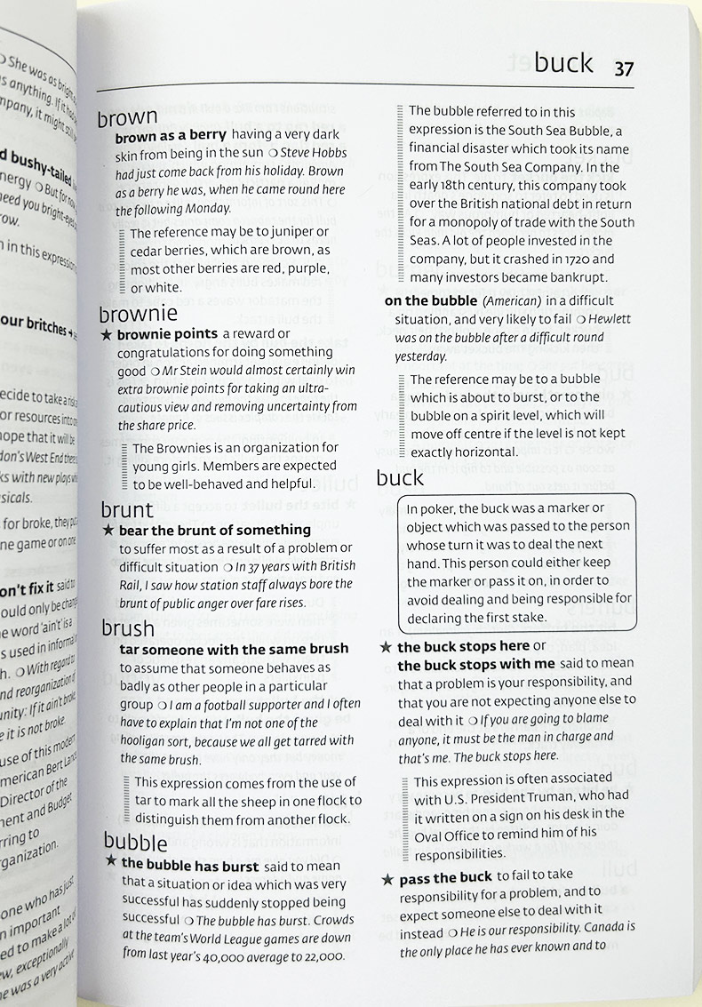 Examples from the Collins corpus show how key idioms are used in everyday English and usage notes explain where idioms come from and how they should be used.