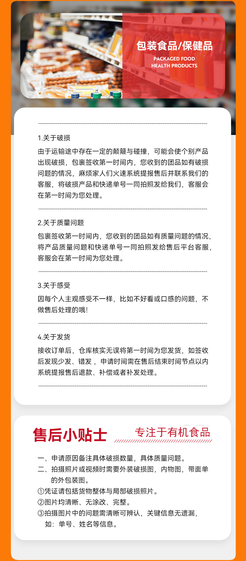 签收后,请立即检查土豆是否完好,如有坏果,请予签收后24小时内提供坏果与面单一起的清晰照片联系客服,我们将及时为您处理售后。