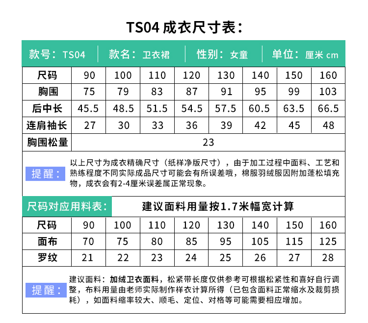 裁缝学苑TS04女童插肩袖卫衣裙纸样儿童高领裙子童装上衣服装打板