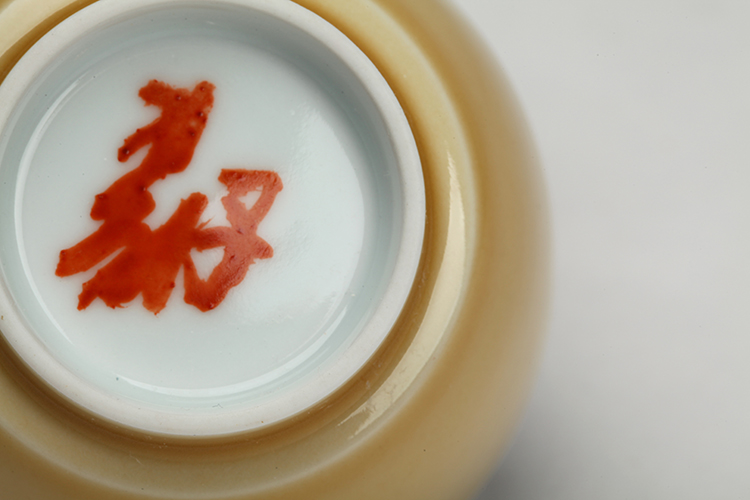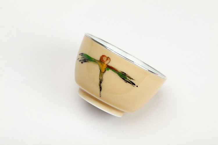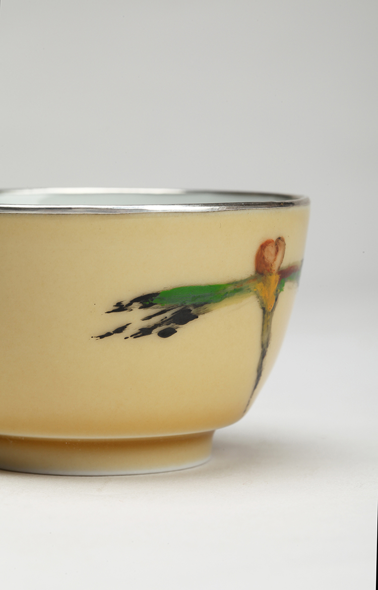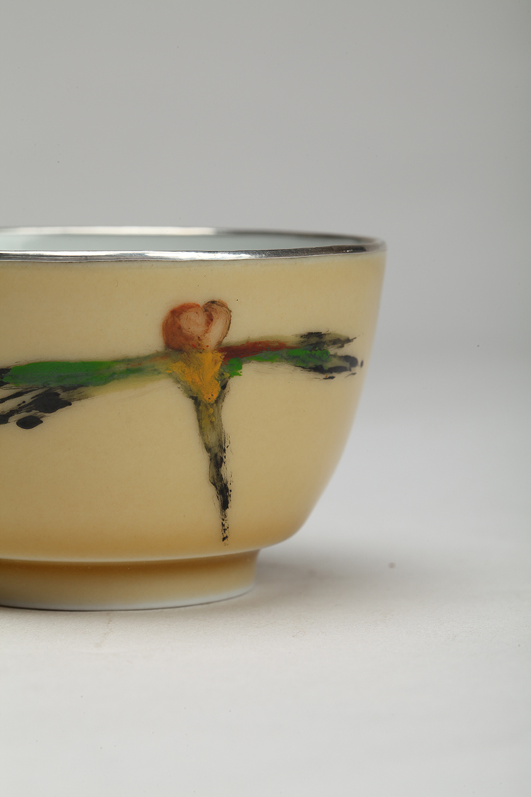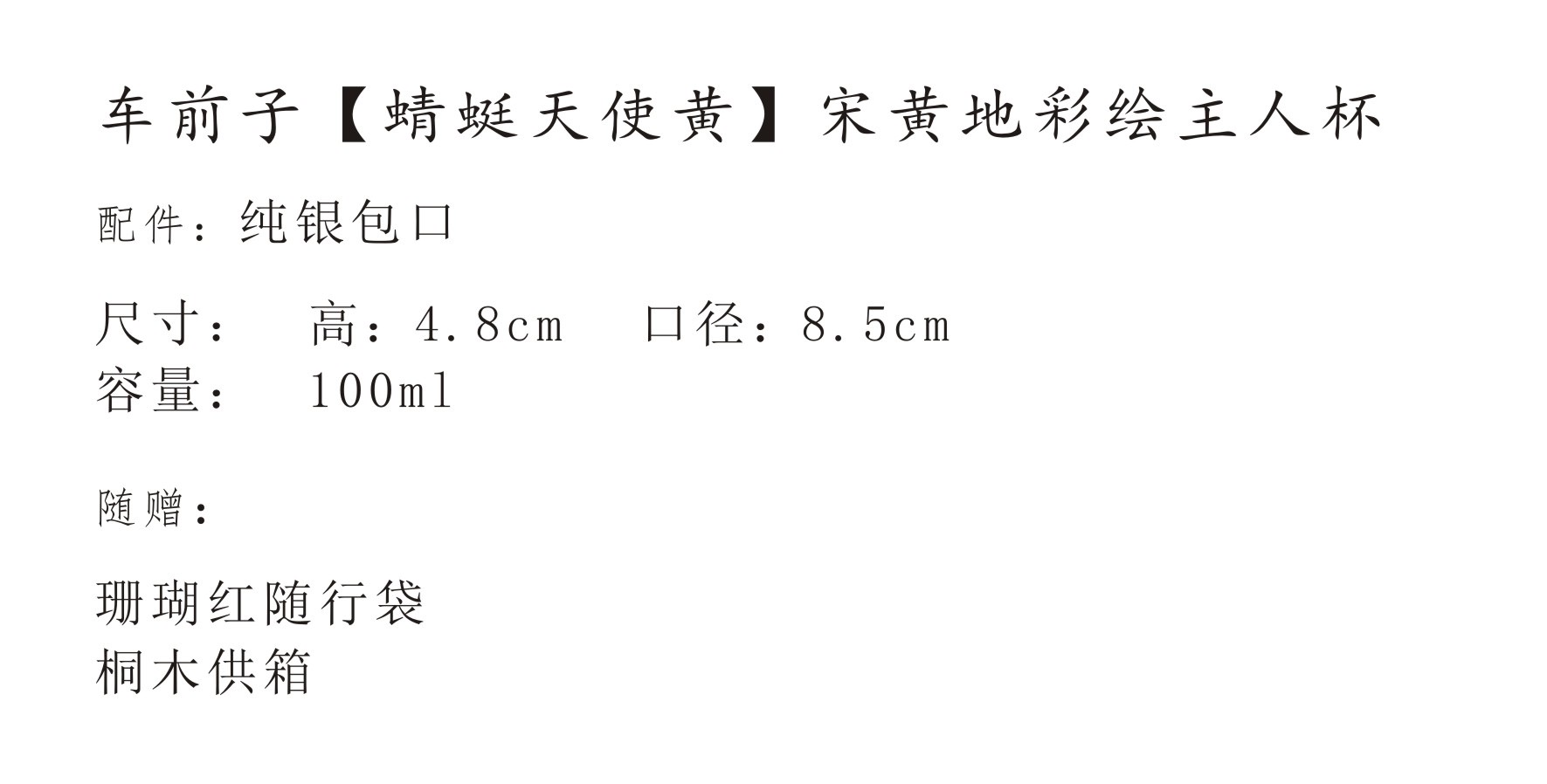 《蜻蜓天使黄》主人杯为宋黄釉地,包银口。此作品车前子以蜻蜓为主题创作的一系列主人杯之一,似蜻蜓非蜻蜓,似天使非天使,从高处飞来,呈现出一种生命的美,色彩变化丰富,用笔洒脱。