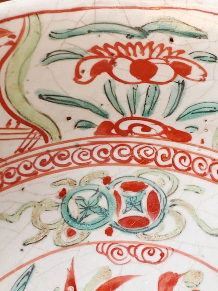 此大碗应是早年流传到日本的漳州窑外销瓷,此类红绿彩漳州窑瓷器,被日本古代茶人称为“吴州赤绘“,其鲜艳的色彩,尤其是红色,以及动感的笔触,深受日本茶道大师的喜爱,珍藏为茶道具盛水器或是花器。此漳州窑红绿彩绘花鸟碗,除碗体稍歪斜与口沿有剥釉与短裂痕外,保存完好无损。相较于较精致之景德镇瓷器,此大碗别具一番趣味。
