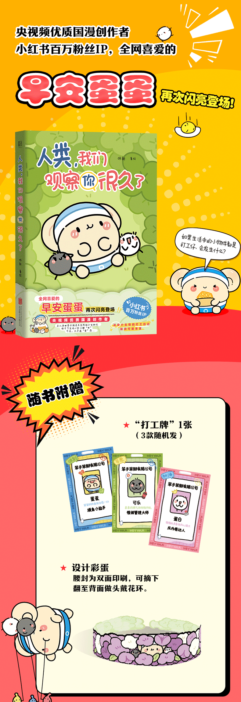 ◎全网粉丝400万十,视频点赞量5000万十,累计播放8亿多次。萌翻全网的原创人气治愈动画IP早安蛋蛋人气续作,温暖再临!看蛋蛋们如何勇闯;职场!◎《中国奇谈》导演陈廖宇,《武林外传》导演尚敬,知名记者、主持人王冰冰等业界大咖,倾情推荐的可爱治愈动画。◎超强的幕后创作团队!央视频优质国漫创作者,CCTV;中国短视频大会2023年度荣誉创作者,央视频;开启童年动画城创作者之一,年度影响力企业合作IP。◎在人类世界长期居无定所的蛋蛋们,终于下定决心打工赚;米。可是,天不遂;蛋愿◎关于友情、爱、成长、陪伴、勇气,精选数十篇故事,看完后,连加班都变得可爱了!◎软萌治愈的温暖画风,脑洞解压的有趣画面。软萌画风十反转剧情,全龄治愈,重拾童心。◎另增篇幅;蛋蛋的脑洞,全新漫画图初次登场。;蛋蛋吐槽式工作总结十单张完整场景图搞笑和可爱翻倍。◎这不仅是一本漫画书,更是一走心的礼物。我今天什么都没做,但我今天好快乐!◎专业团队匠心打造,知名设计师操刀设计;纸张升级,完美呈现画面色彩。◎随书附赠:工作牌(3种随机发1种)。设计彩蛋:腰封(双面印刷十模切工艺)可做头戴花环。