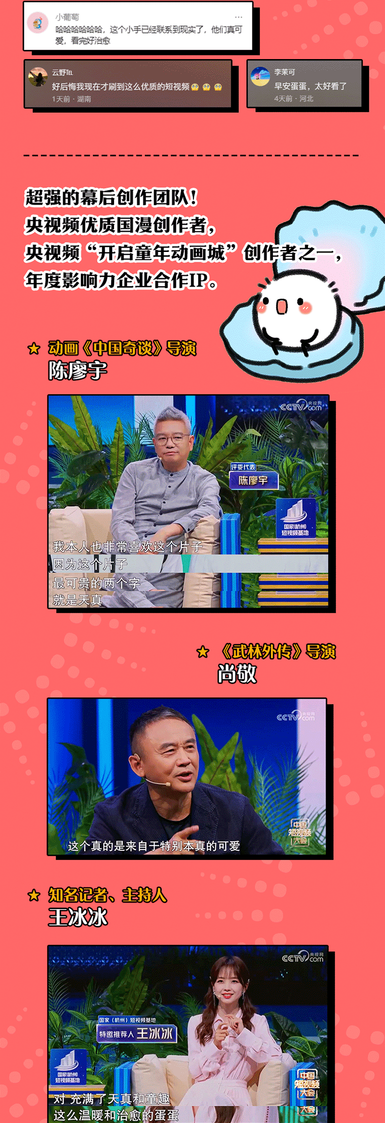 休新央视频优质国漫创作者,CCTV;中国短视频大会2023年度荣誉创作者。小红书百万粉丝博主,全网粉丝累计400万十,视频点赞量5000万十,累计播放8亿多次的;早安蛋蛋动漫IP创作者。早安蛋蛋矩阵覆盖抖音、快手、小红书、哔哩哔哩等。其周边产品深受大众喜爱,微信、QQ表情包使用人次超5亿,是互联网超受网友欢迎的卡通形象之一。漫画风格软萌、温暖治愈。粉丝覆盖90后、00后、10后等群体。