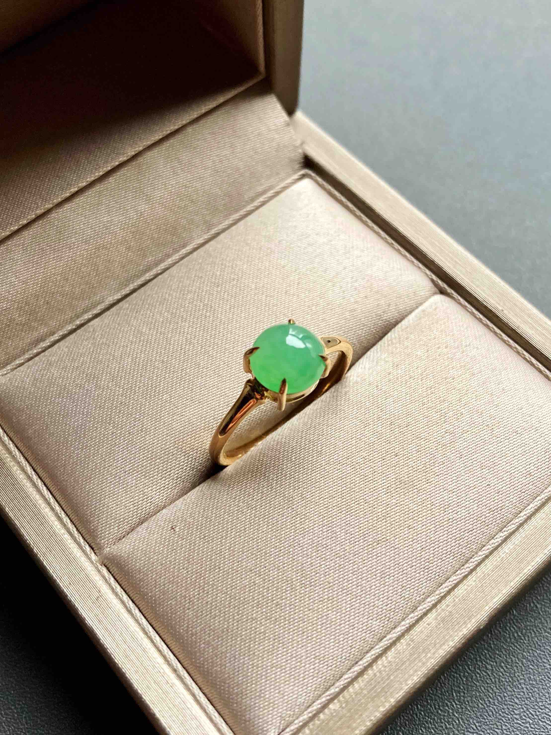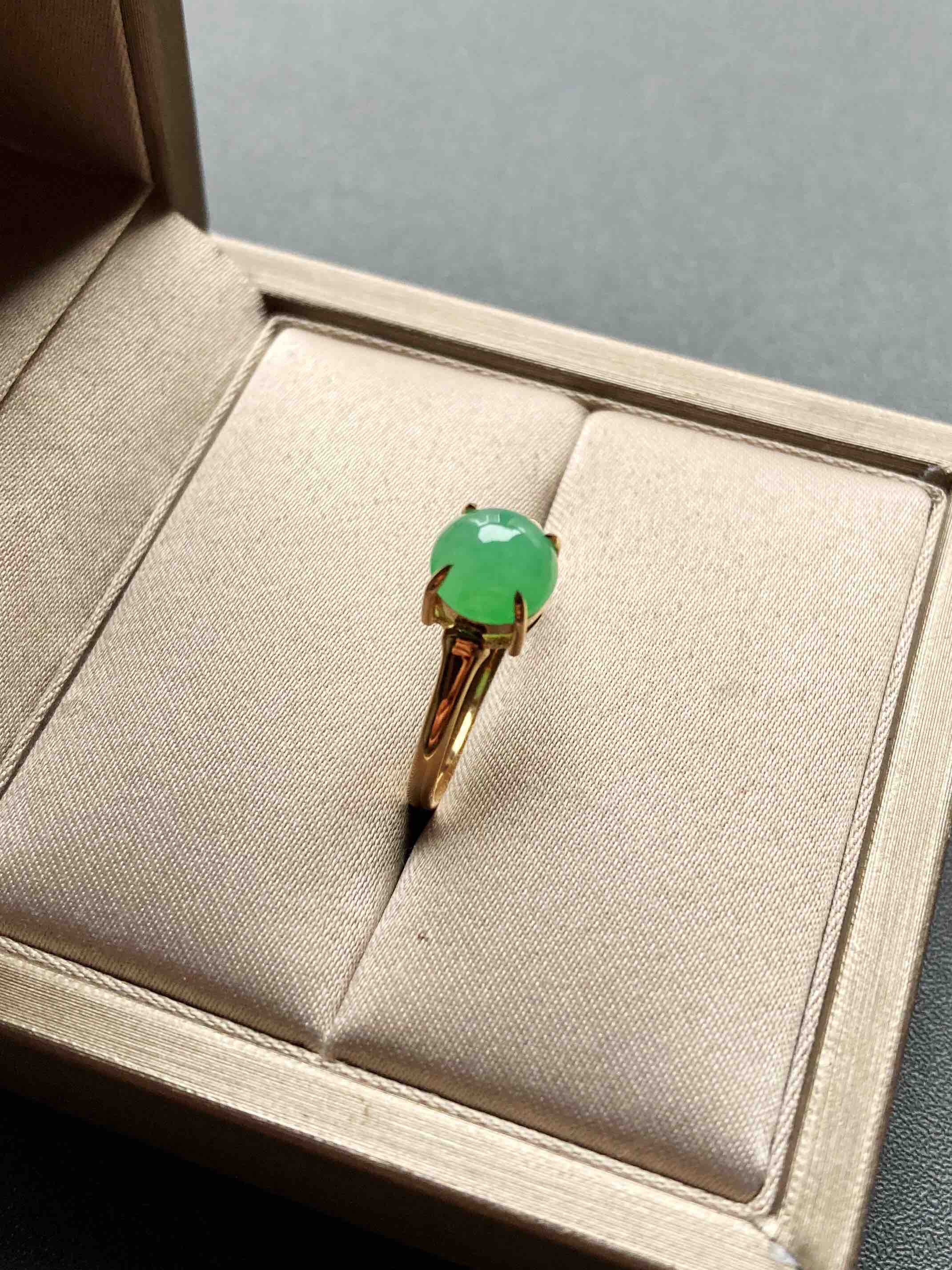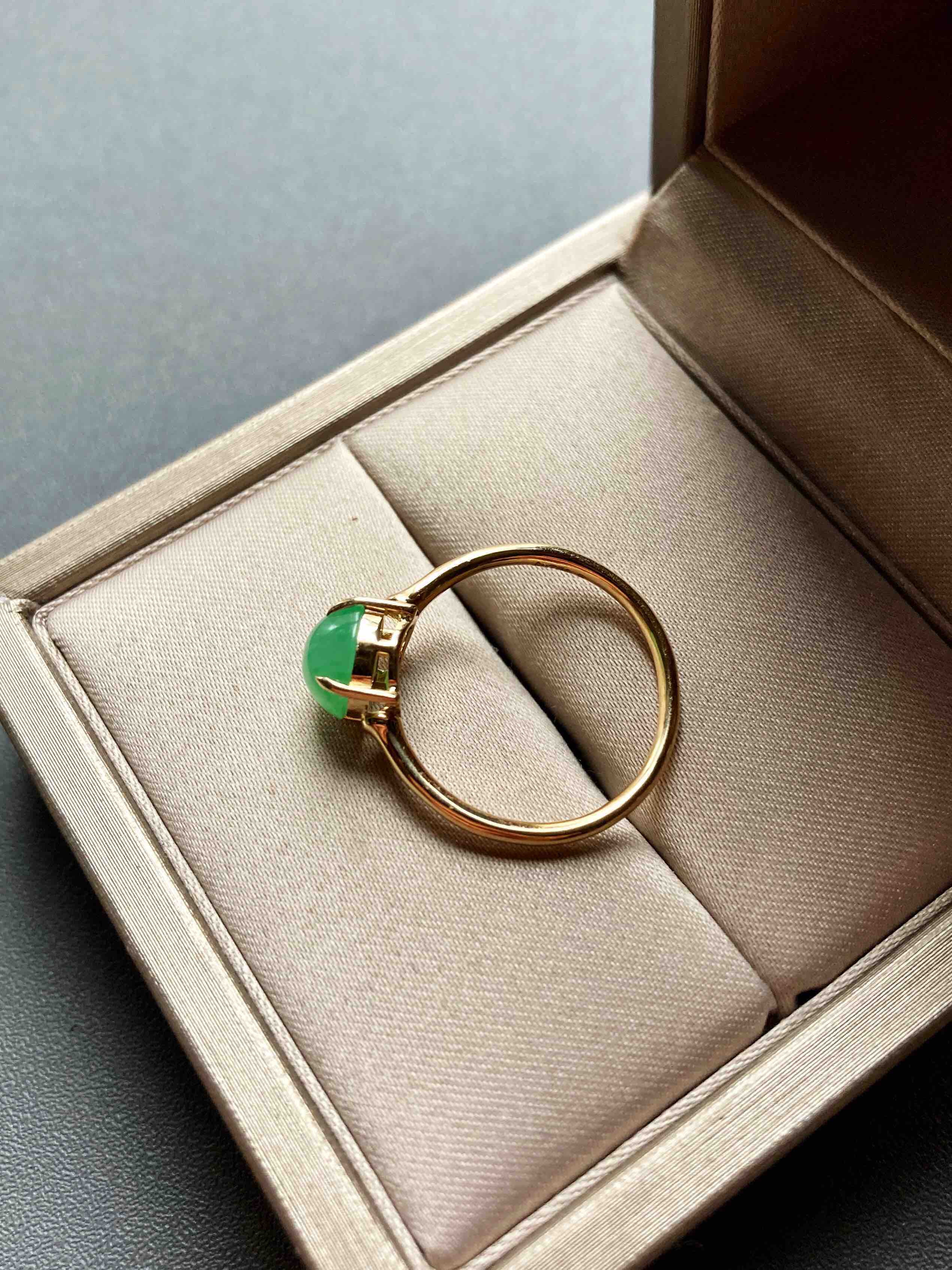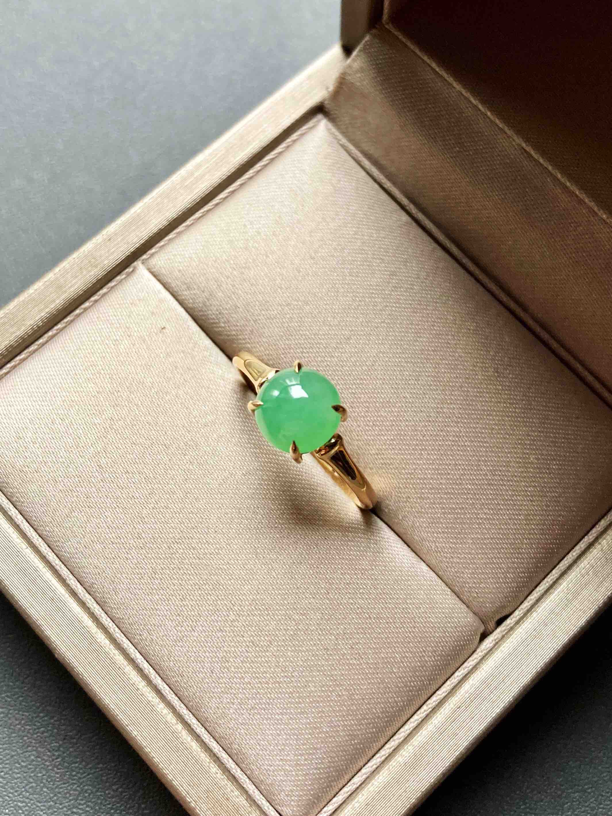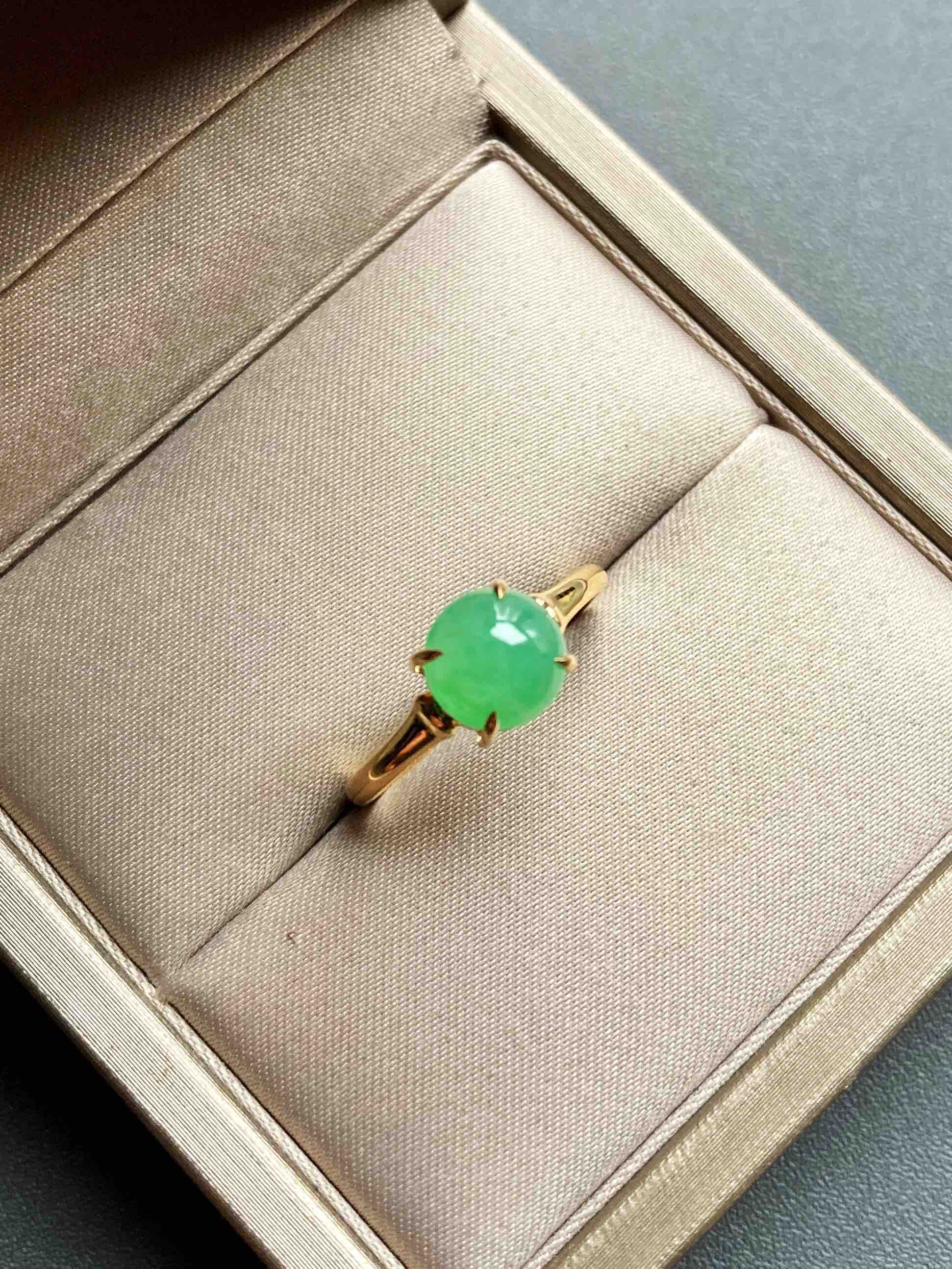 冰种阳绿翡翠蛋面戒指18k黄金镶嵌,蛋面7.3×7.3×3.9mm,禄来家的人气款式之一,蛋面种水清透,阳绿甜美,竹节的设计细节,18k黄金镶嵌,难得的正圆蛋面,厚实饱满,是你的菜吗,圈号13,可以改大小