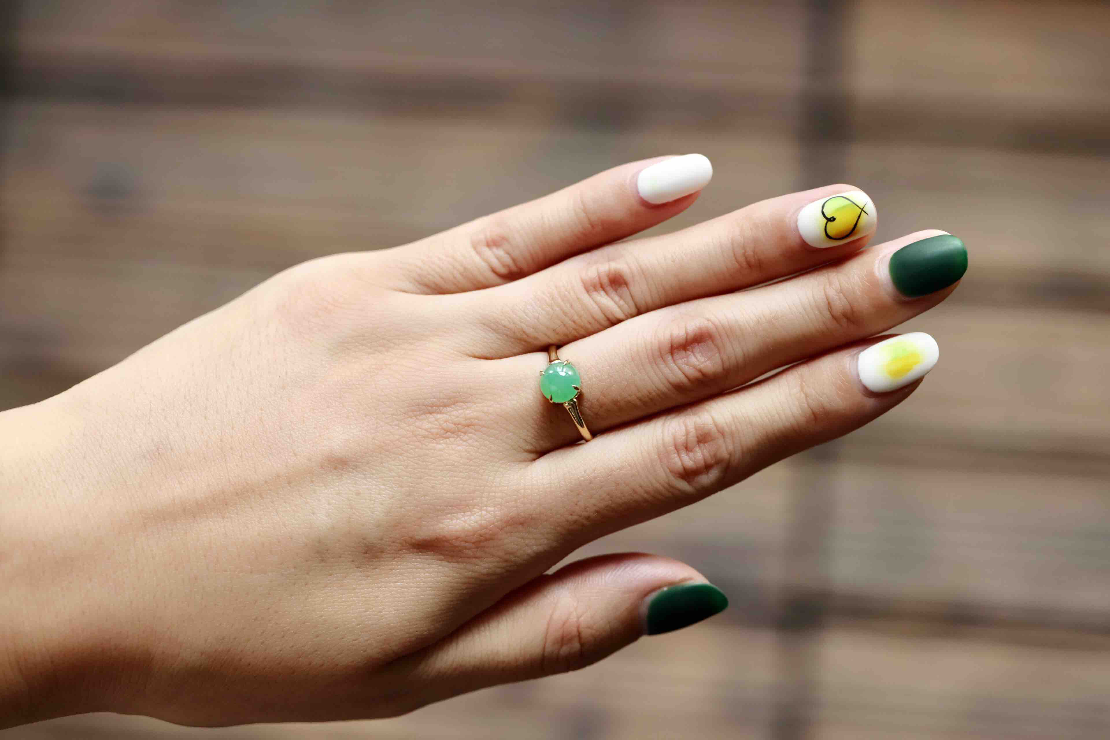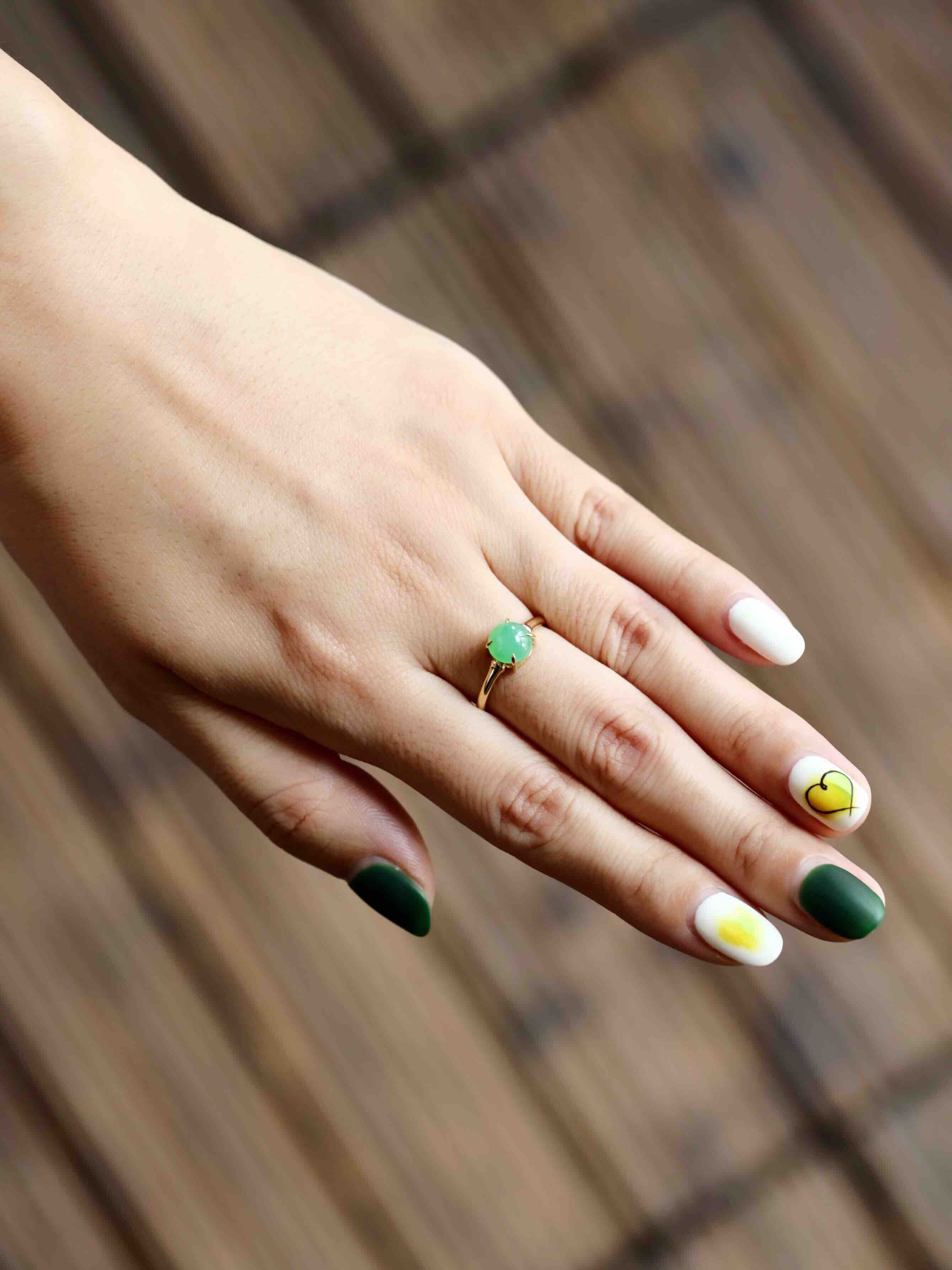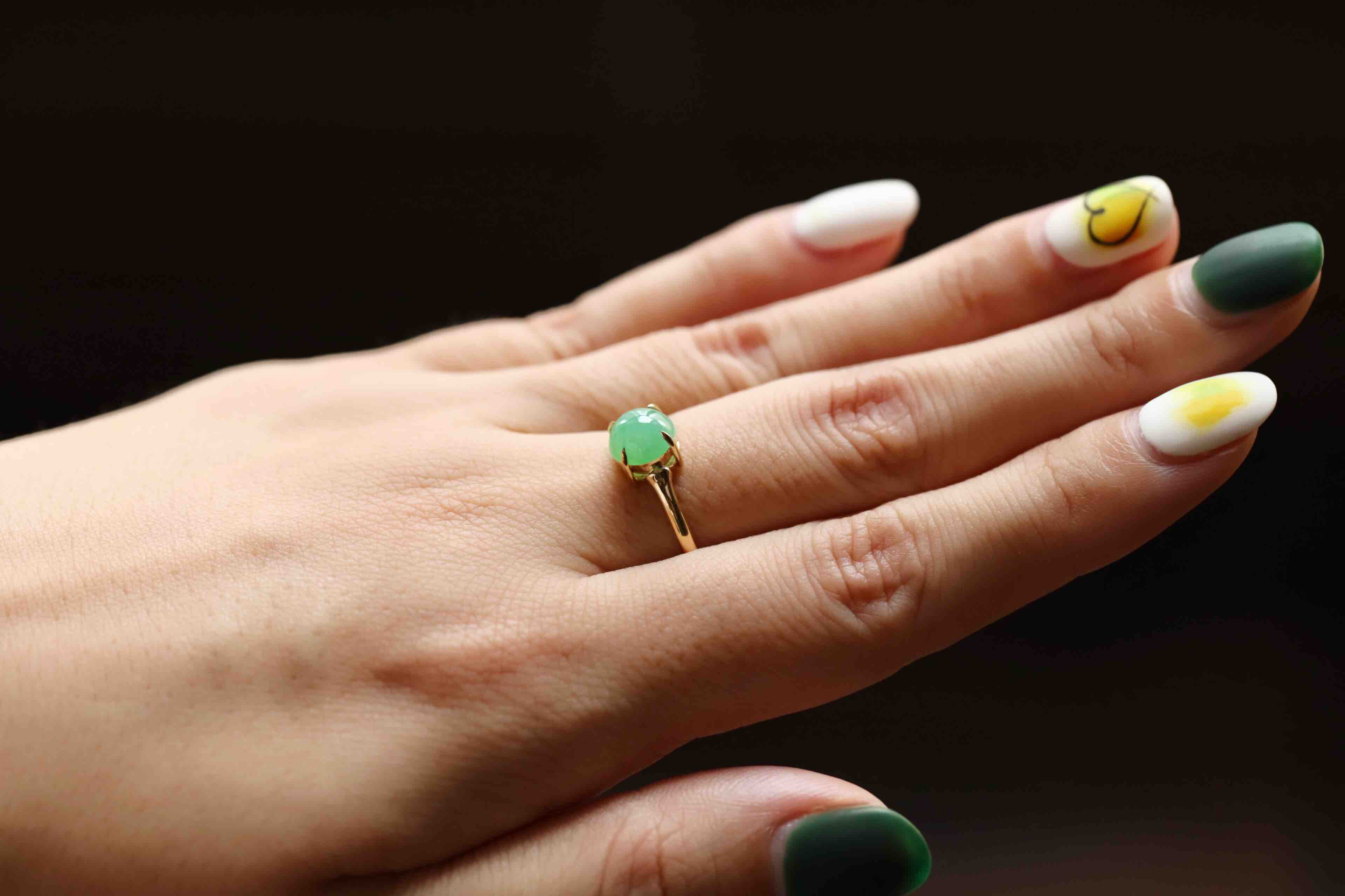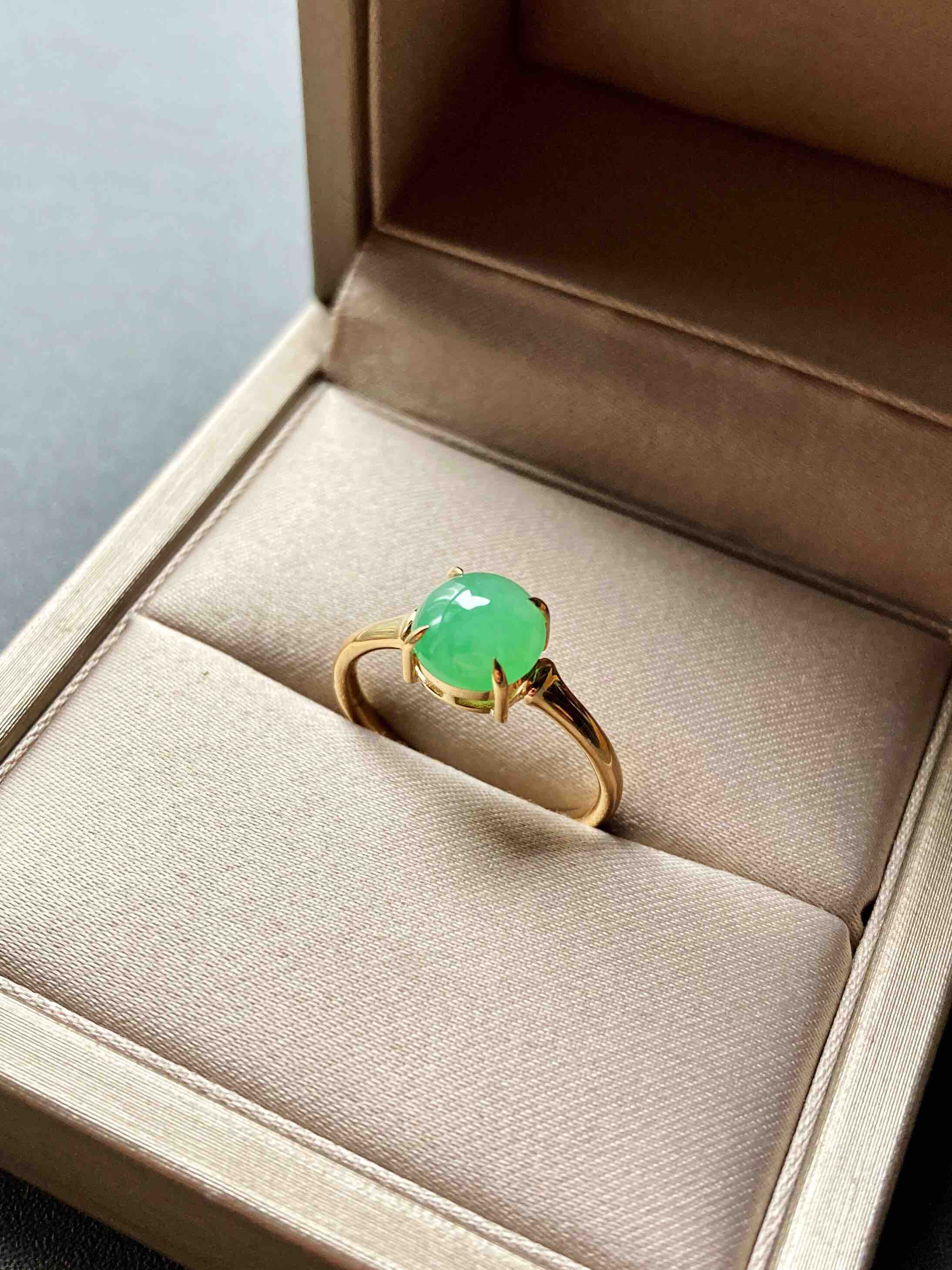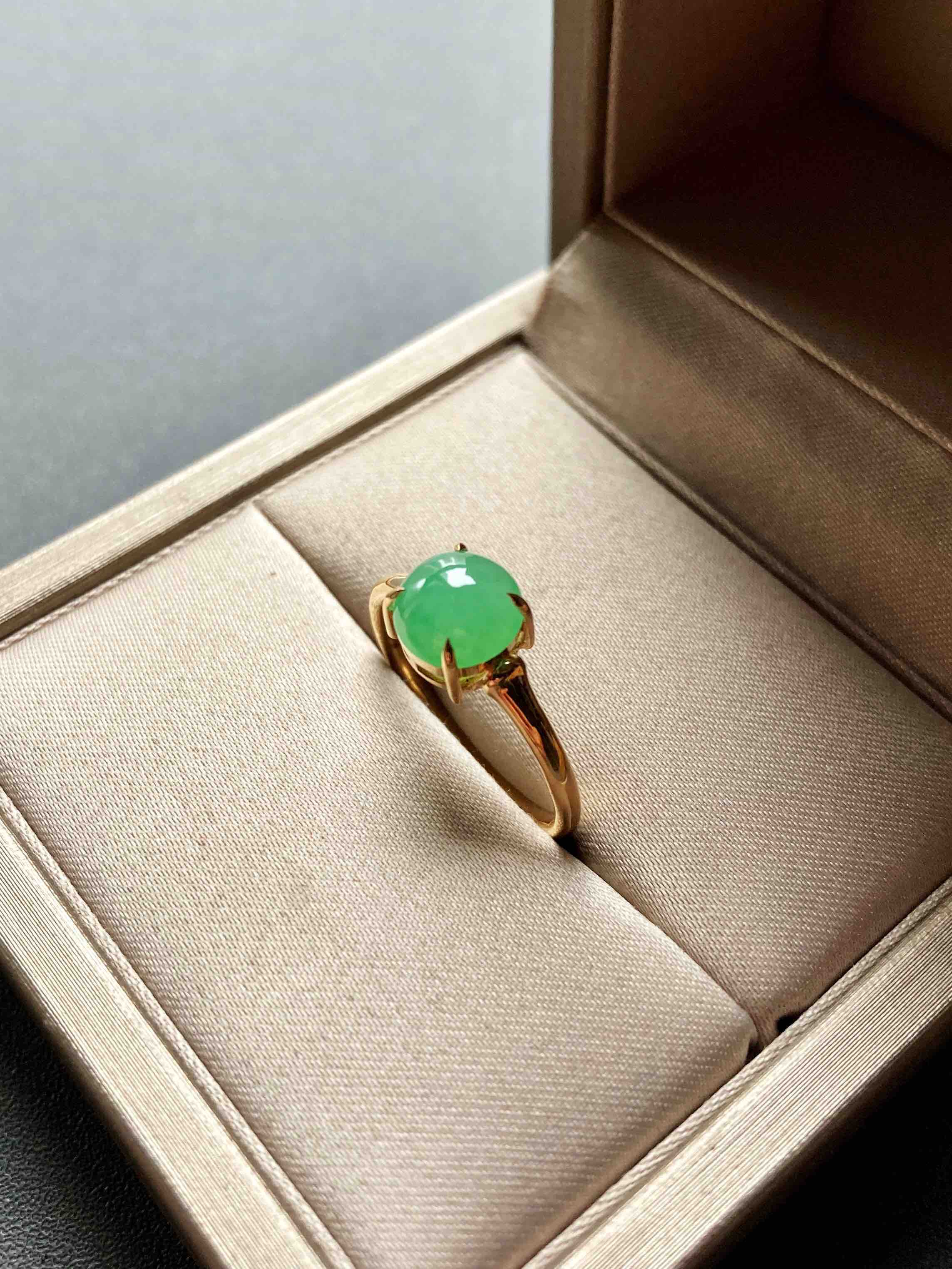 冰种阳绿翡翠蛋面戒指18k黄金镶嵌,蛋面7.3×7.3×3.9mm,禄来家的人气款式之一,蛋面种水清透,阳绿甜美,竹节的设计细节,18k黄金镶嵌,难得的正圆蛋面,厚实饱满,是你的菜吗,圈号13,可以改大小