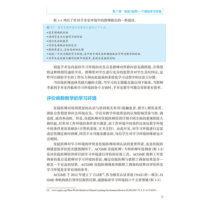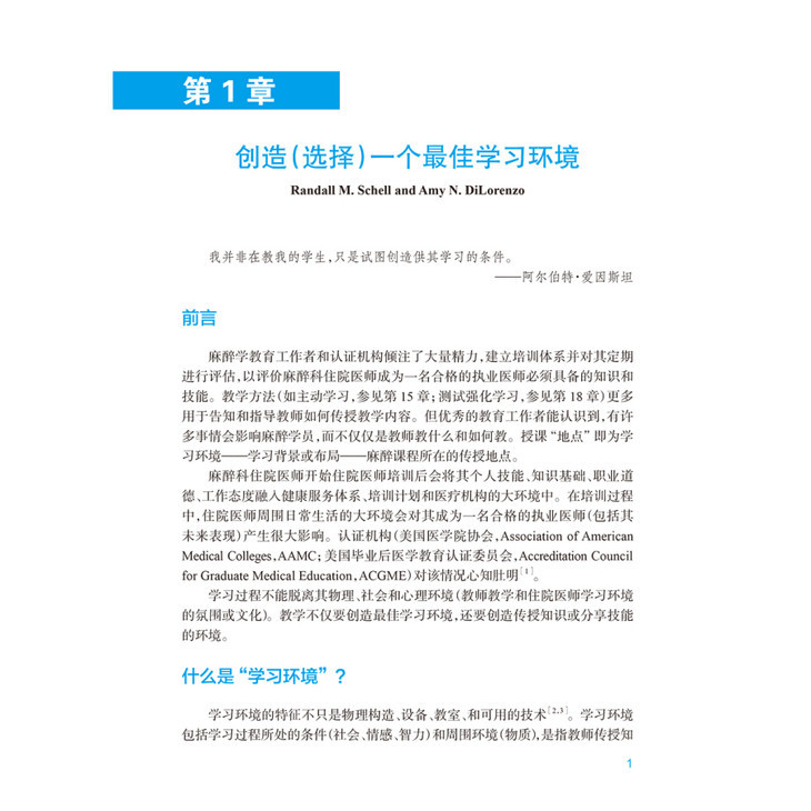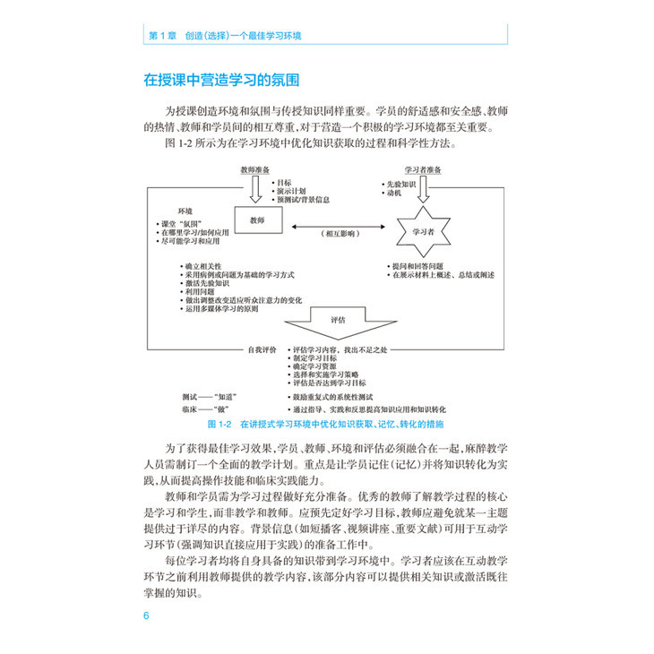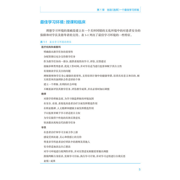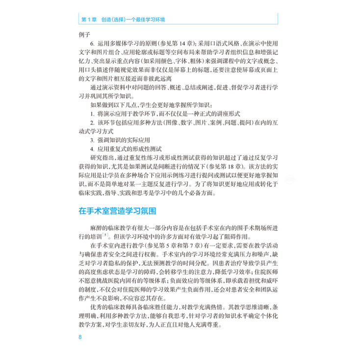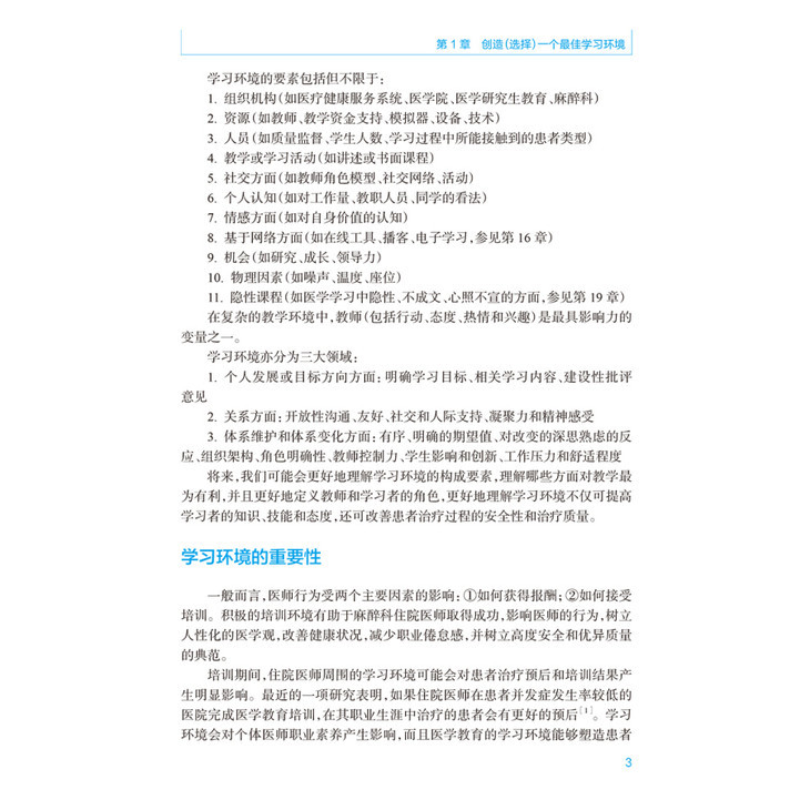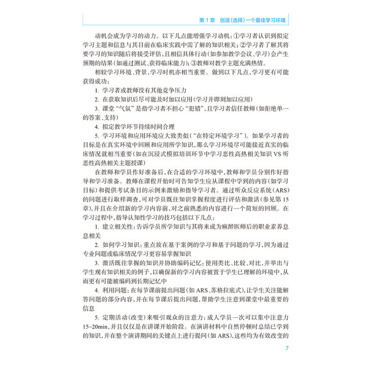 术中共23章,内容包括建立最佳学习环境,课堂教学,电子学习,多媒体使用、反馈,教学专业性、模拟作用等方面的新信息。针对所有目前相关的麻醉技术(例如区域阻滞、气道管理、食道超声等)进行详细的教学经验指导;对培训住院医师提供课程设计、教授场所、模拟人使用等的资深建议;对教师的教学评估、教学质量控制评估给与明确的方案