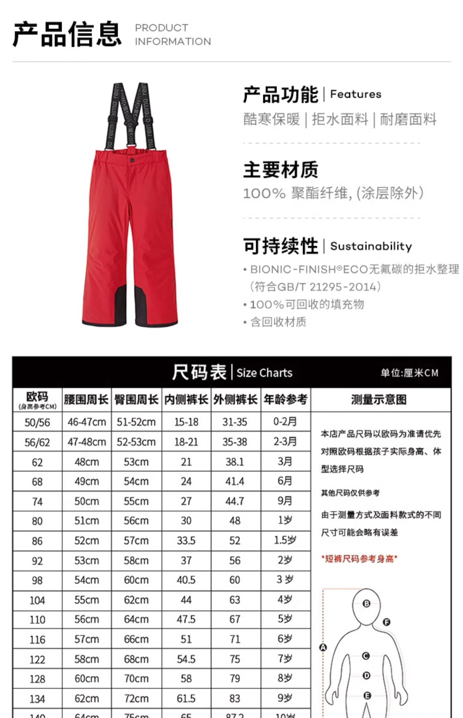 【断码五折】芬兰reima男女儿童中童拒水防风透湿耐磨儿童棉裤 5100099B