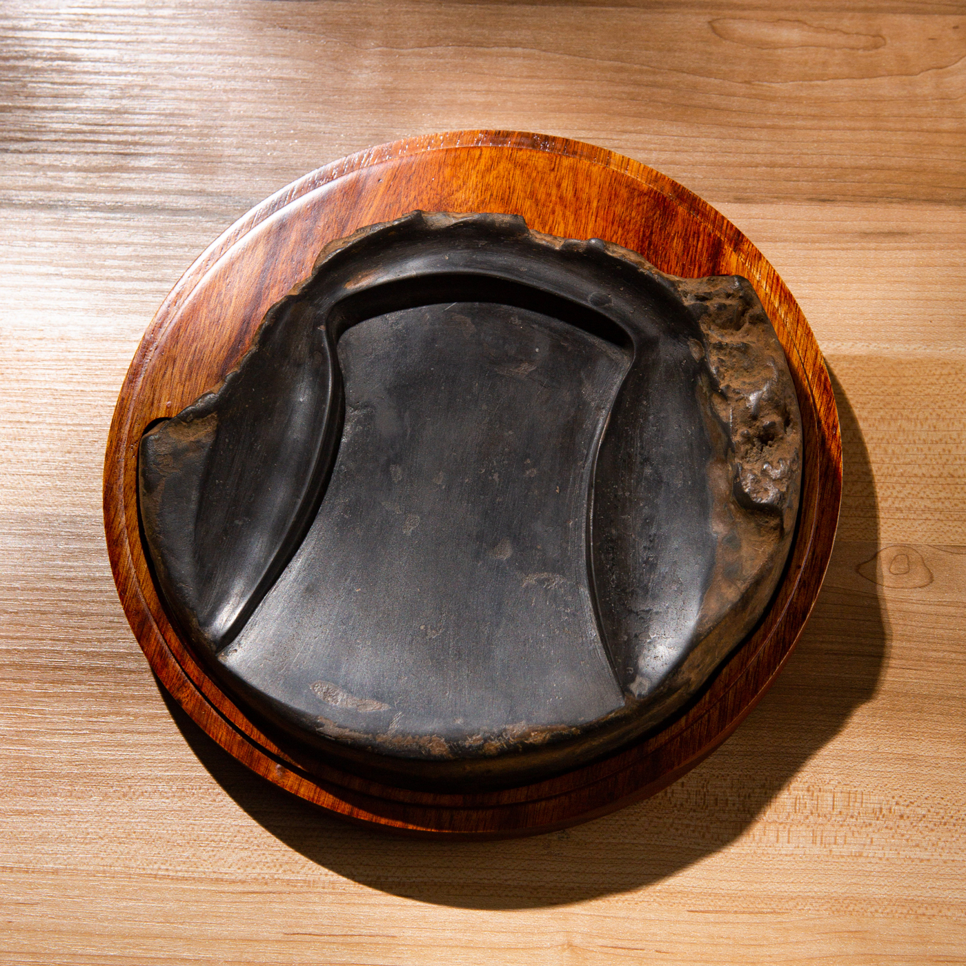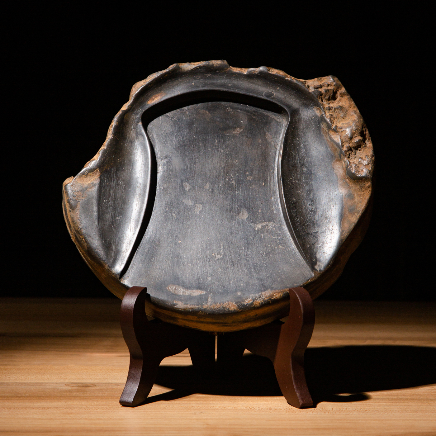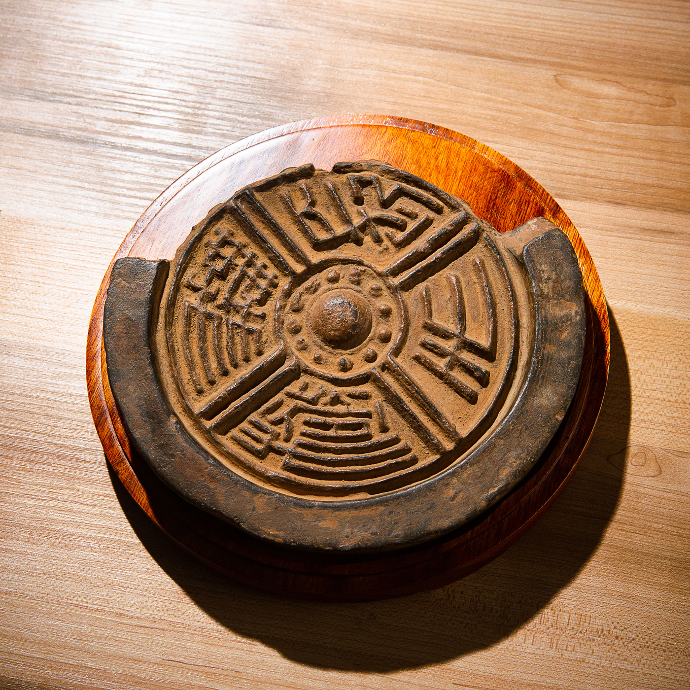 汉代“长生无极”瓦当制砚。其文字精美古拙,字口清晰有力度,胎质坚实细腻,整体呈现古朴之气息,且配有手工精制刻字木盒。
