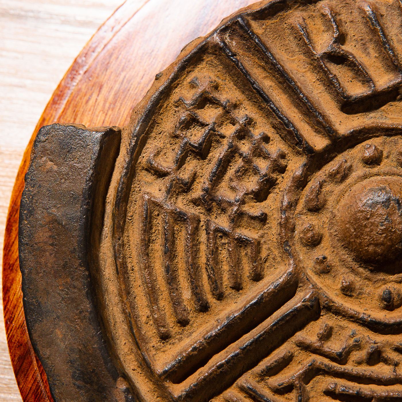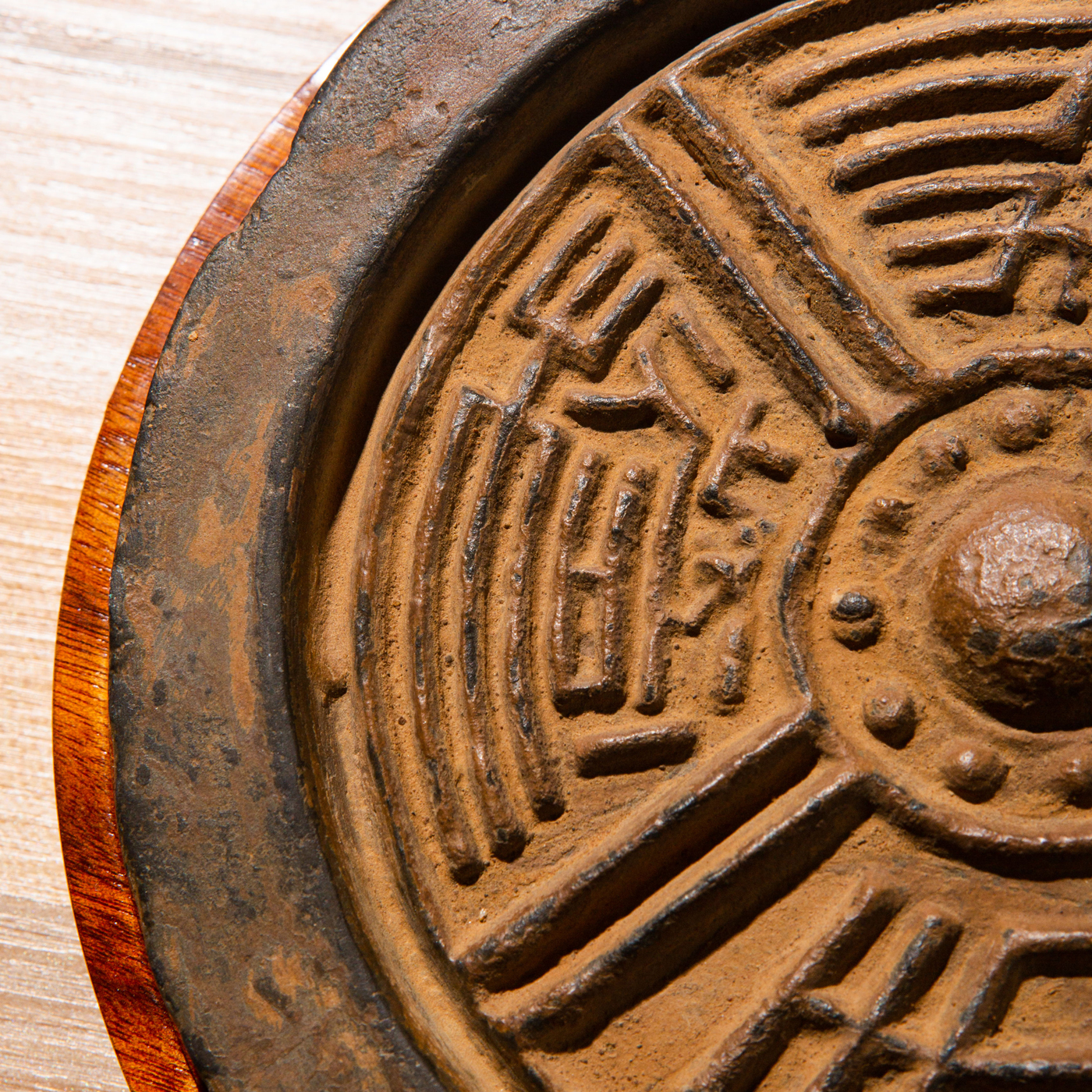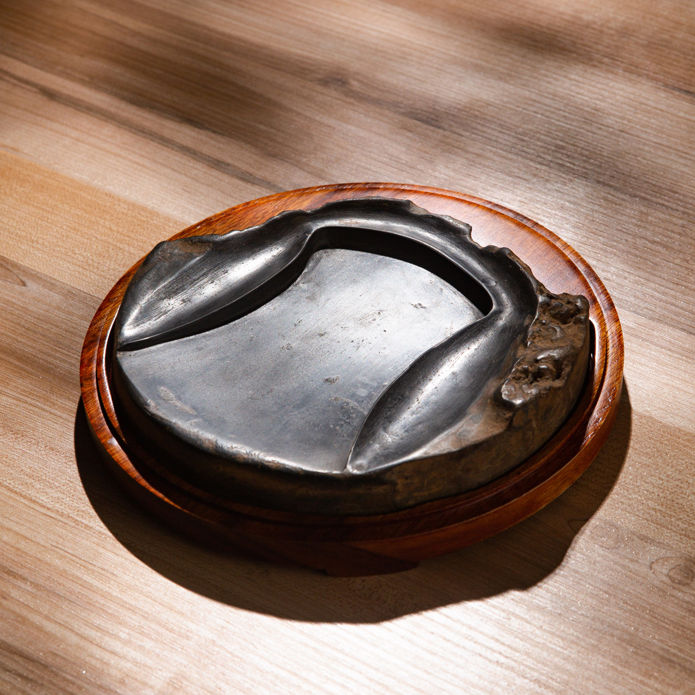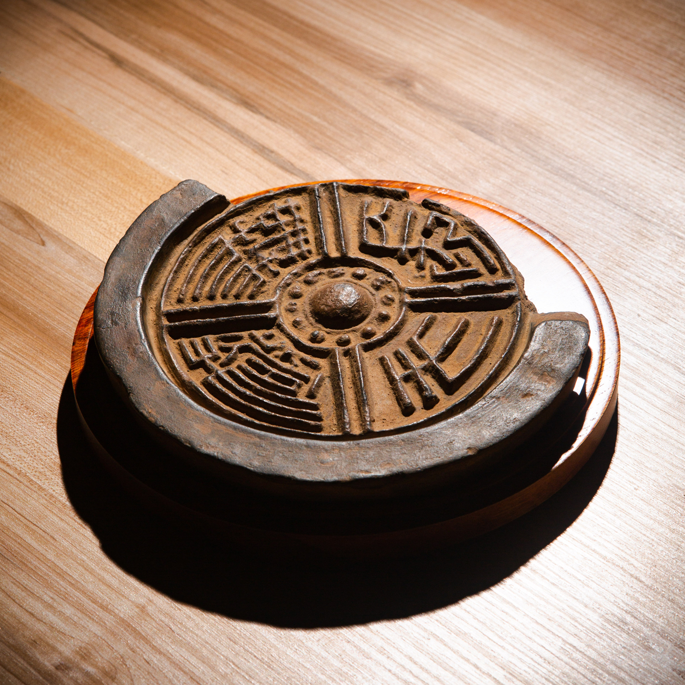 汉代“长生无极”瓦当制砚。其文字精美古拙,字口清晰有力度,胎质坚实细腻,整体呈现古朴之气息,且配有手工精制刻字木盒。
