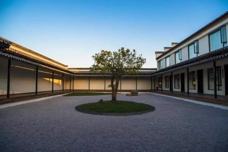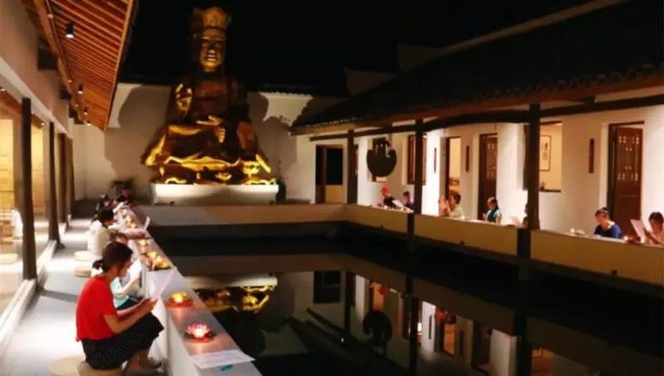 四周被白墙黛瓦的空间围绕,一边是佛学大教堂,一边是私密的抄经室、茶艺室。