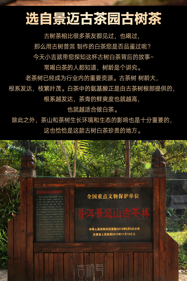 古树茶相信很多茶友都见过,也喝过,那么用古树制作的白茶您是否品鉴过呢?今天小吉就带您探知这杯古树白茶背后的故事。常喝白茶的人都知道,树龄是个讲究。老茶树已经成为行业内的重要资源,古树茶树龄大,根系发达,枝繁叶茂。白茶中的氨基酸正是由古茶树根部提供的,根系越发达,茶青的鲜爽度也越高,也就越适合做白茶。除此之外,茶山和茶树生长环境和生态的影响也是十分重要的,这也恰恰是这款古树白茶珍贵的地方。