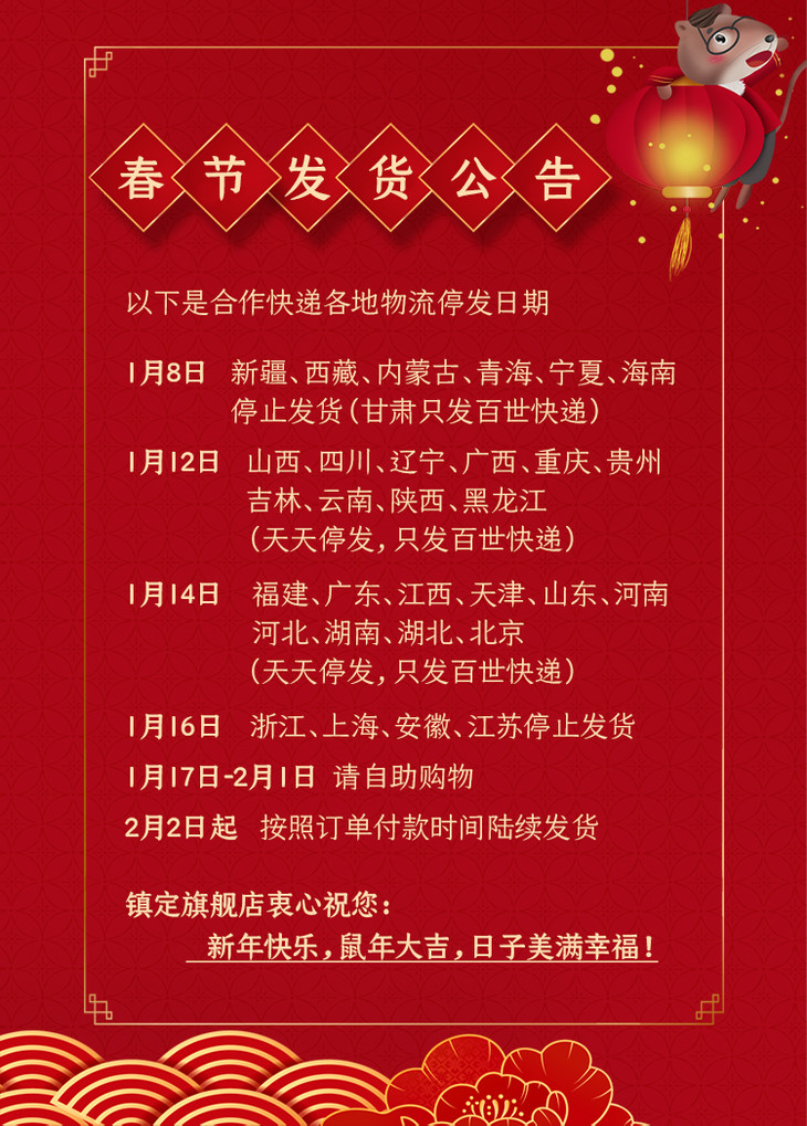 * 因春节物流问题,2020年1月15日起商城暂停发货,所有订单将在春节假期回来的第一时间按订单顺序陆续发出。给您带来的不便,敬请谅解!(如需备货请尽早合理安排下单备货)