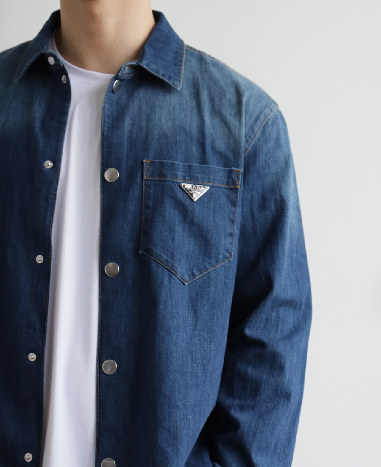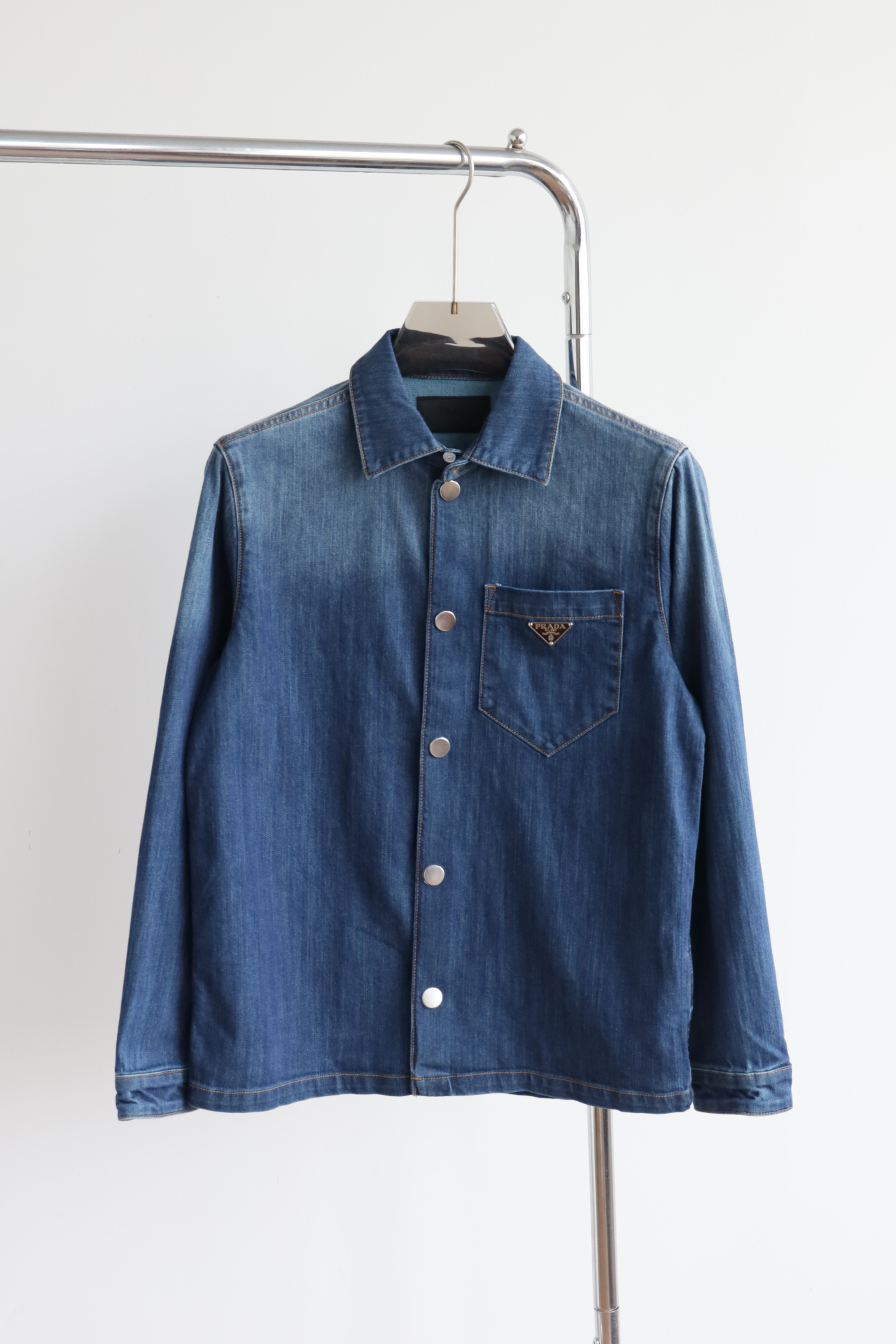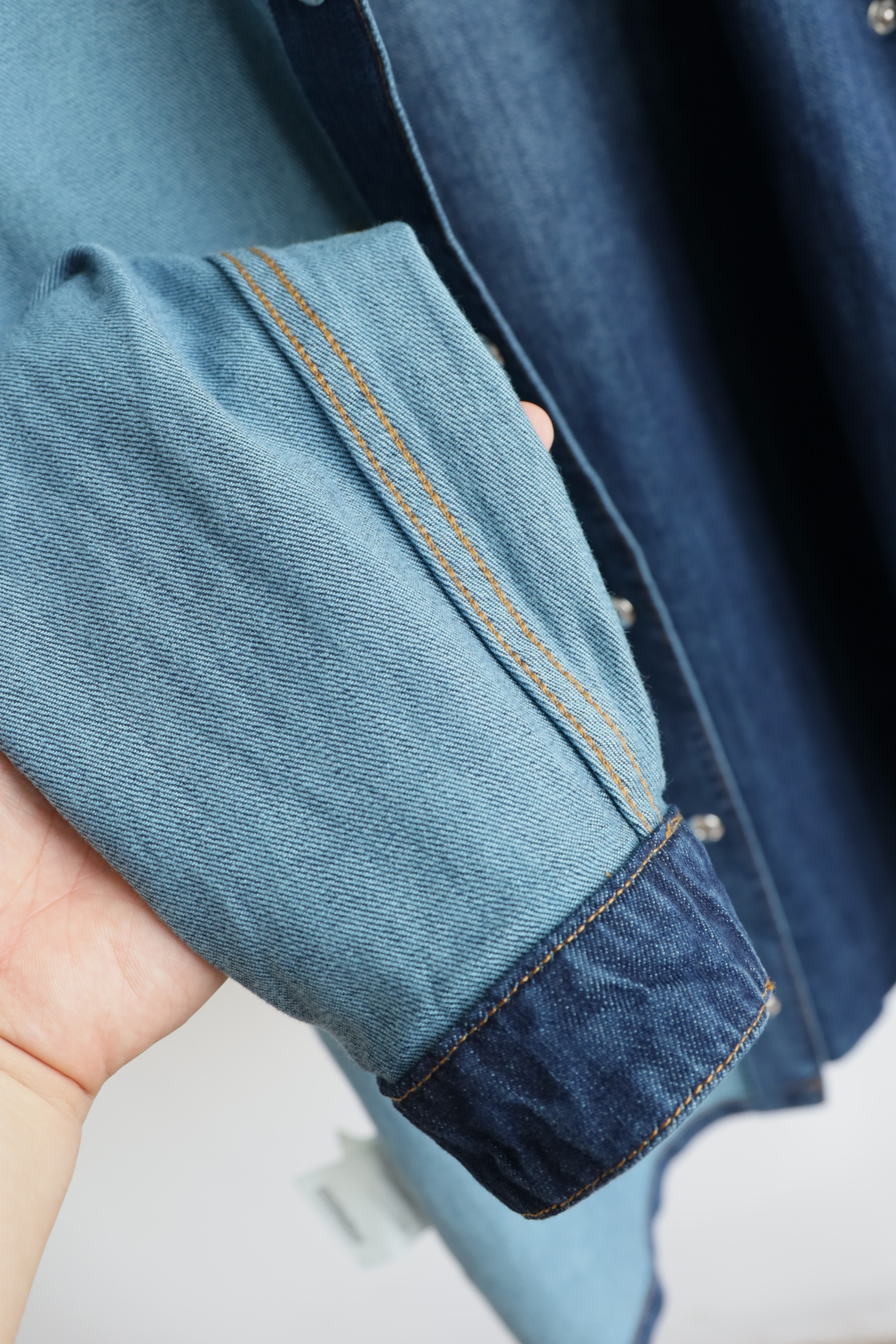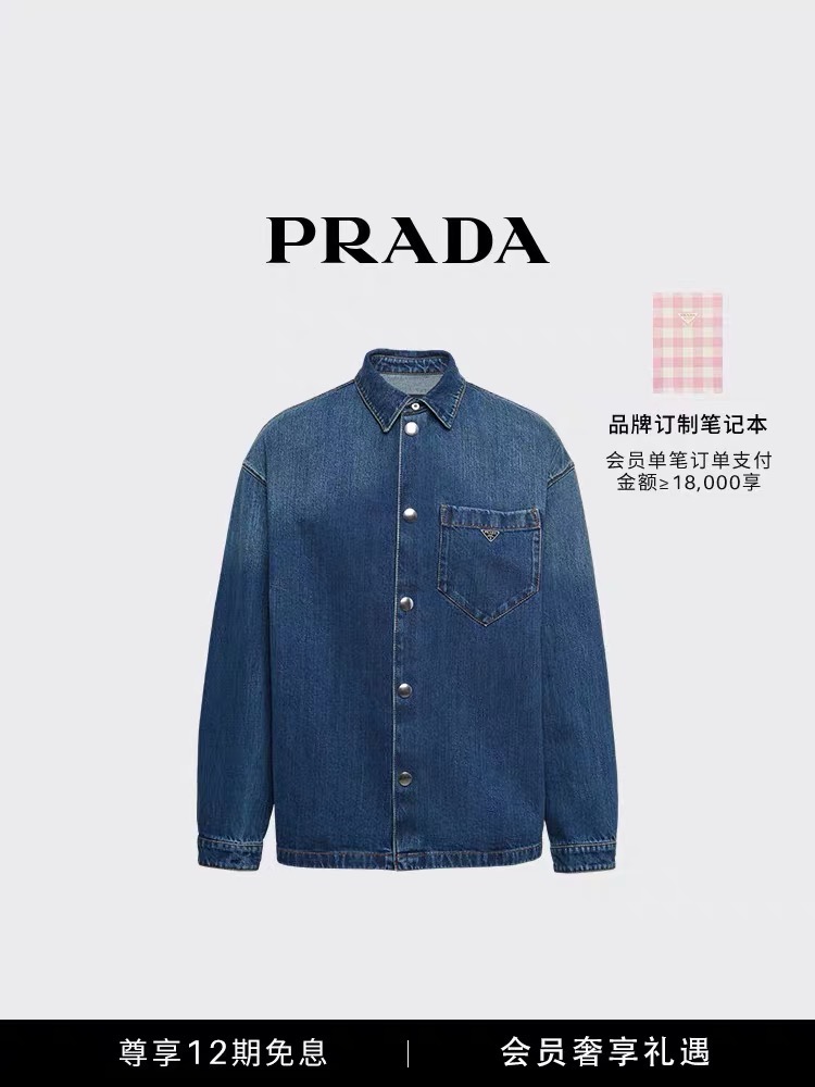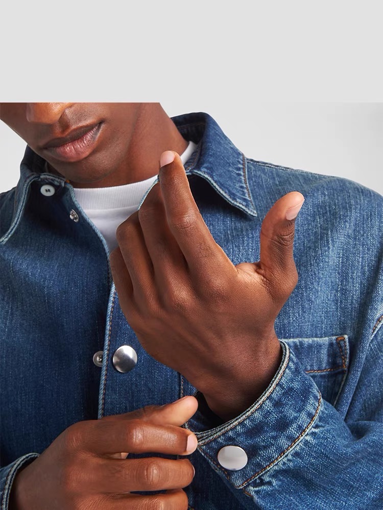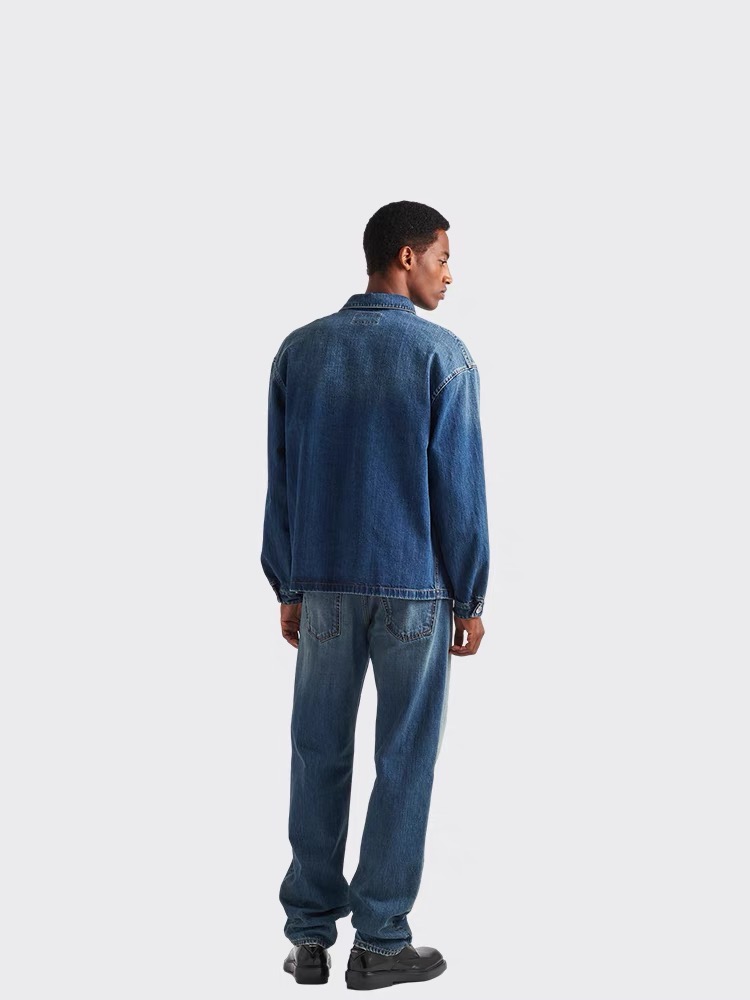细节应有尽有,渐变泛白的蓝染全棉洗水牛仔布,单侧口袋与珐琅3角标装饰