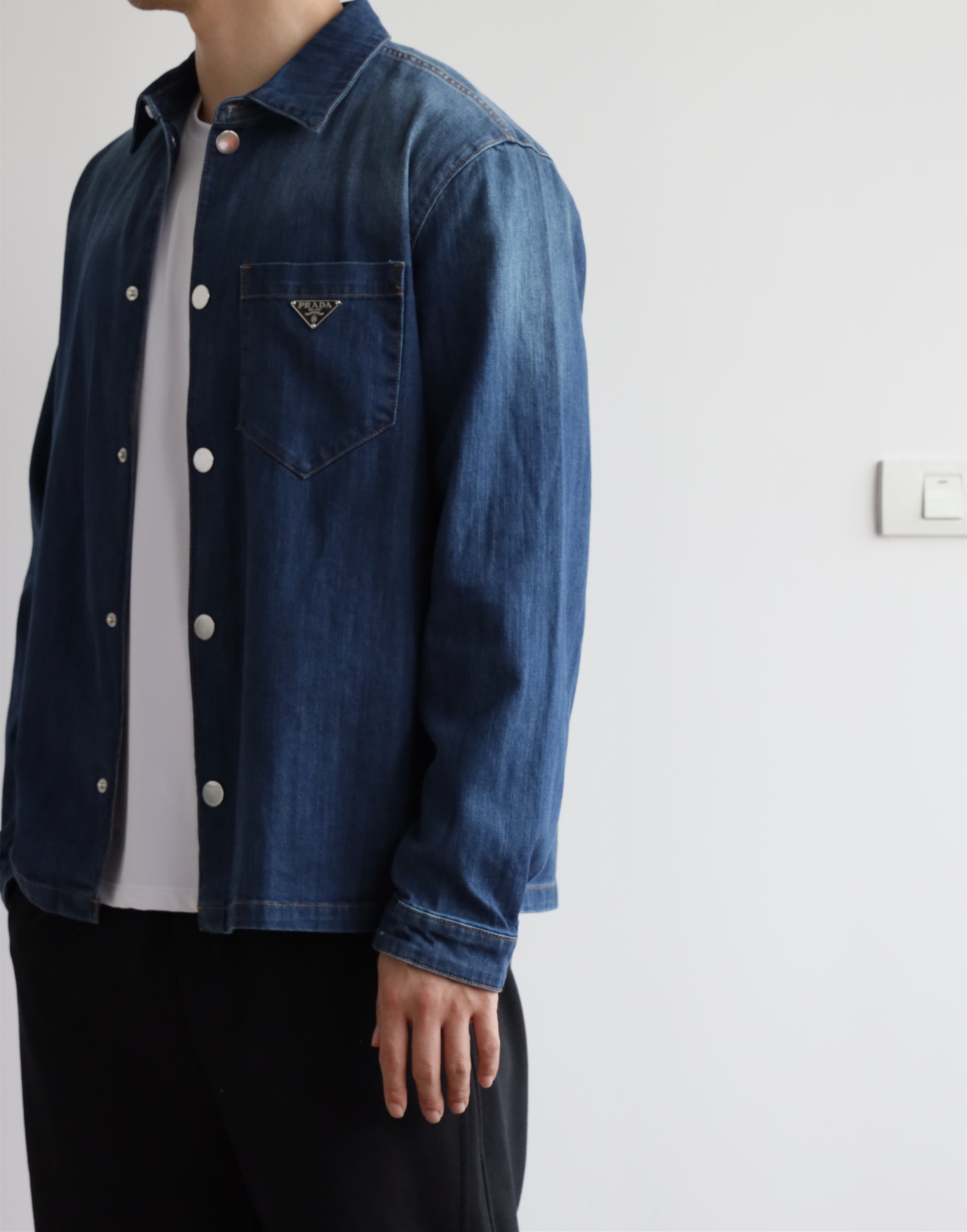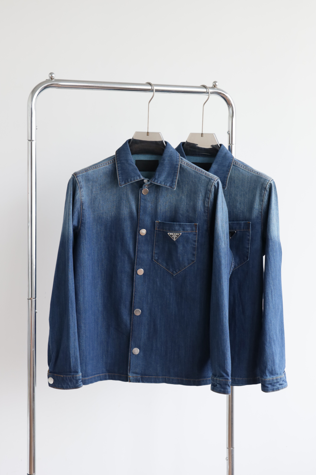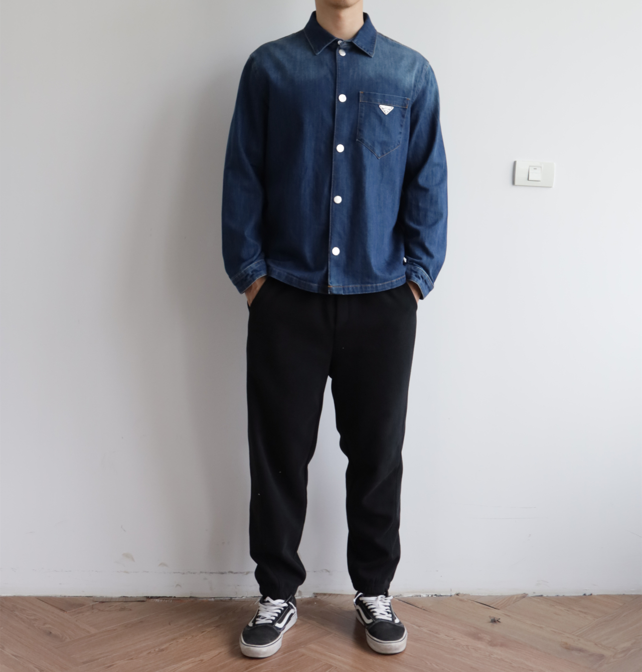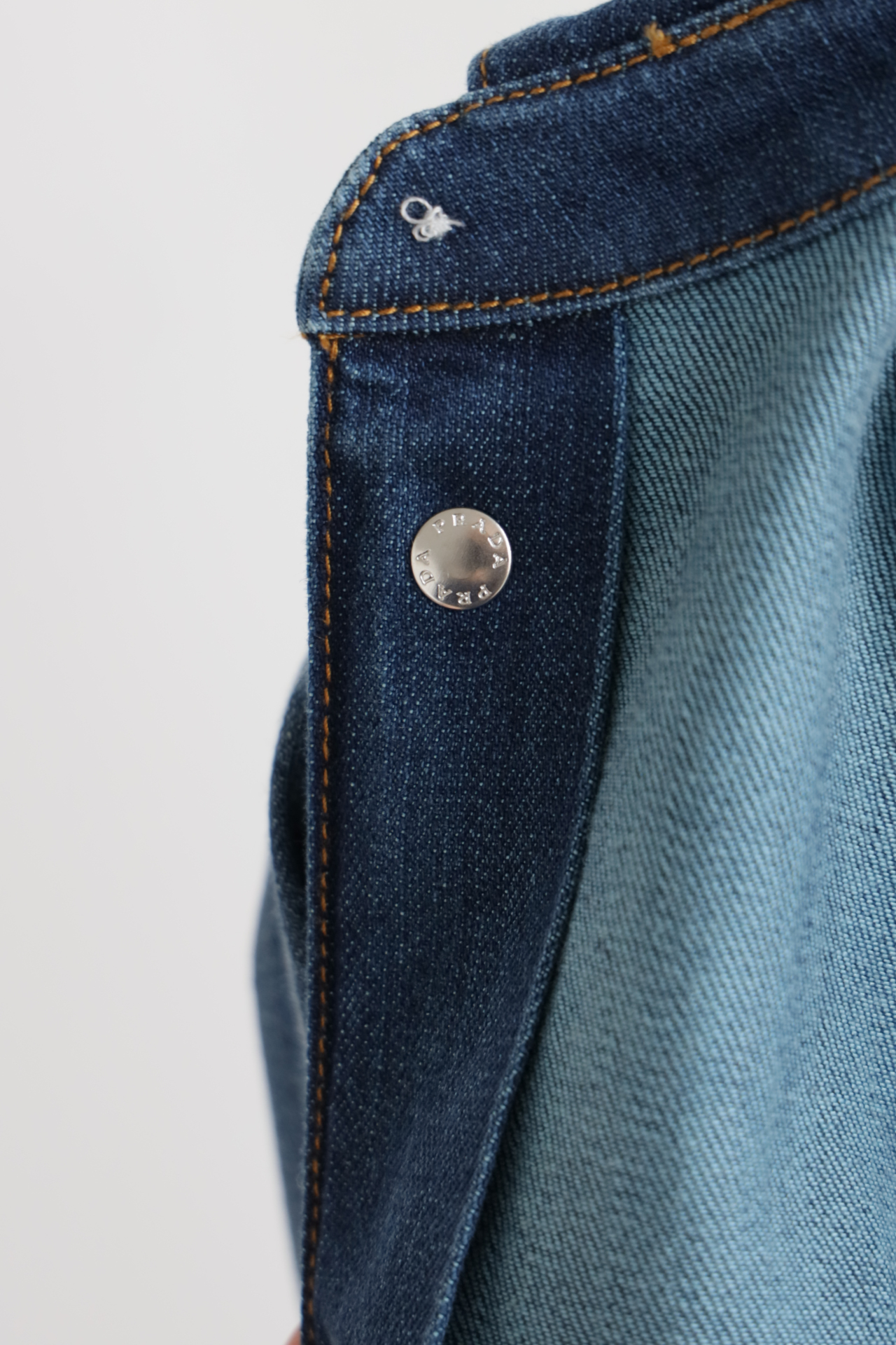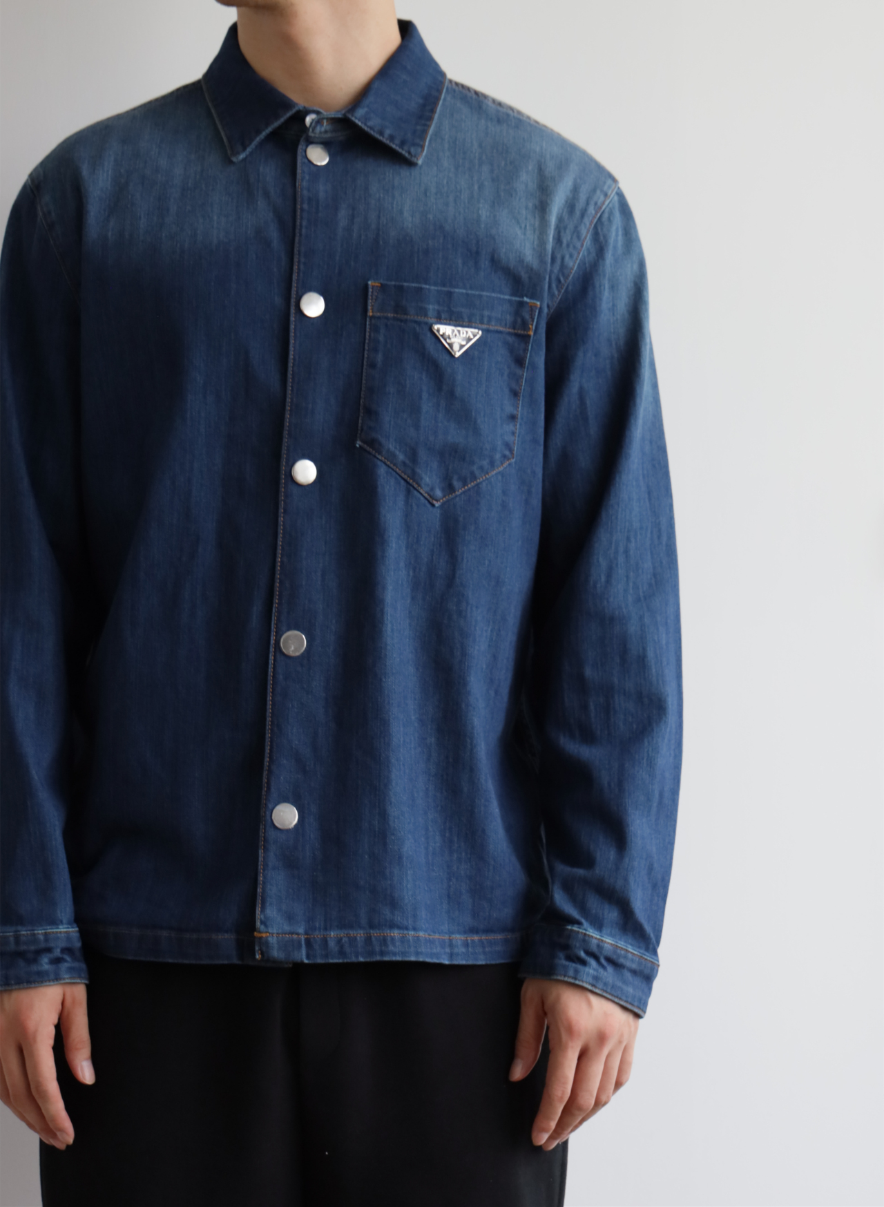 细节应有尽有,渐变泛白的蓝染全棉洗水牛仔布,单侧口袋与珐琅3角标装饰