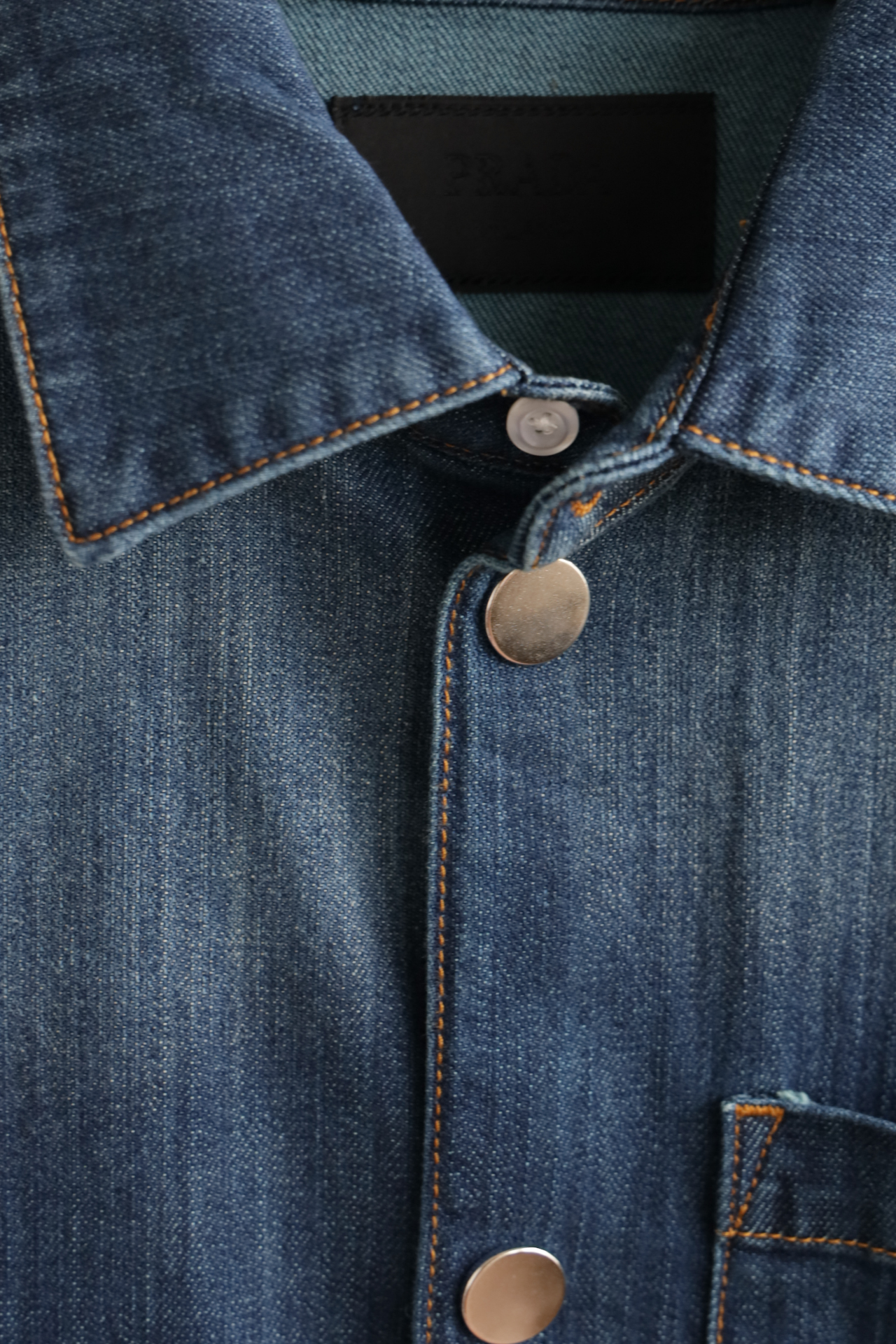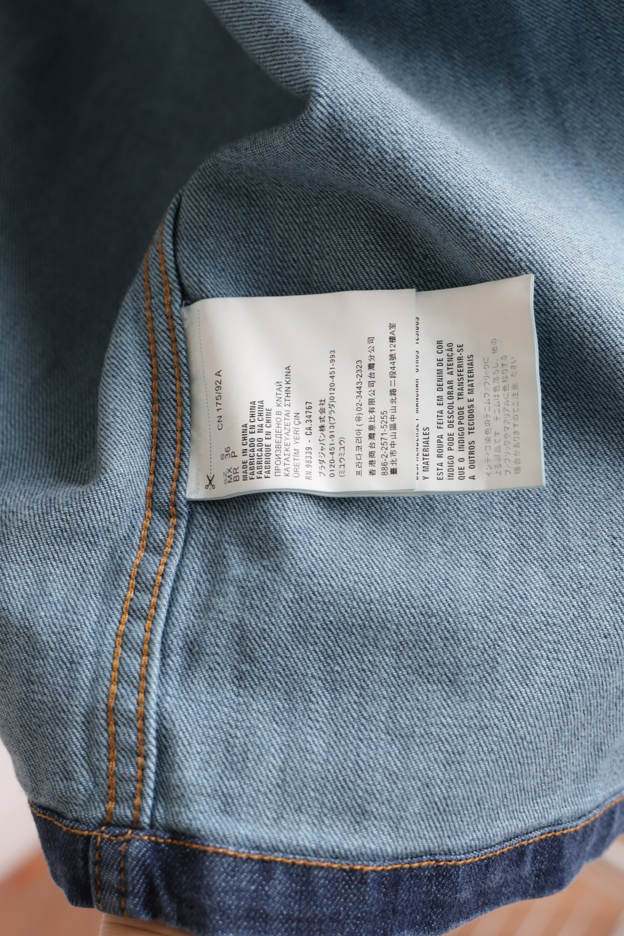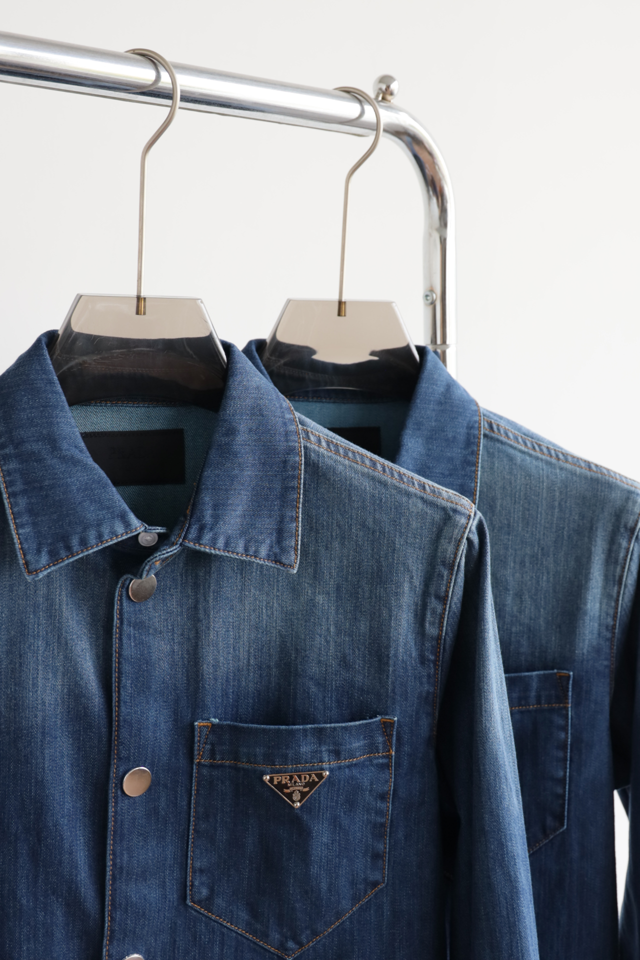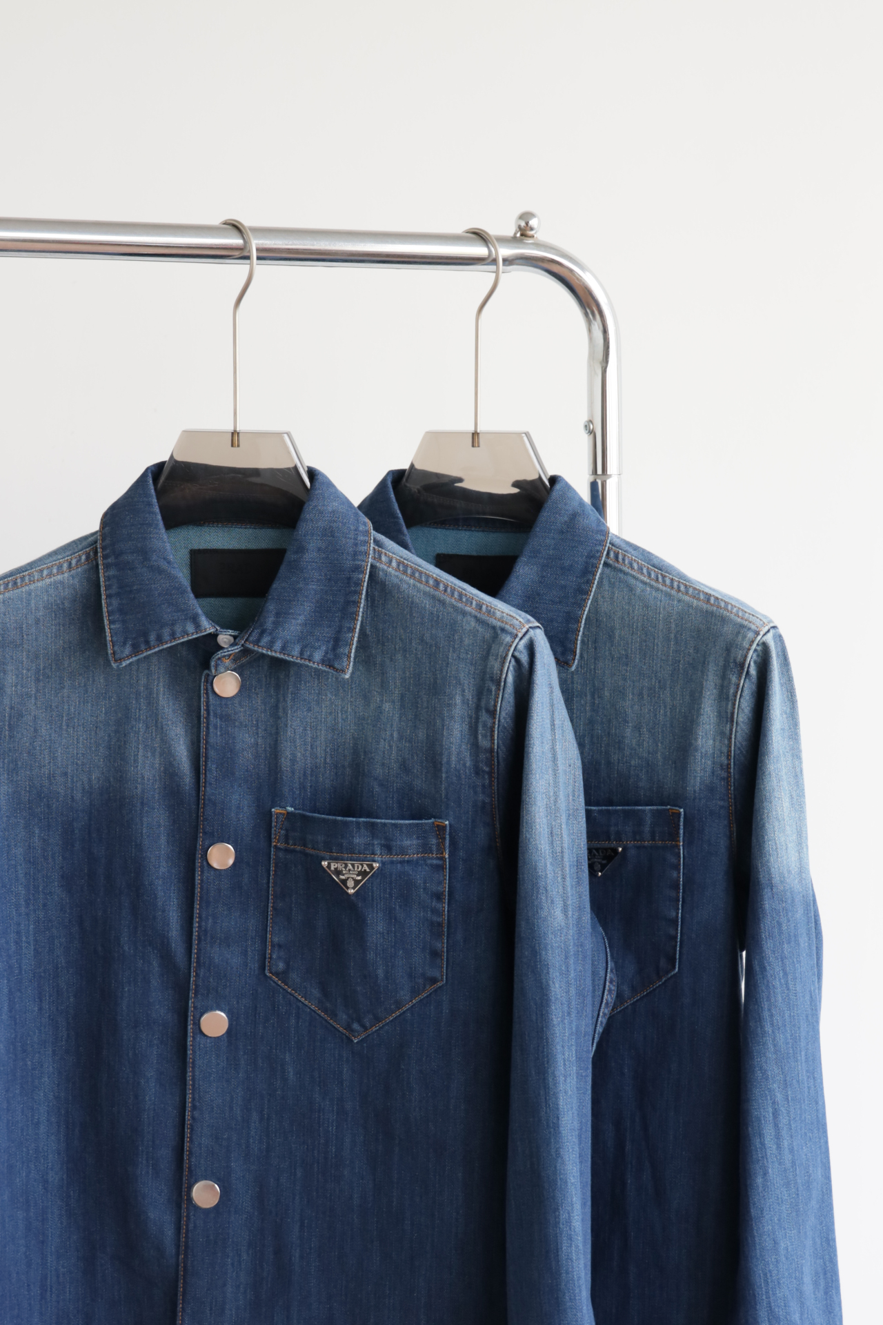 细节应有尽有,渐变泛白的蓝染全棉洗水牛仔布,单侧口袋与珐琅3角标装饰