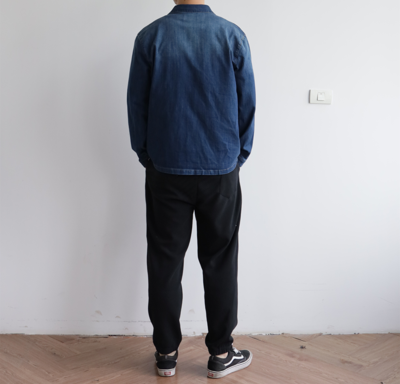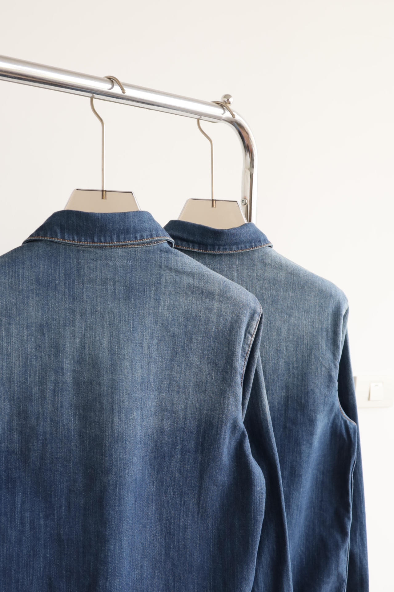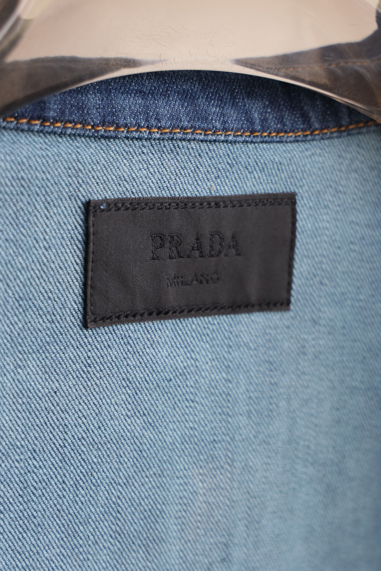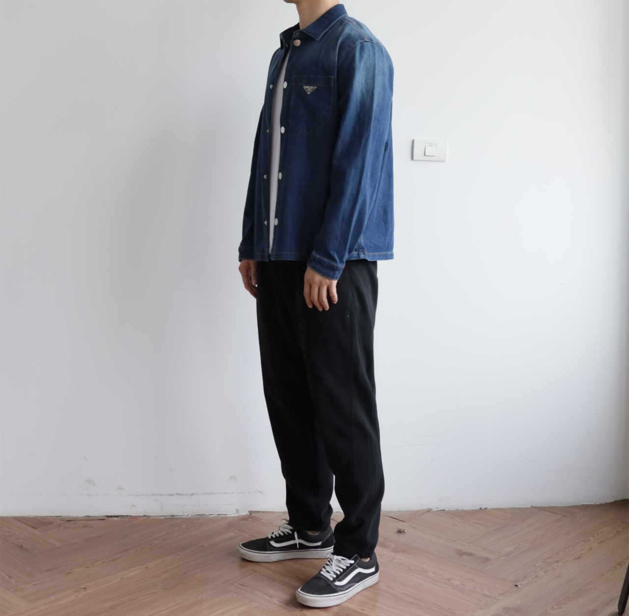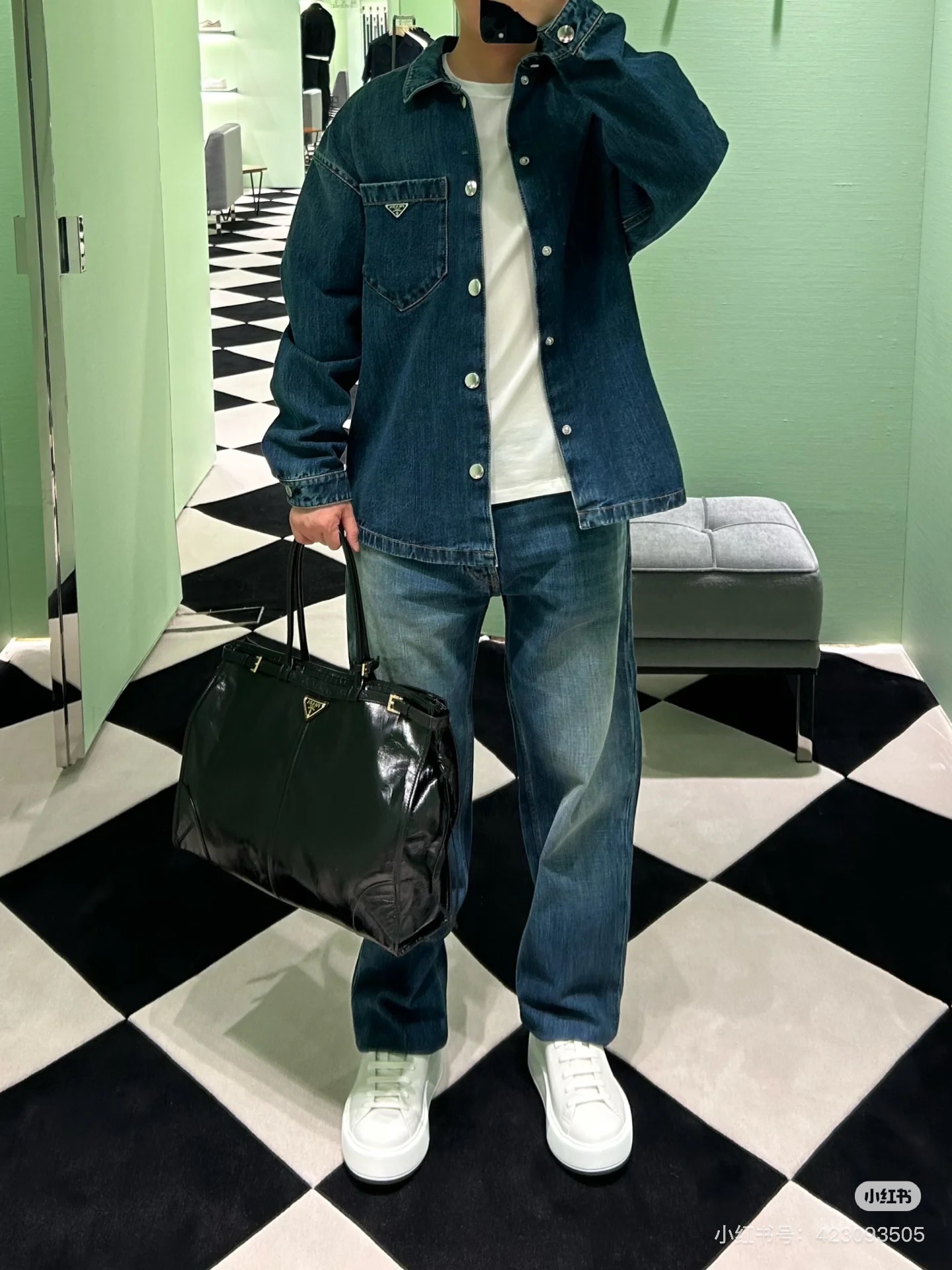 细节应有尽有,渐变泛白的蓝染全棉洗水牛仔布,单侧口袋与珐琅3角标装饰