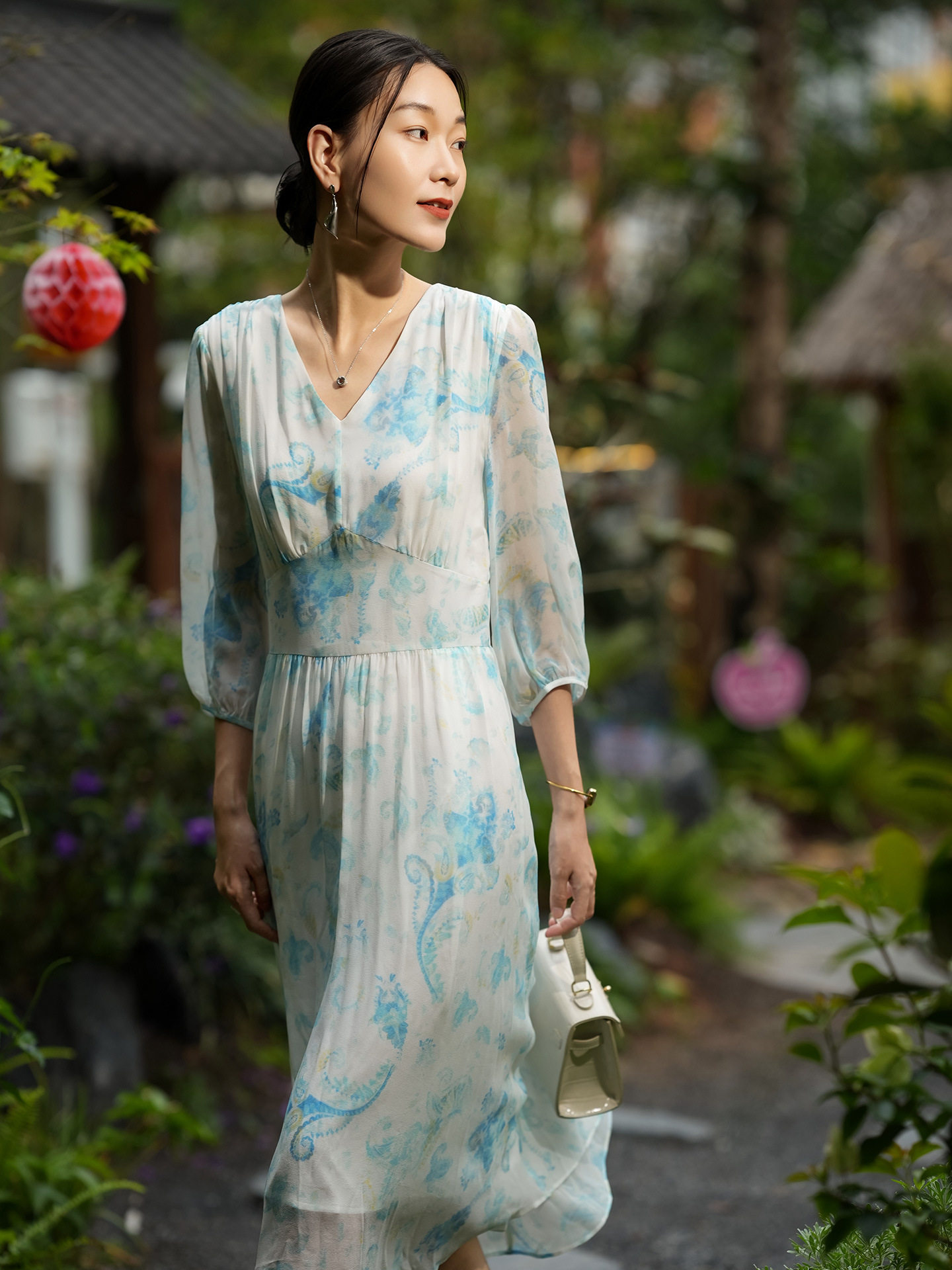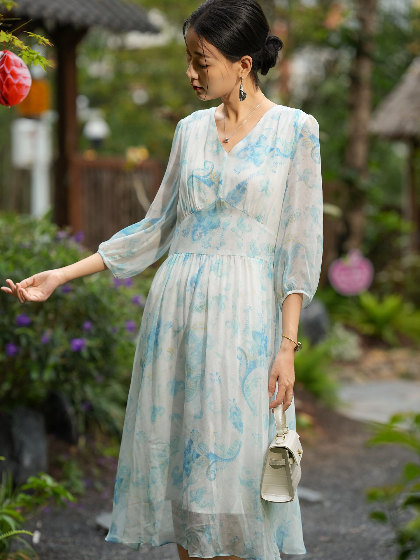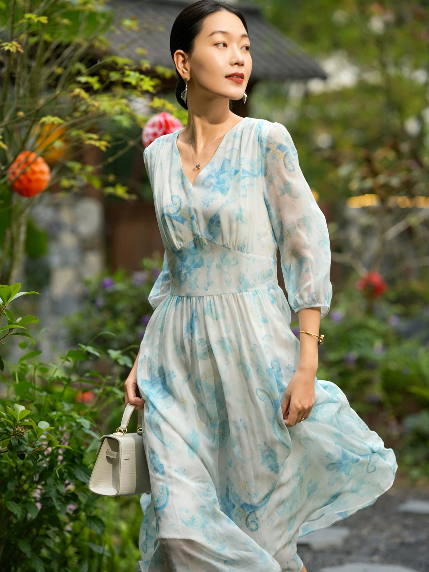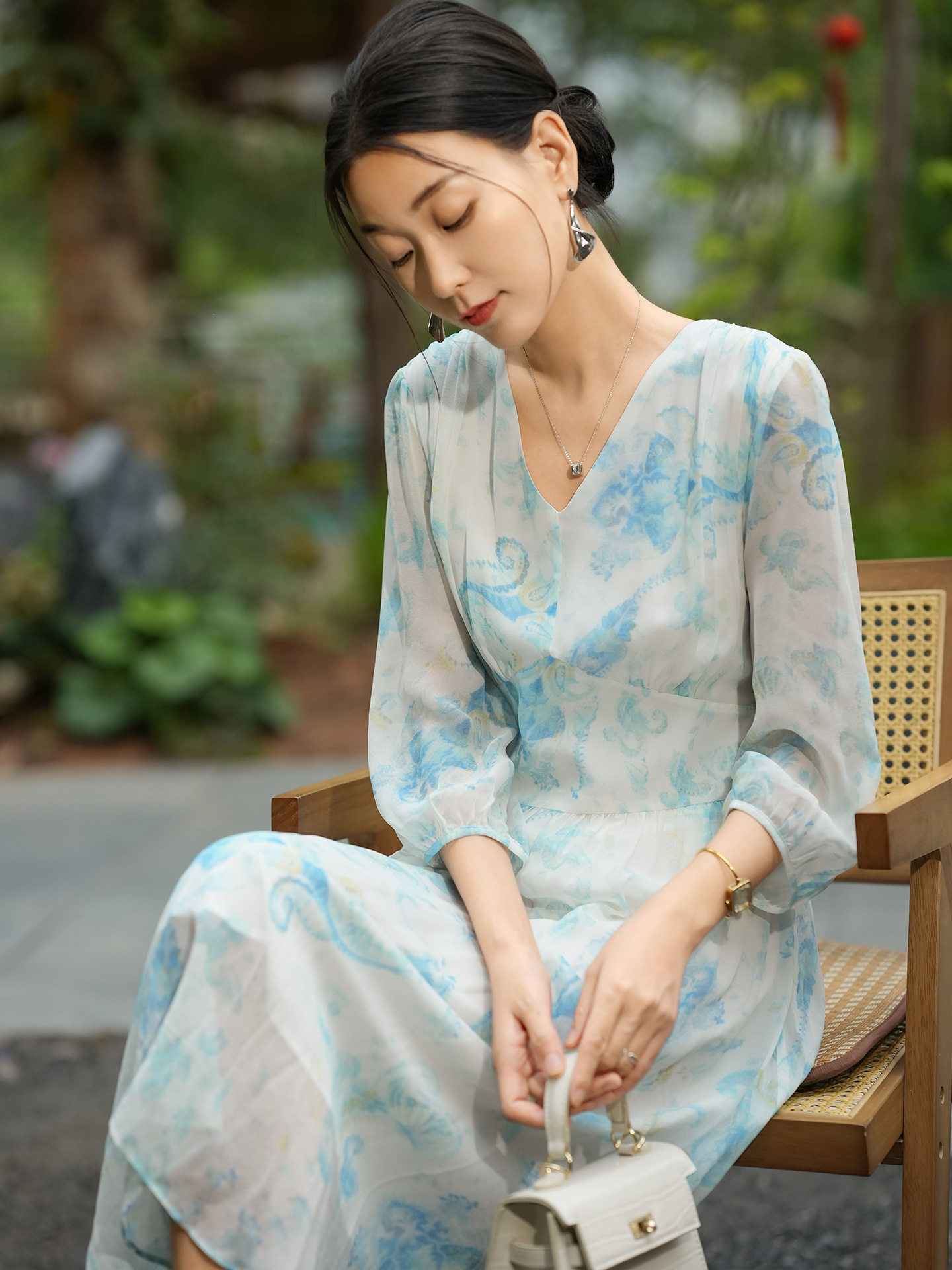 「自」全新升级【铂金会员514/天猫699/差价185】(22207)洛诗琳气质度假风真丝印花连衣裙2026新款修身V领收腰茶歇裙