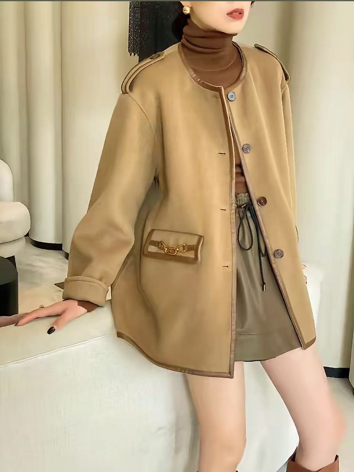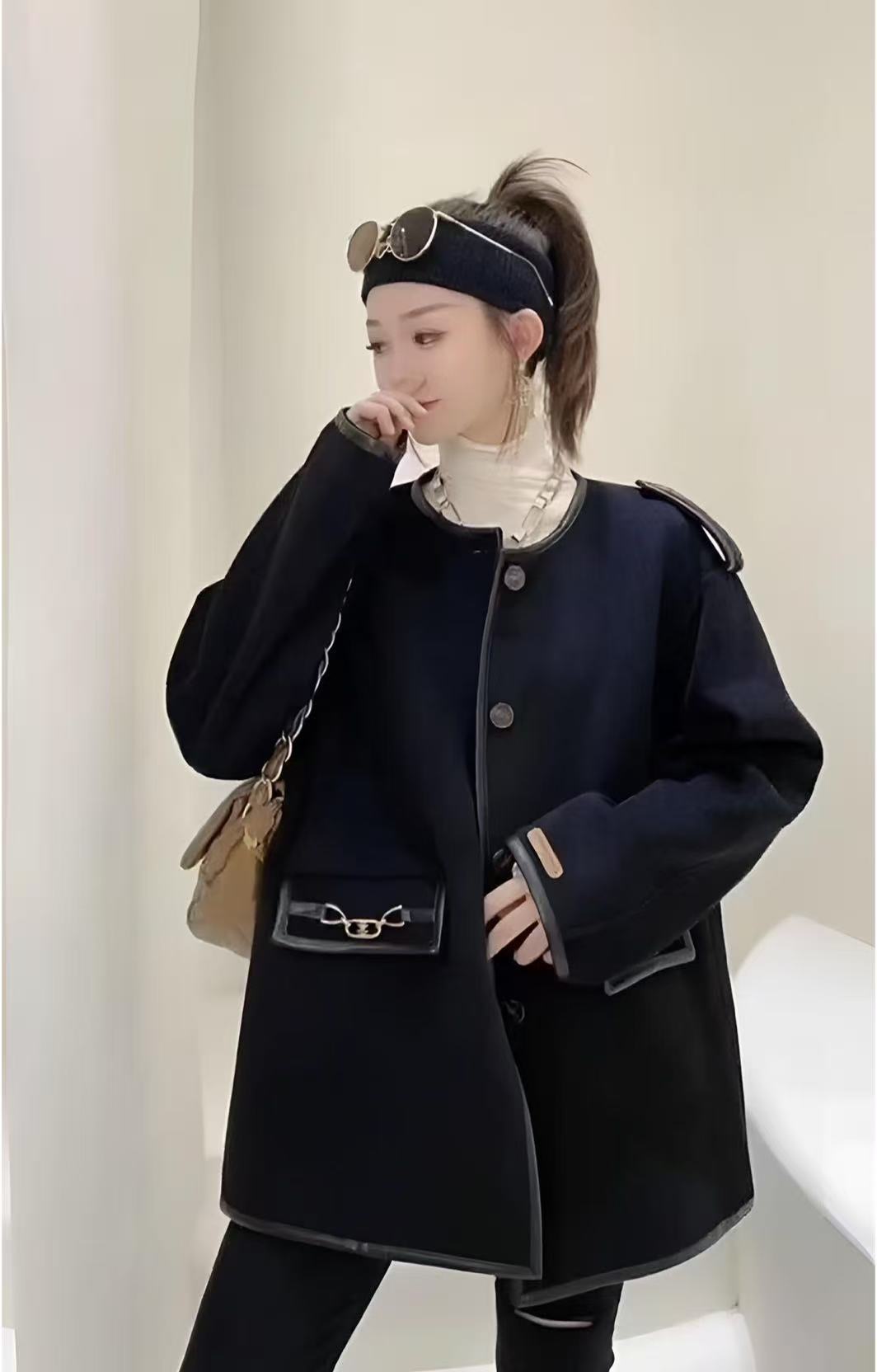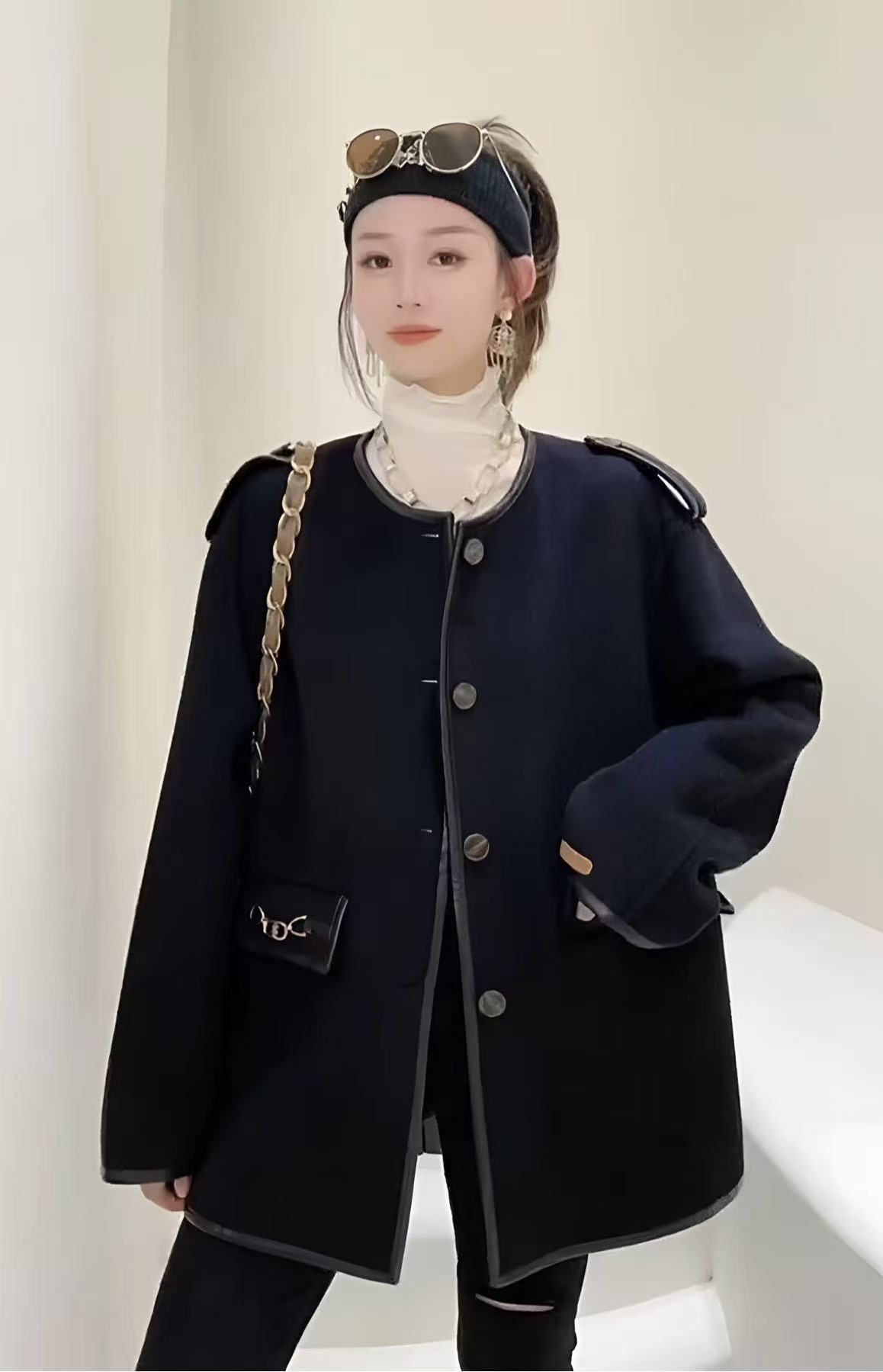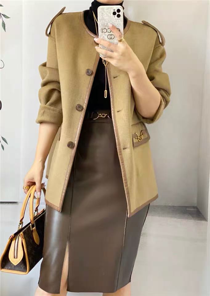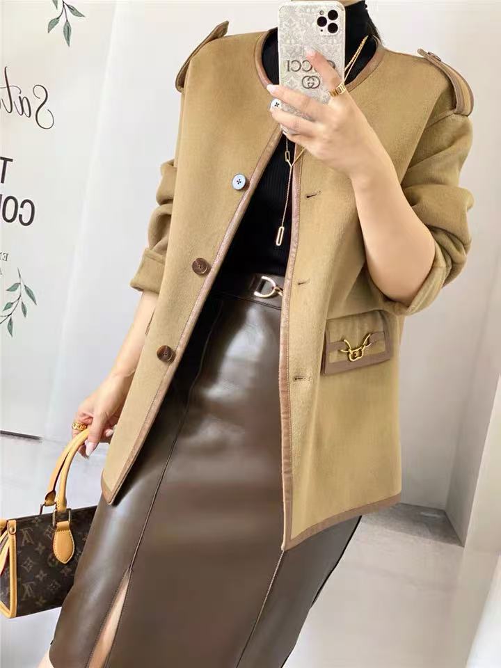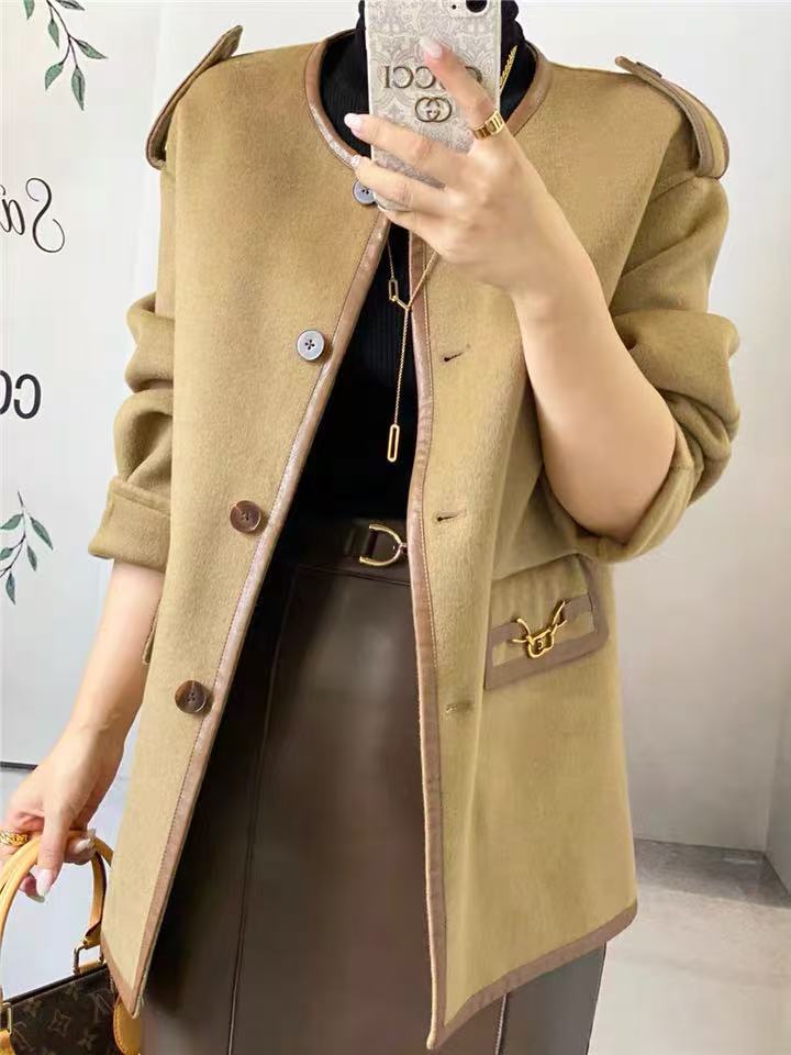 12.12错过没有!清货不退【高端系列】手工定制1389款10%羊绒➕90%澳毛拼皮包边英伦风双面尼大衣-喜出