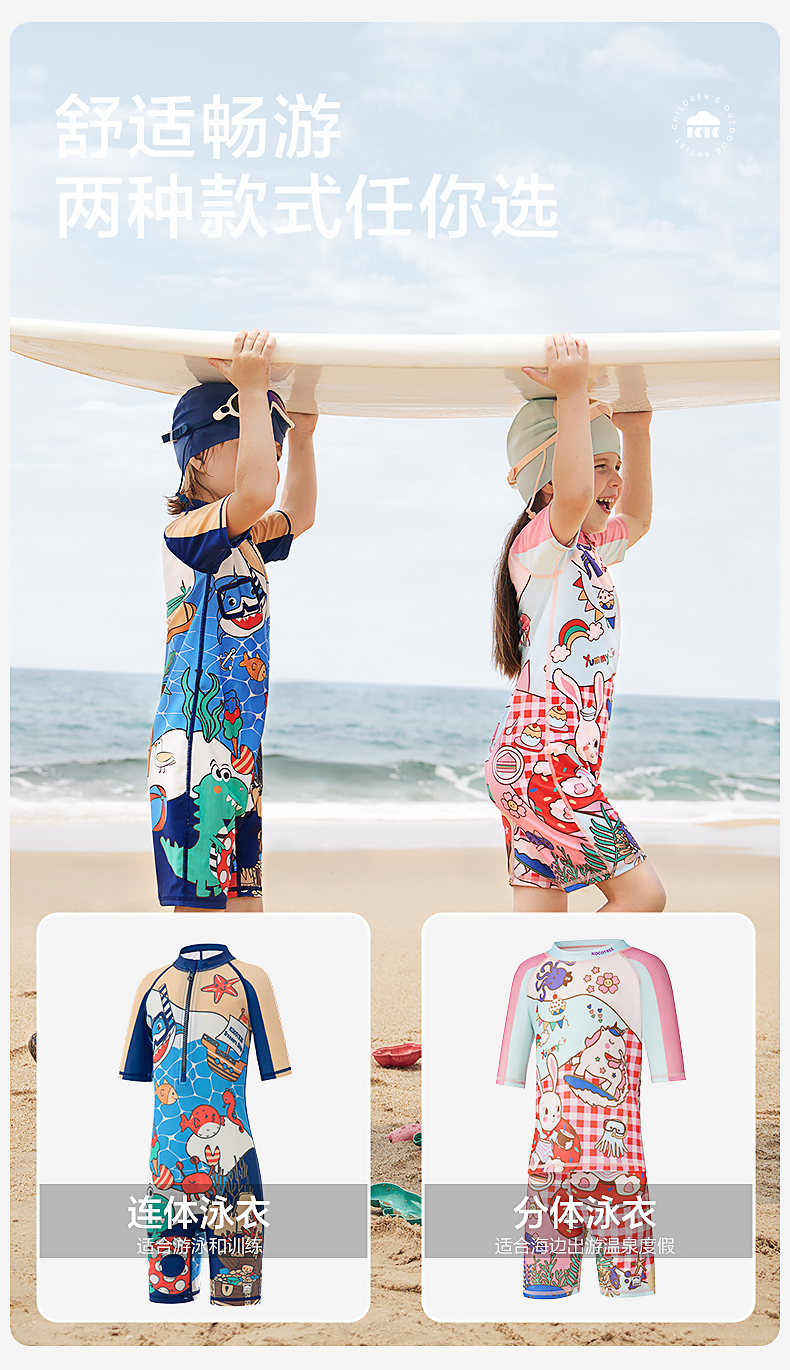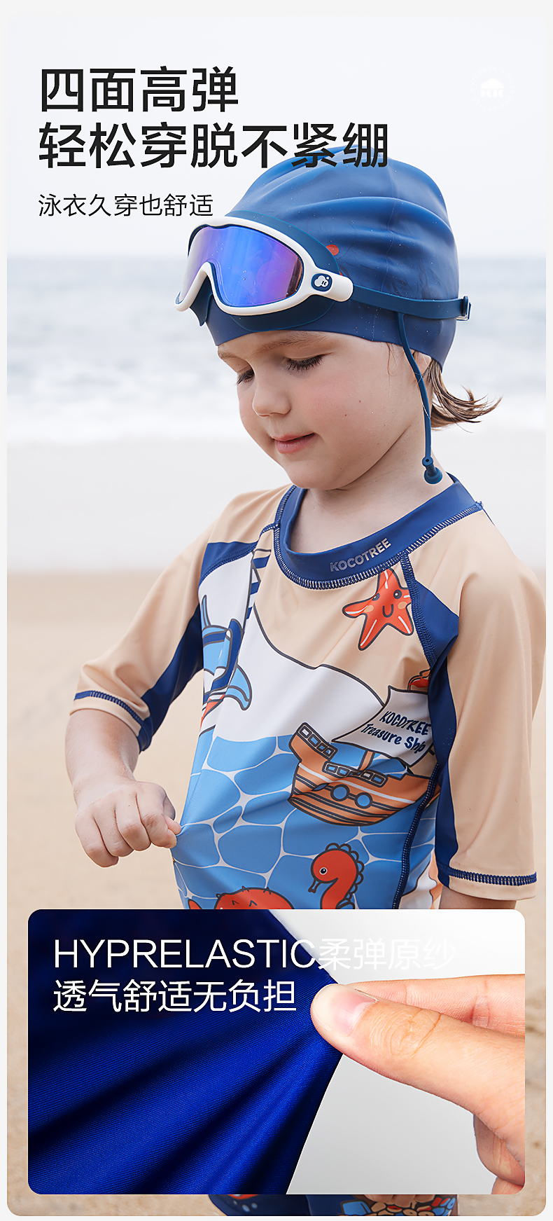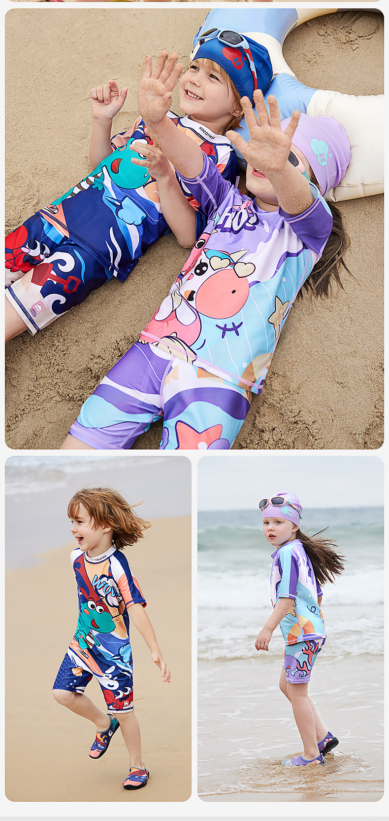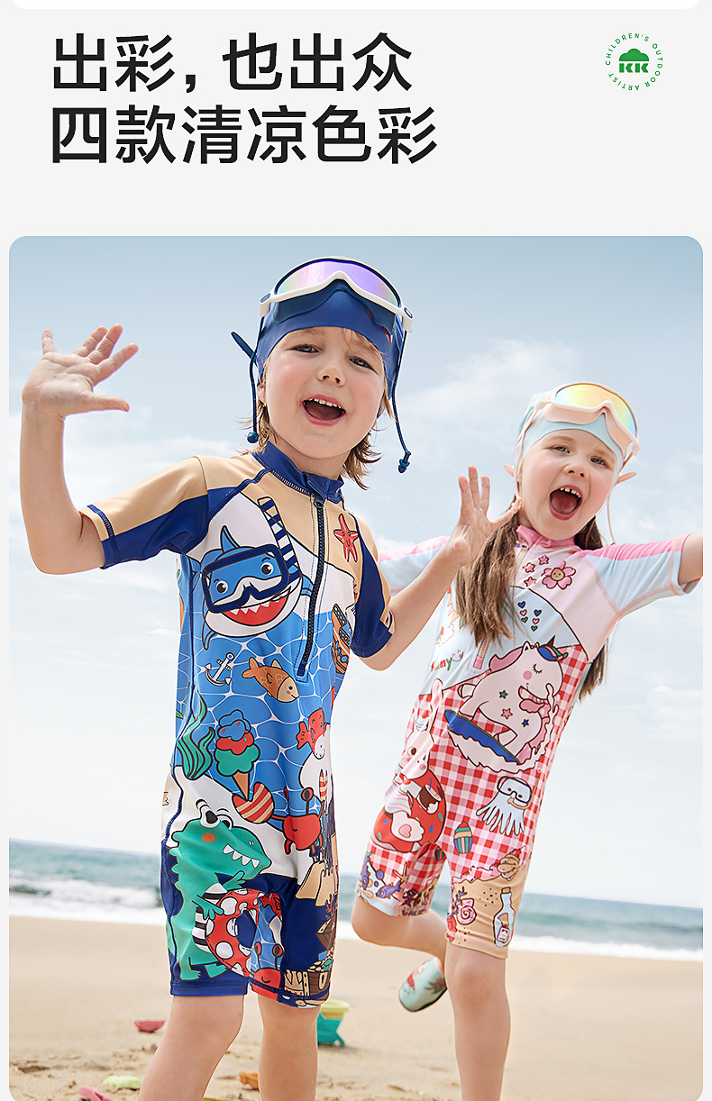 KK树儿童泳衣抗氯男童女孩分连体游泳衣防晒时尚印花大童泳装海滨微风短袖分体泳衣