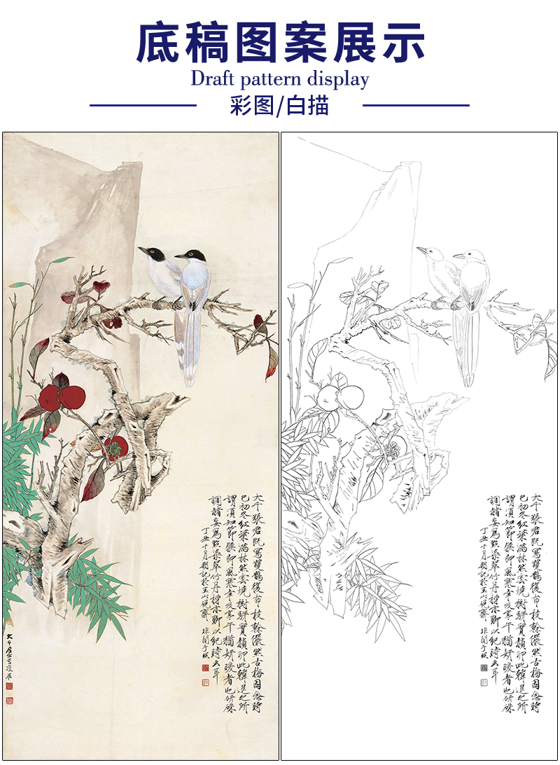 于非闇花鸟工笔画白描底稿《秋英双雀》临摹勾线高清打印稿HS38