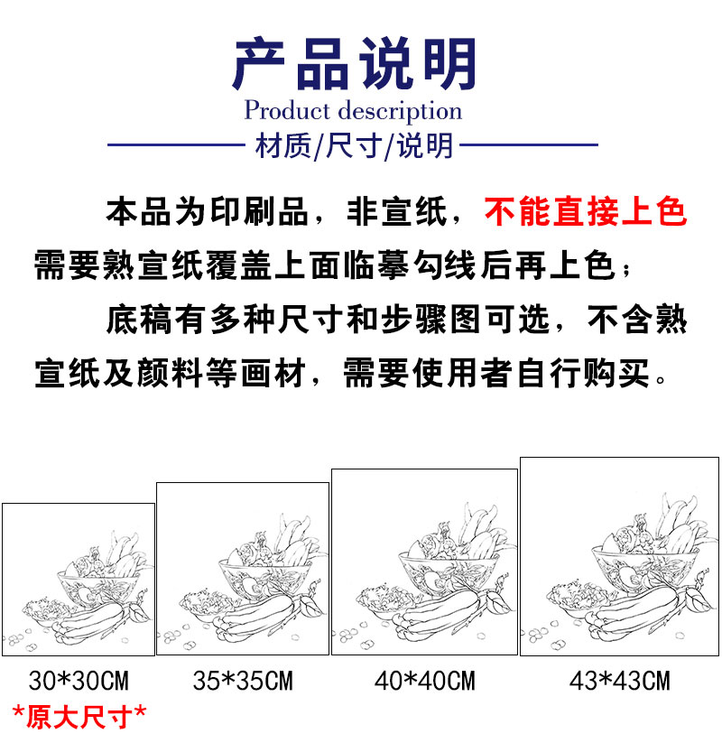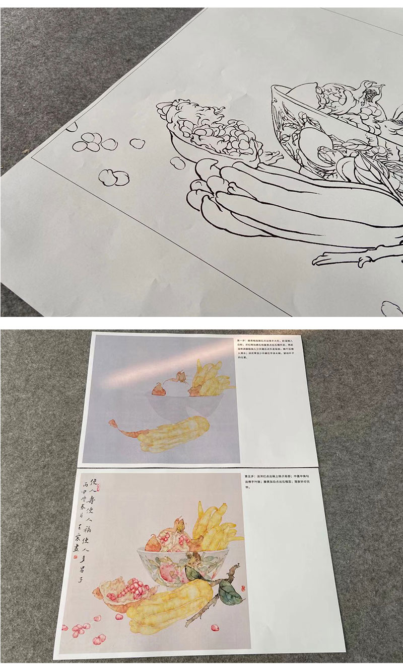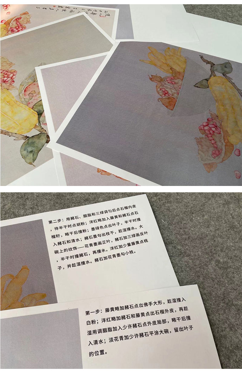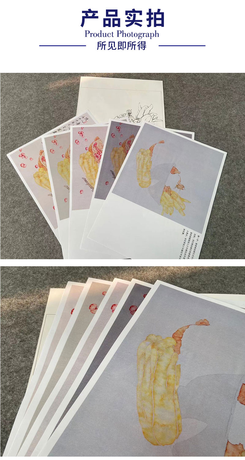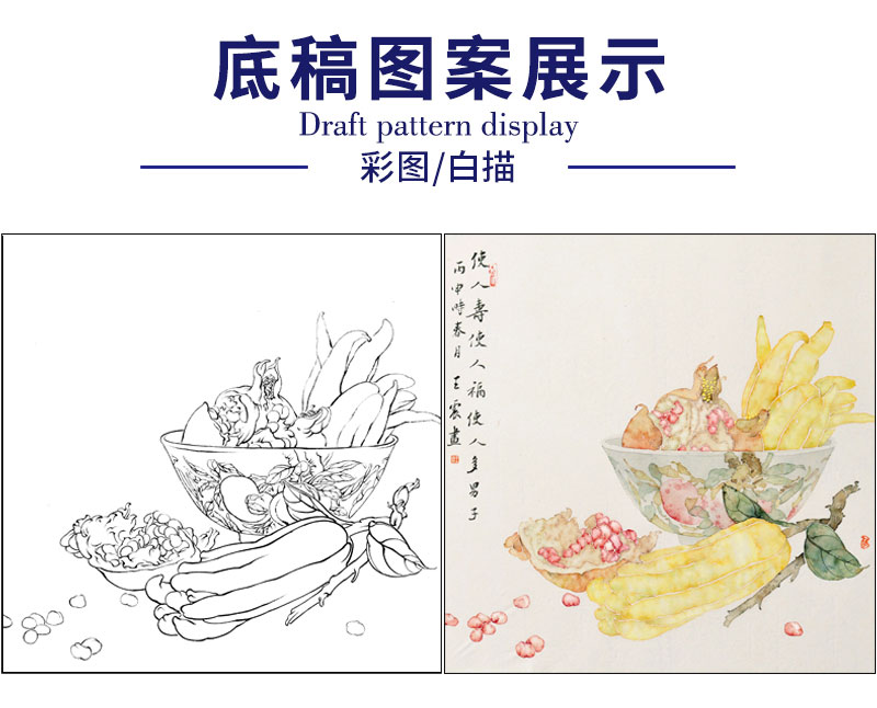 【有步骤】王震工笔画白描底稿斗方小品《佛寿三多》佛手石榴初学者临摹花鸟线稿WZ20
