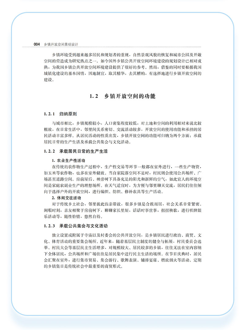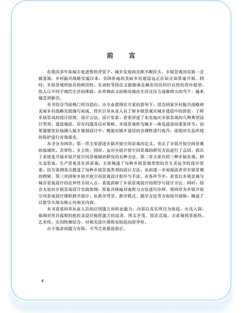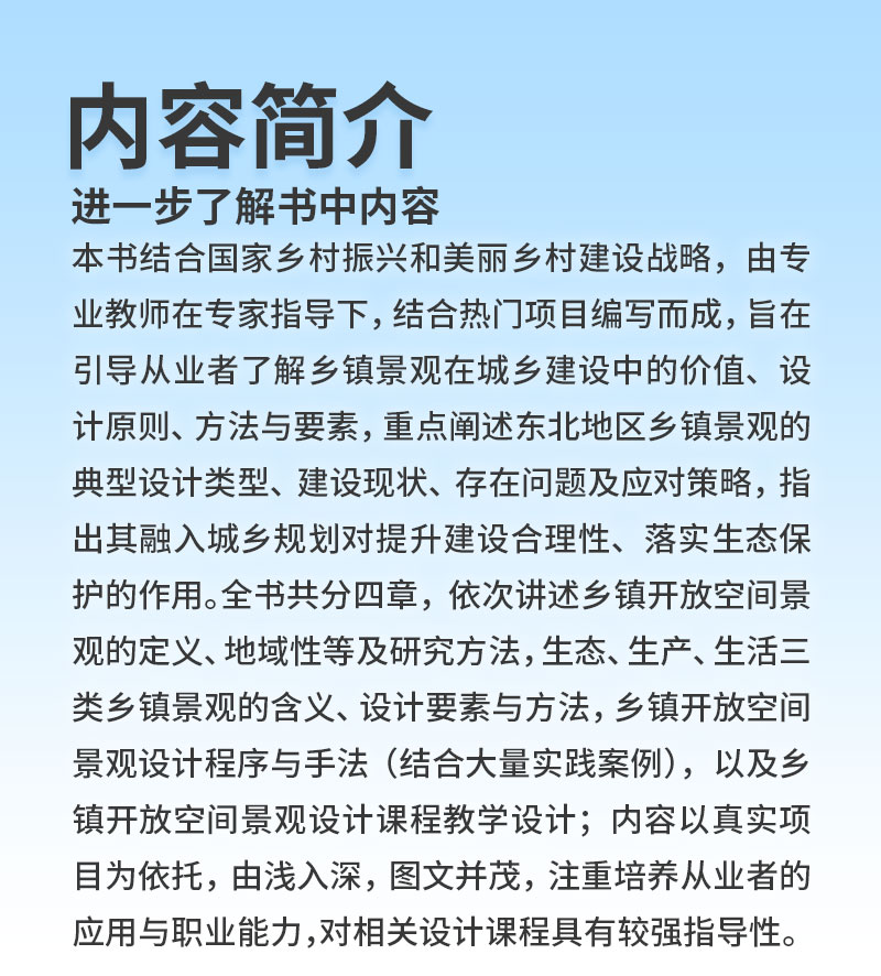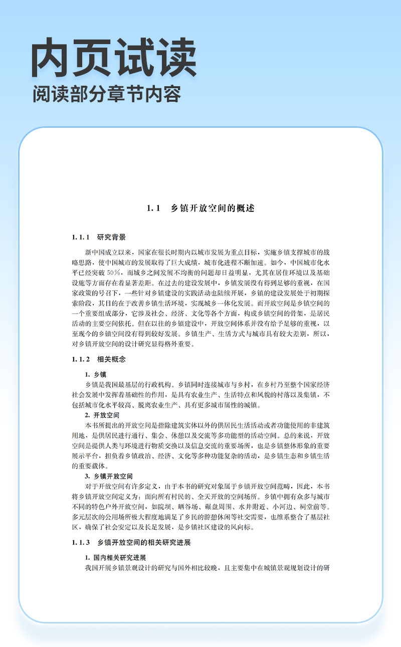 《乡镇公园规划设计》全书以乡镇公园规划设计为研究对象,共分为五章,分别从公园规划设计的理论与方法、乡镇公园设计流程、乡镇公园规划设计典型空间类型、案例精选、结语几个方面阐述,是学生学习本门课程时得到方法与操作流程的指导。 本教材以国家新工科建设为理念原则,以乡镇建设产业学院为依托,力求对传统公园规划设计教材的内容结构做出较大取舍,删除过多的纯理论阐述,用简练的文字阐述核心概念,突出最实用、最具操作性的职业流程指导,精选典型案例印证说明重要理论,解决学生设计课程中的实际操作问题。