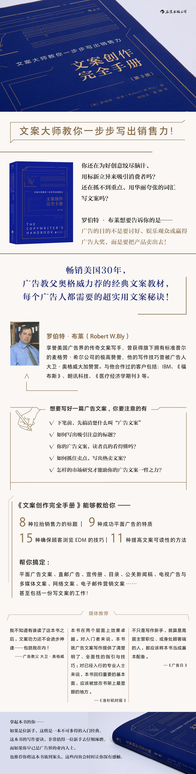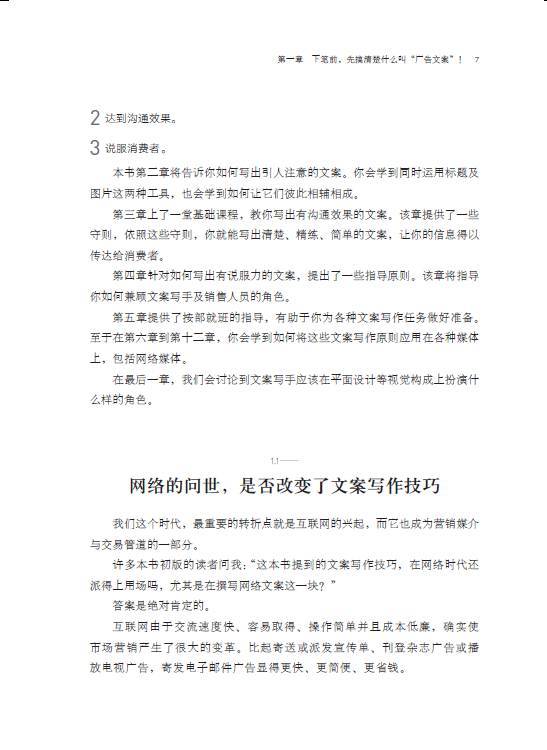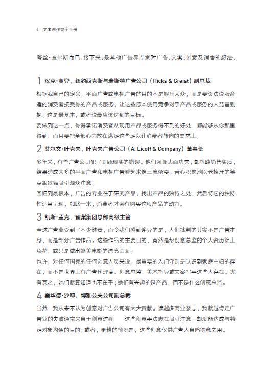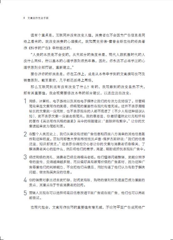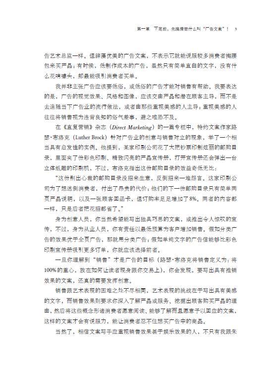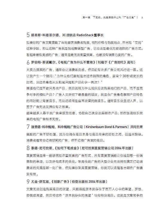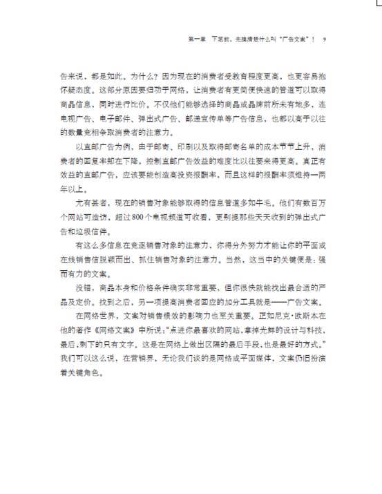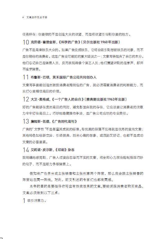 •拿起本书的你,如果是位新手,这将是一本不可多得的入门经典。这本书的写作要诀,非常值得一位新手去仔细琢磨。而如果你是广告业的资深人士,也推荐你将这本书放到案头,这些内容会时时让你深有感触。